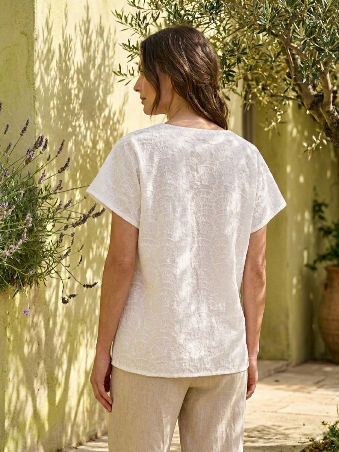 Легкая женская блуза прямого кроя из непрозрачного хлопкового шитья немецкого бренда Broadway NYC Fashion.