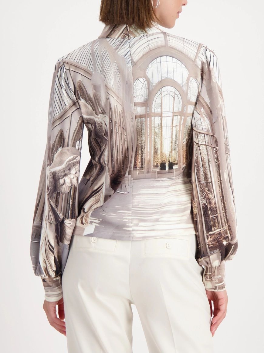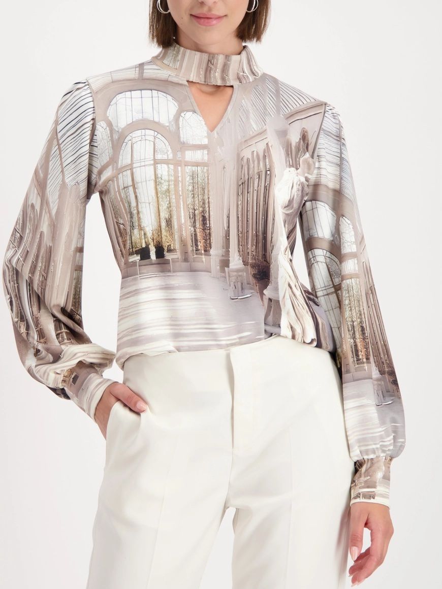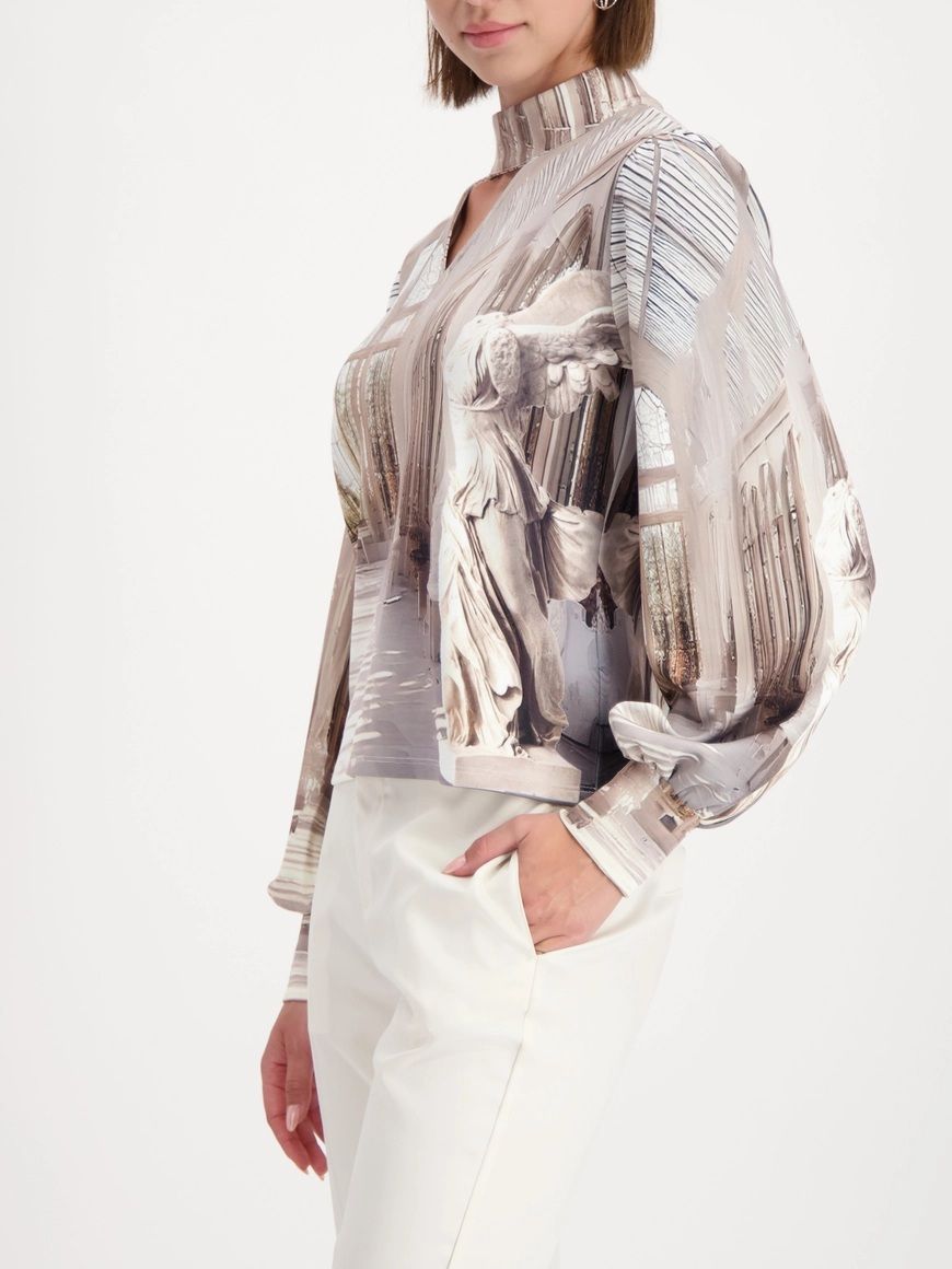 Стильная блузка из эластичного модала с галерейным принтом и вырезами — современная и уникальная.
