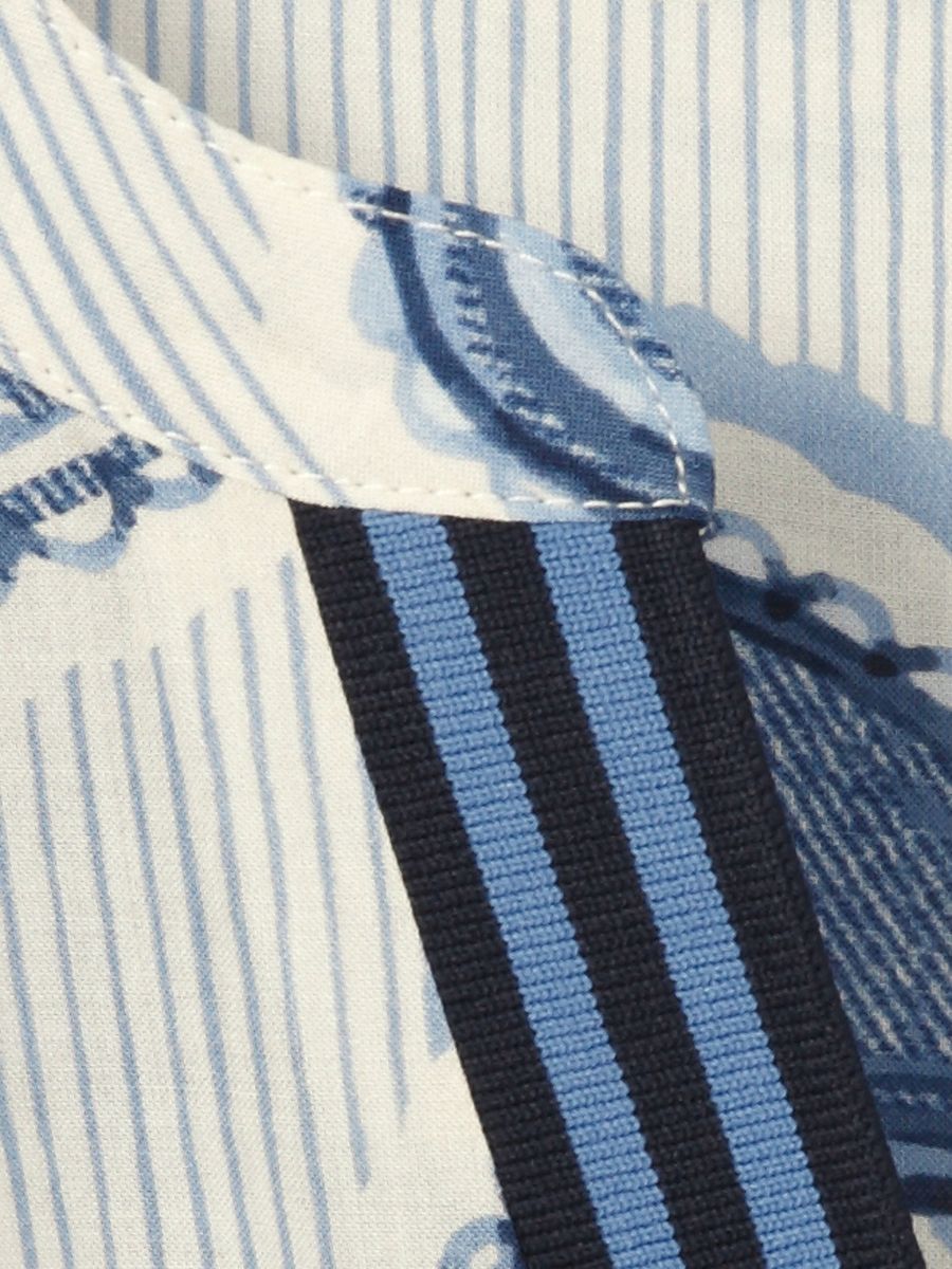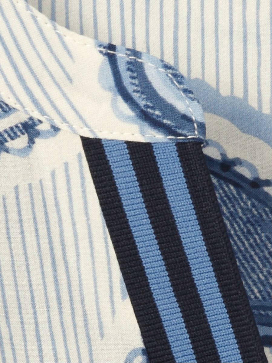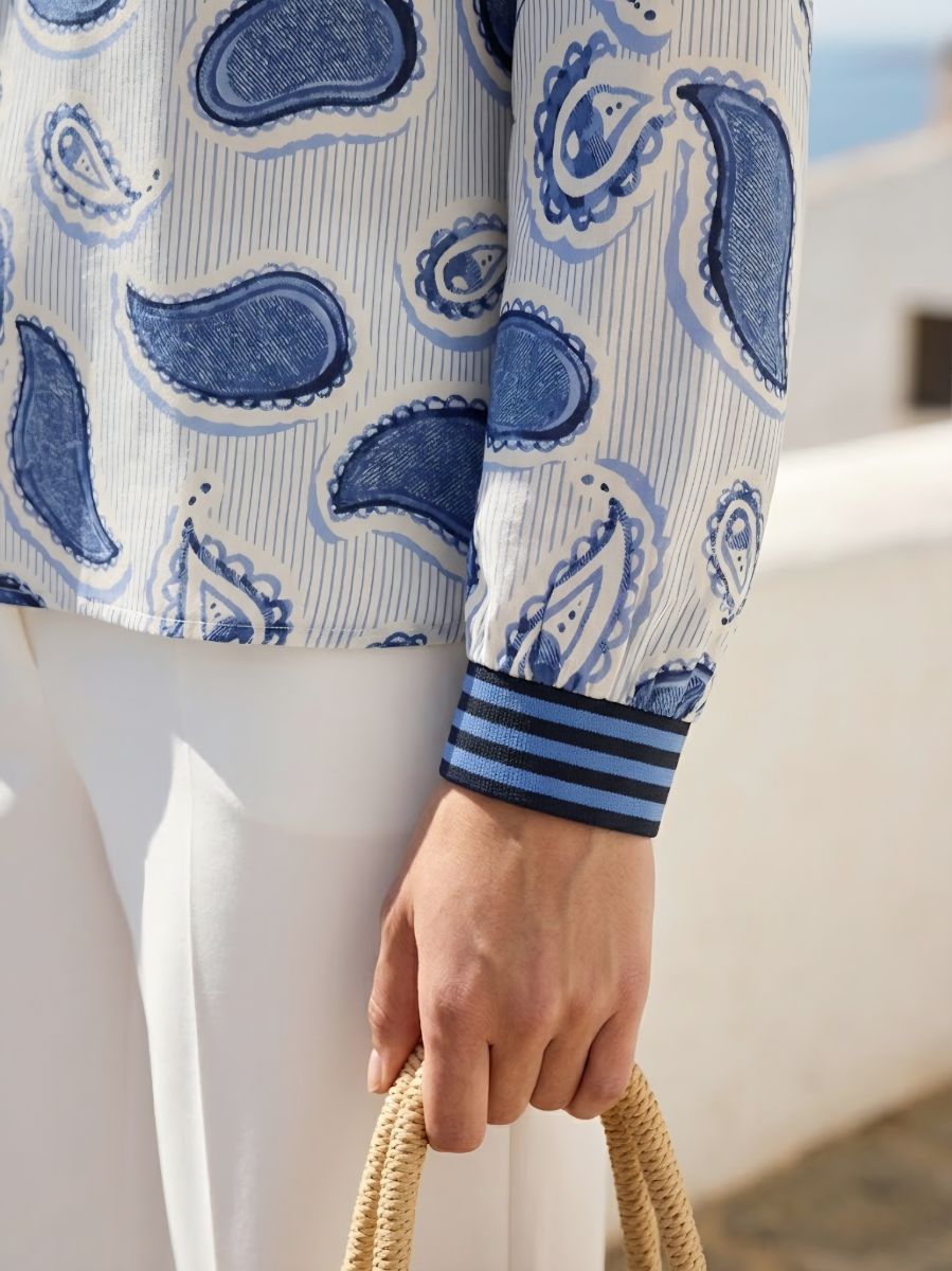 Блузка с V-образным вырезом и изящной отделкой в полоску темно-синего и кобальтово-синего цветов.