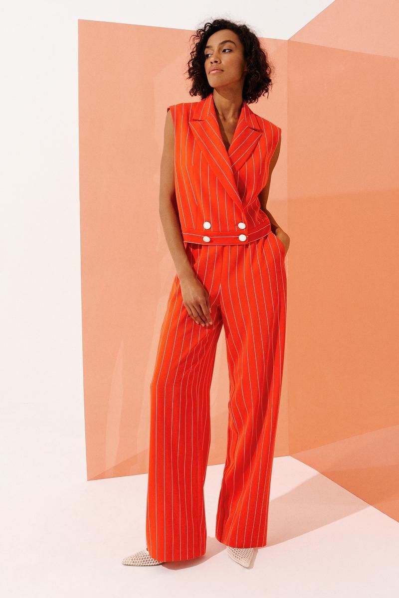 Брюки женские широкого кроя яркого красно-оранжевого цвета в мелкую бежевую полоску Noche Mio.