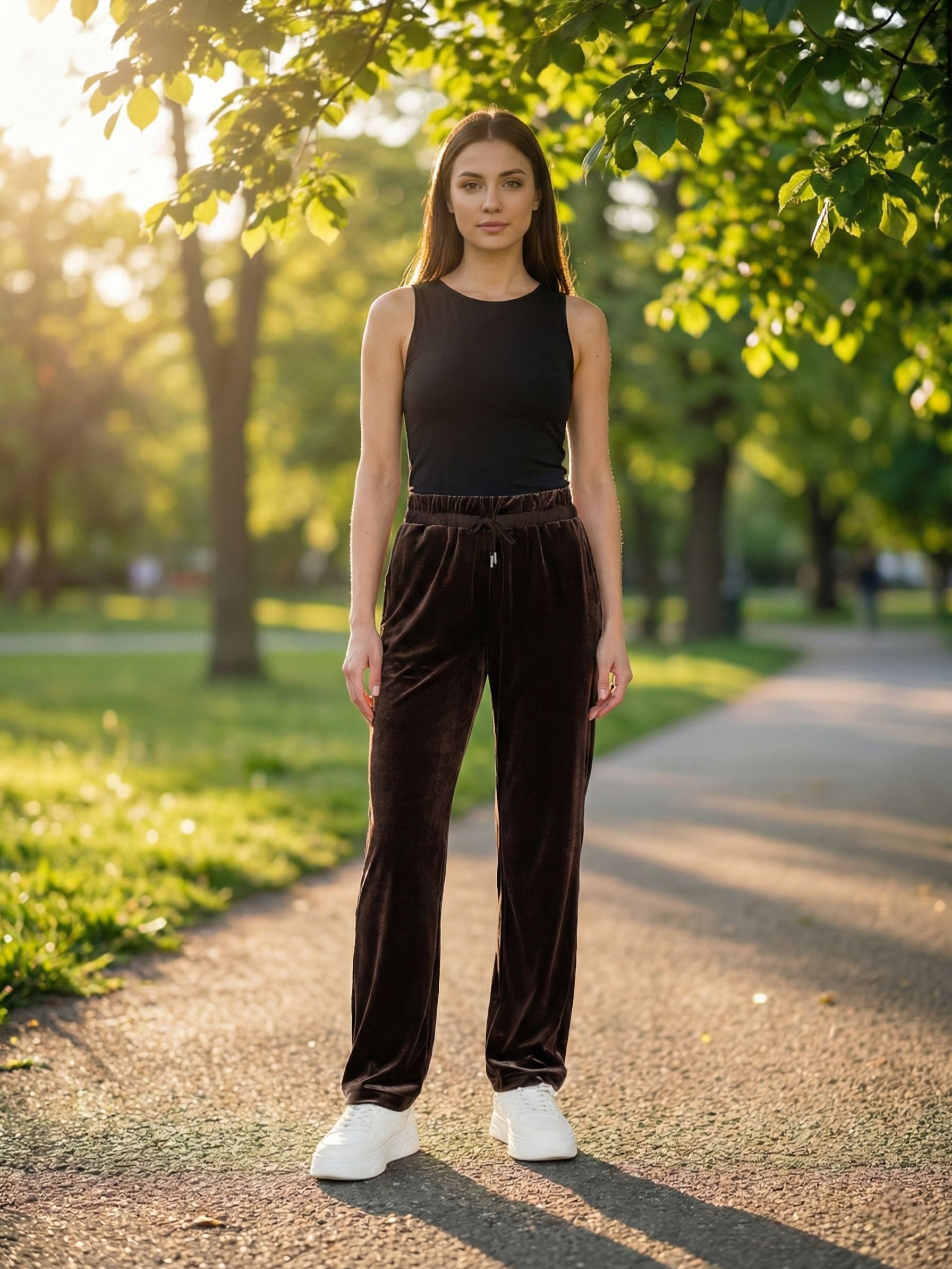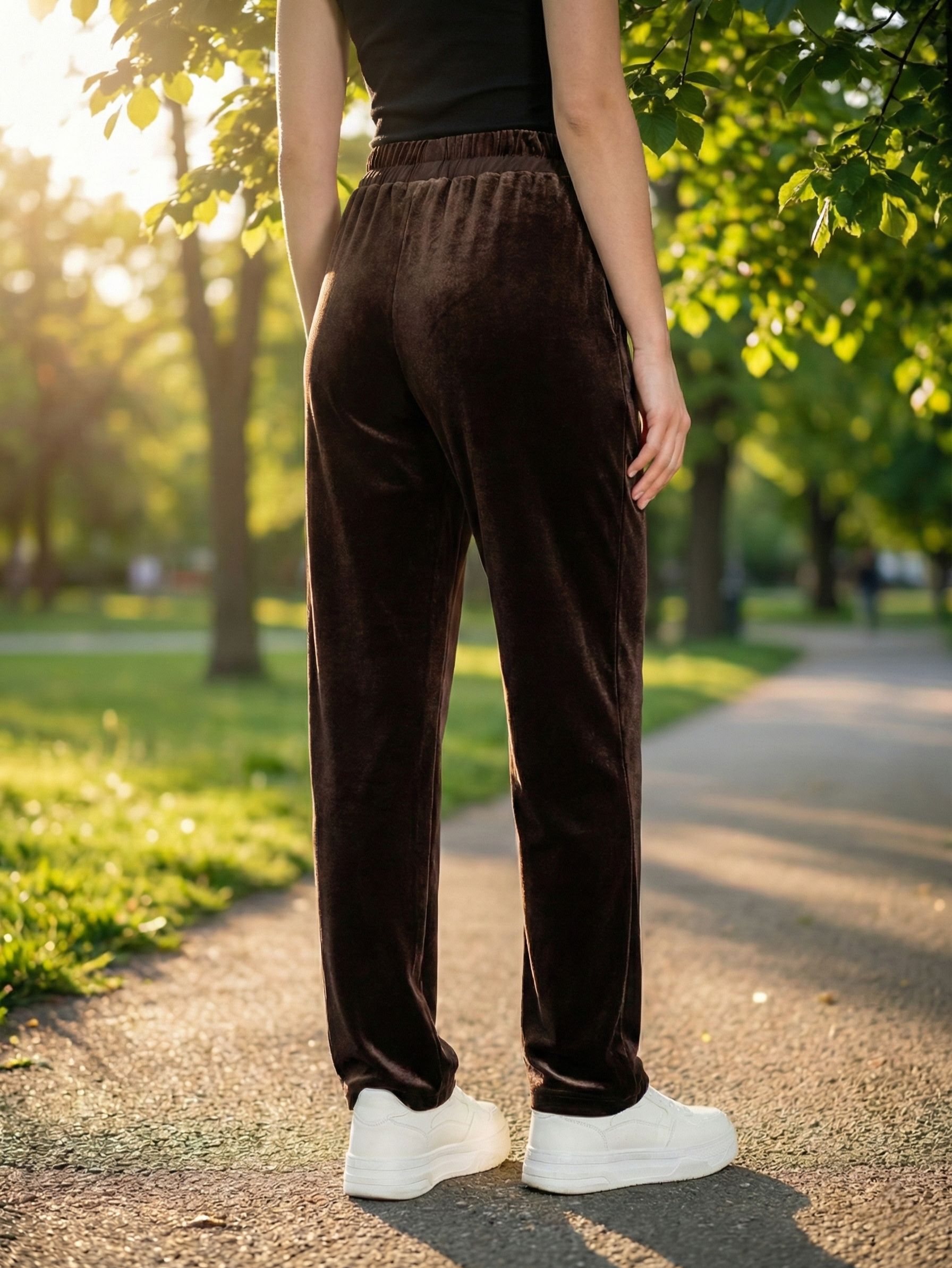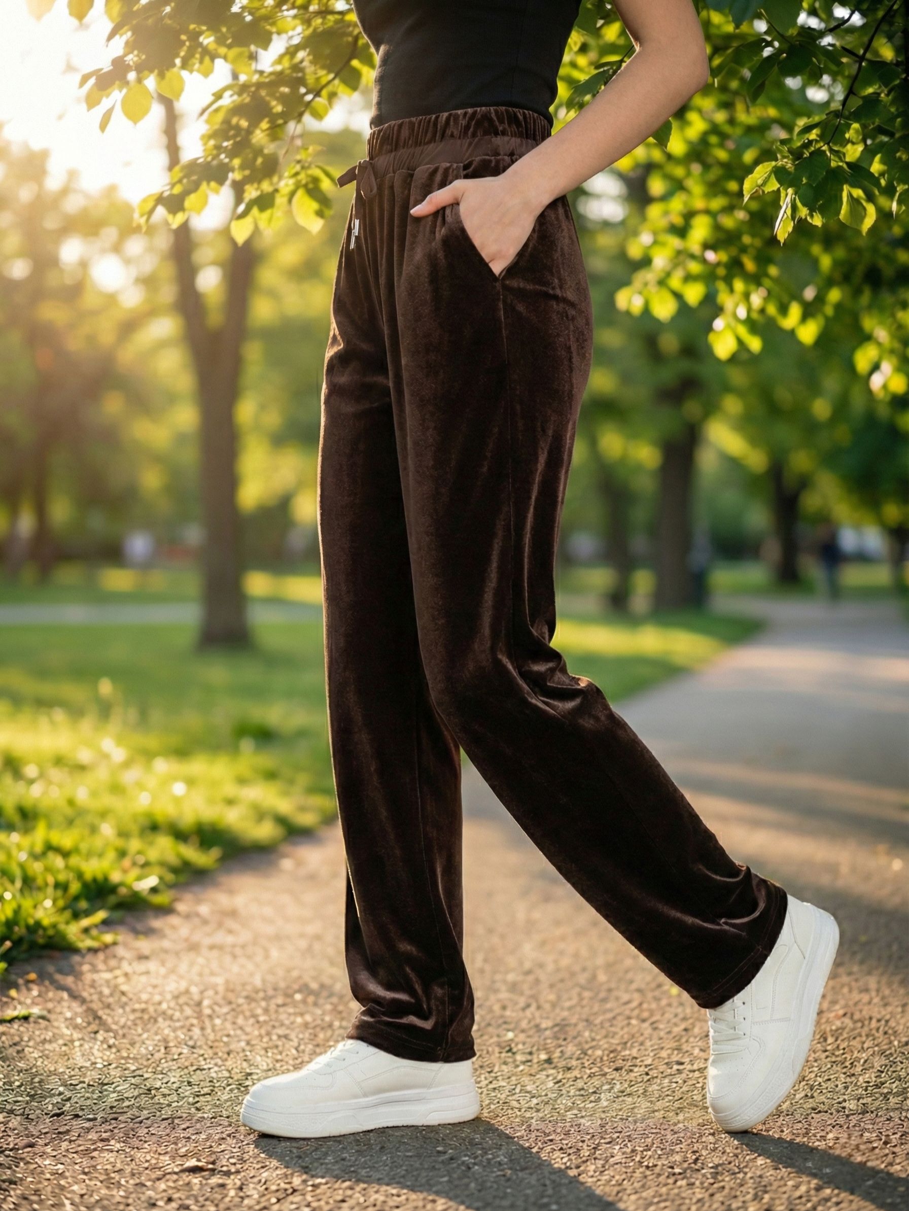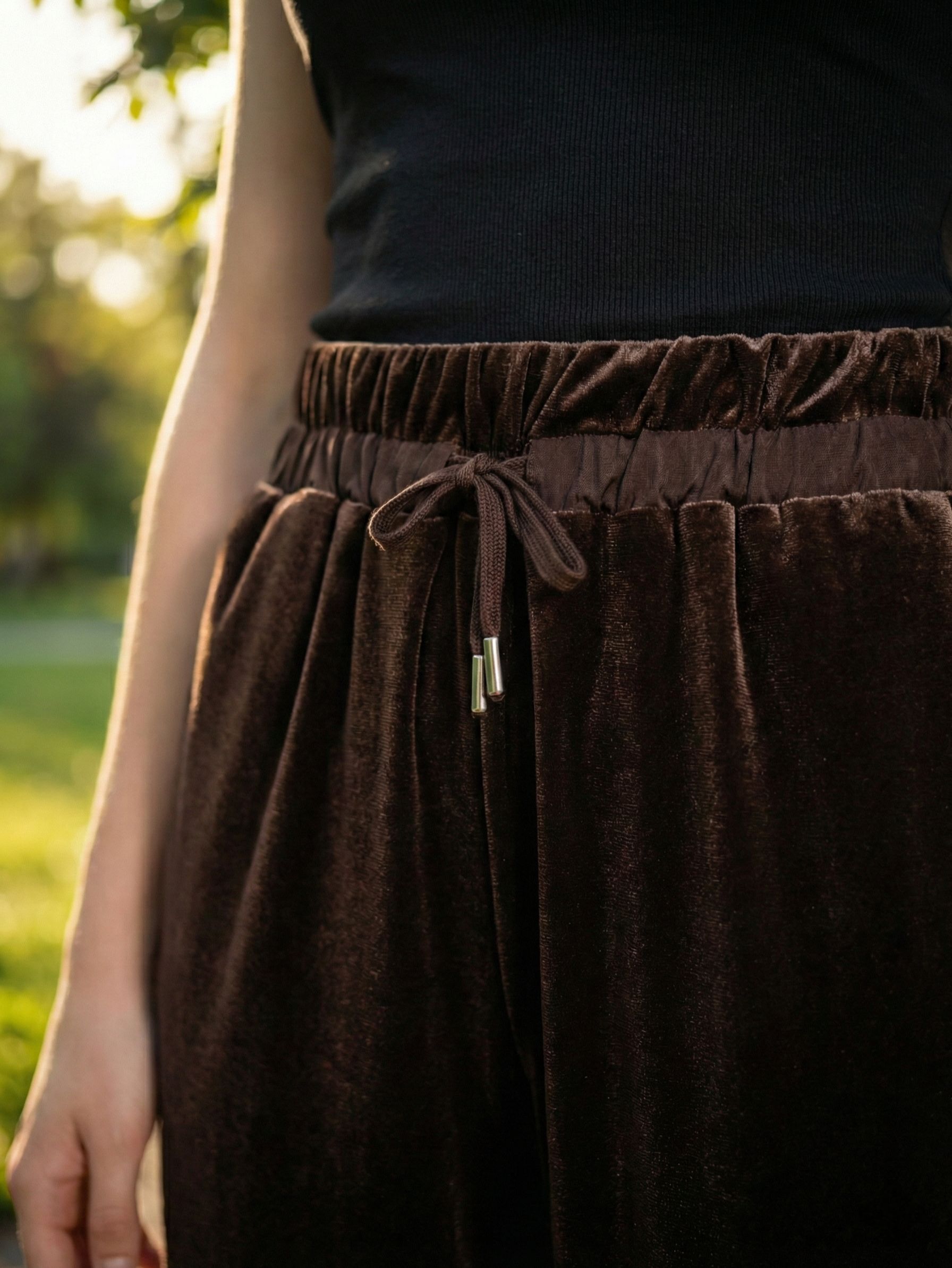 Женские трикотажные бархатные брюки прямого кроя на широком поясе-резинке с завязками итальянского бренда Franco Vello.