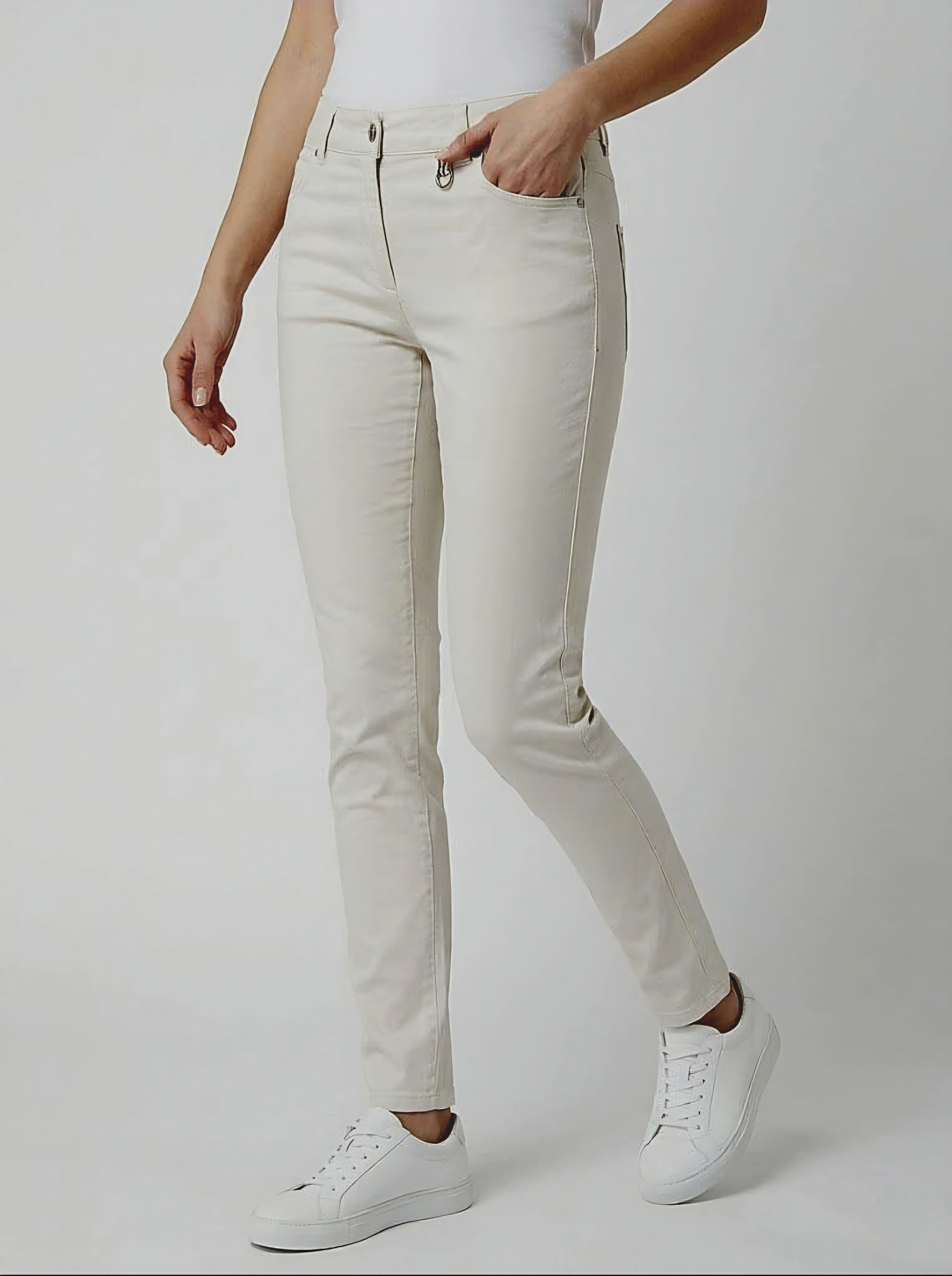 У модели прямой «пятикарманный» крой, притачной пояс со шлевками для ремня, застежка на крючок и молнию.