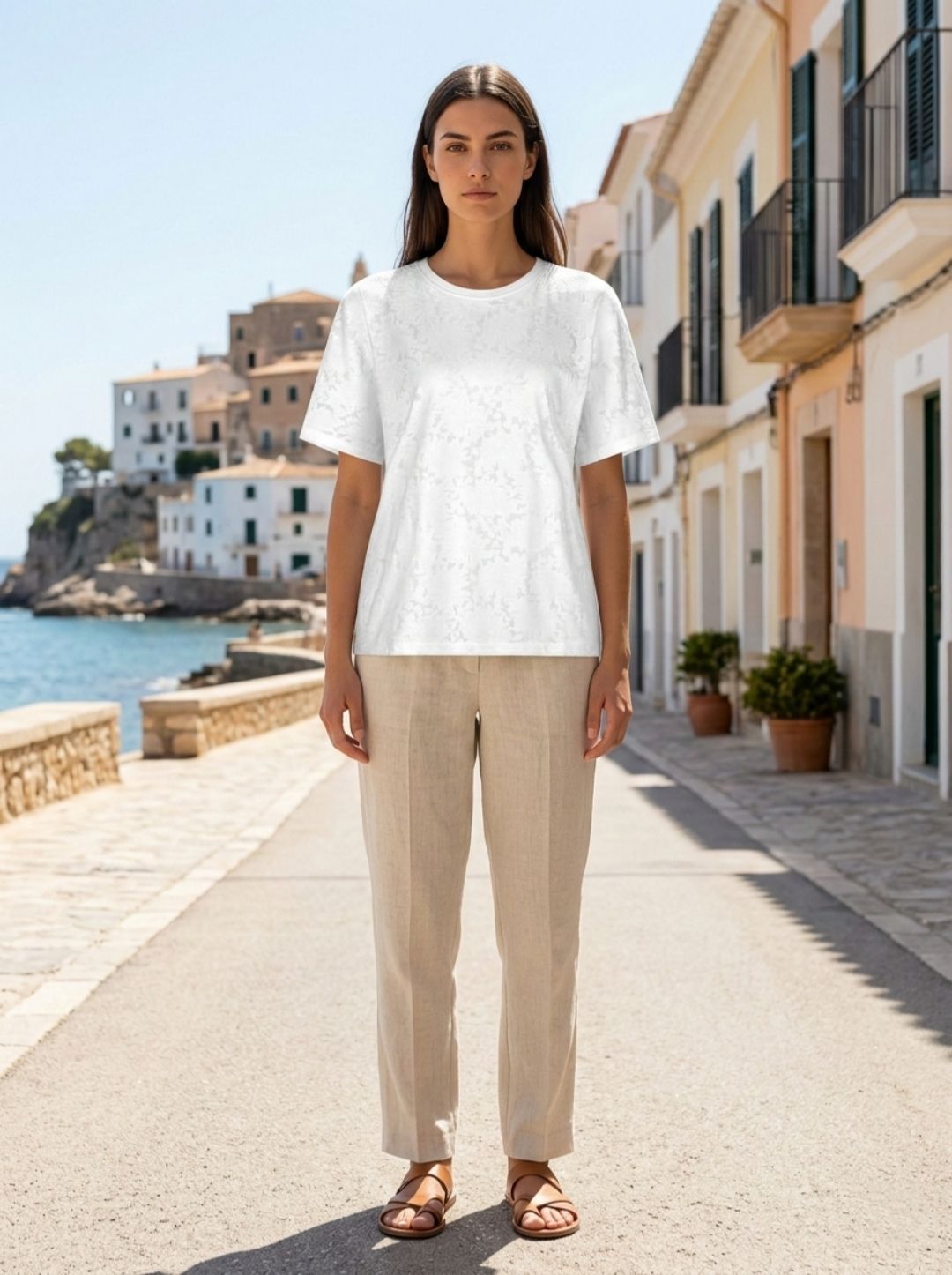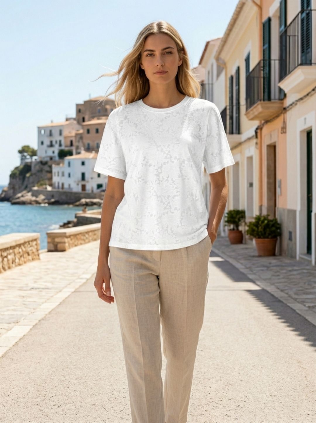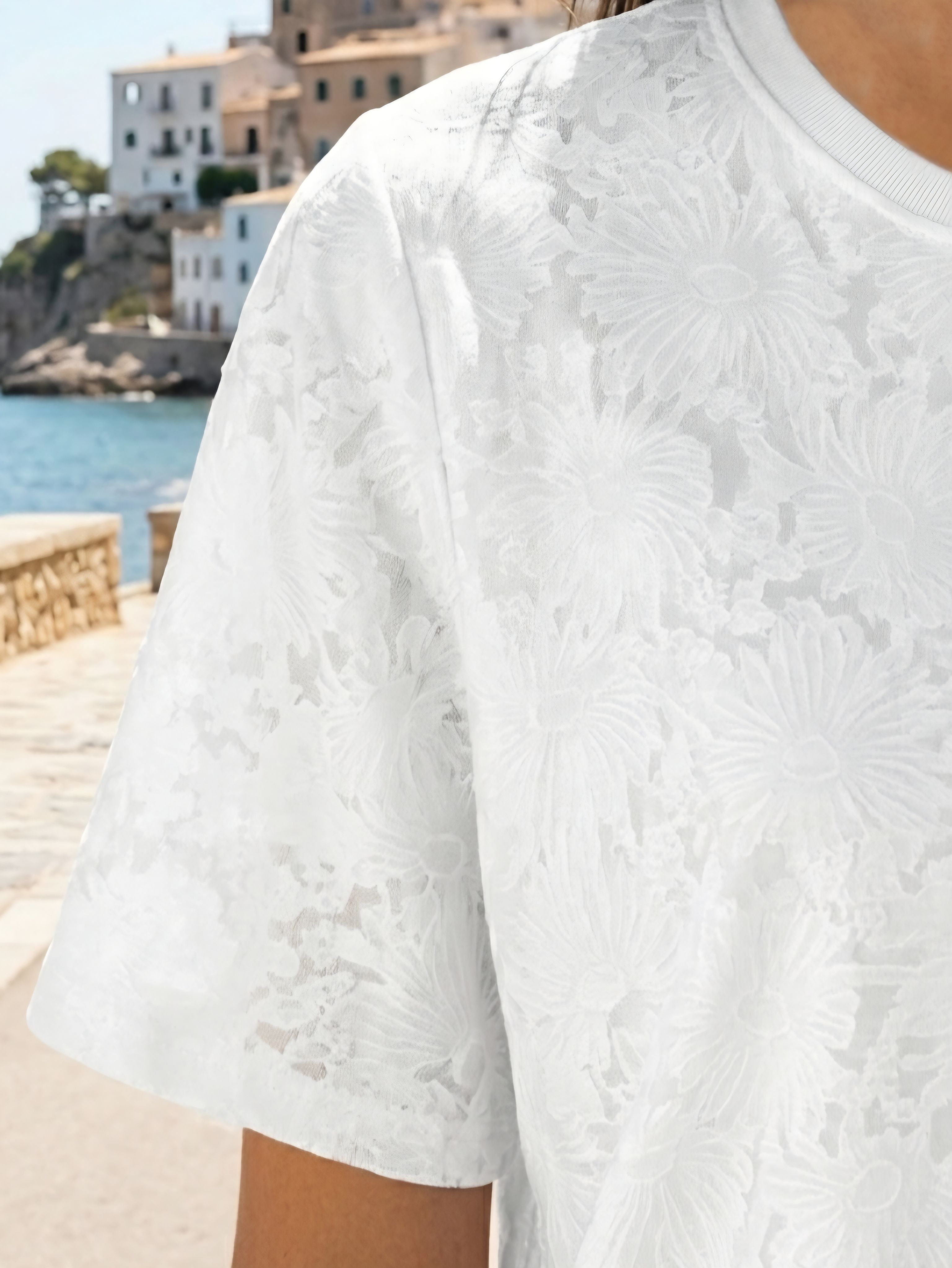 Футболка женская с однотонным ажурным флористичеким принтом на передней части изделия немецкого бренда Broadway NYC Fashion.