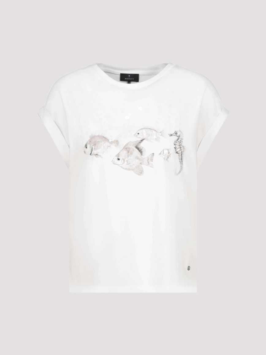 Эта футболка немецкого бренда Monari с изображением рыбок изготовлена из 100% хлопка и украшена сверкающими блёстками.