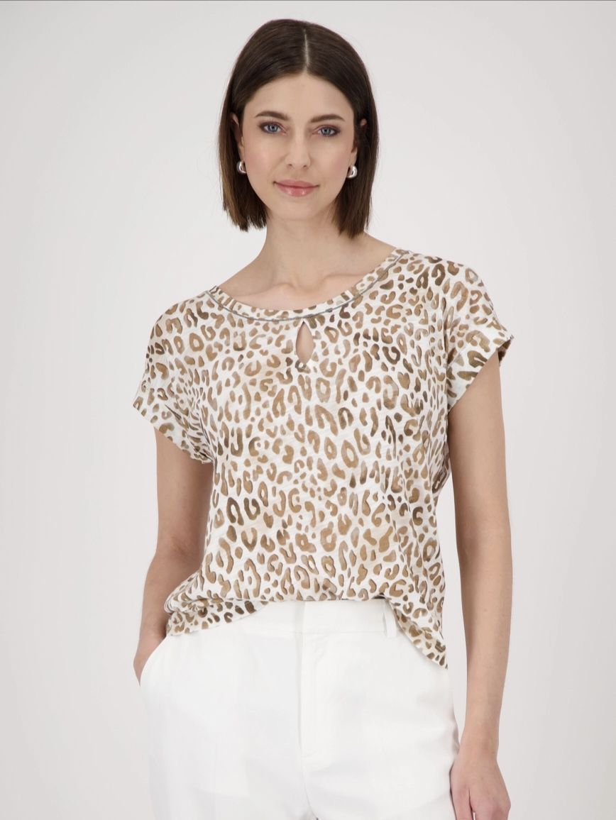 Футболка с вырезом немецкого бренда Monari выполнена из хлопка и модала и украшена леопардовым принтом по всей поверхности.
