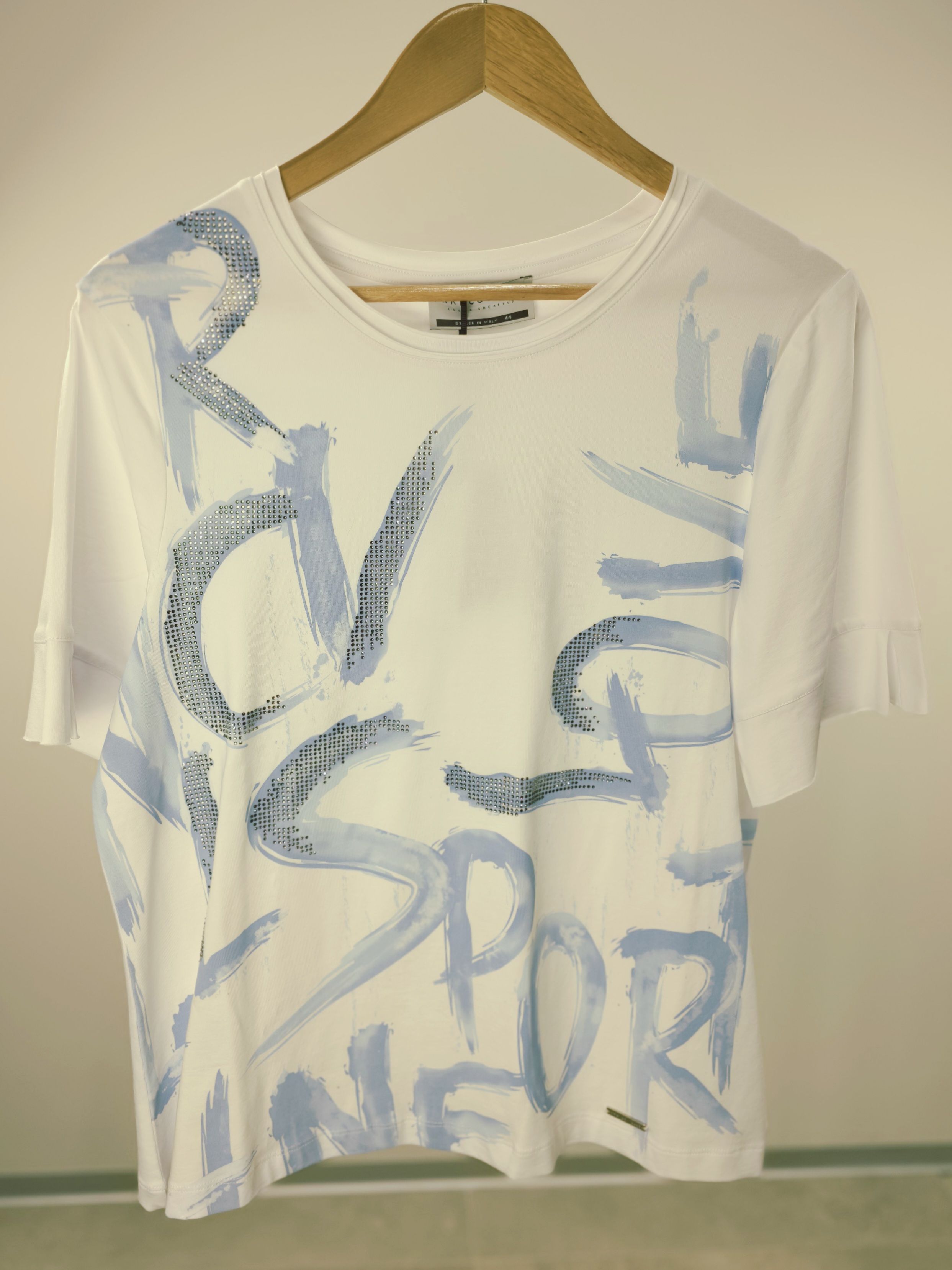 Футболка (джемпер) женская трикотажная с текстовым принтом и стразами итальянского бренда Franco Vello.