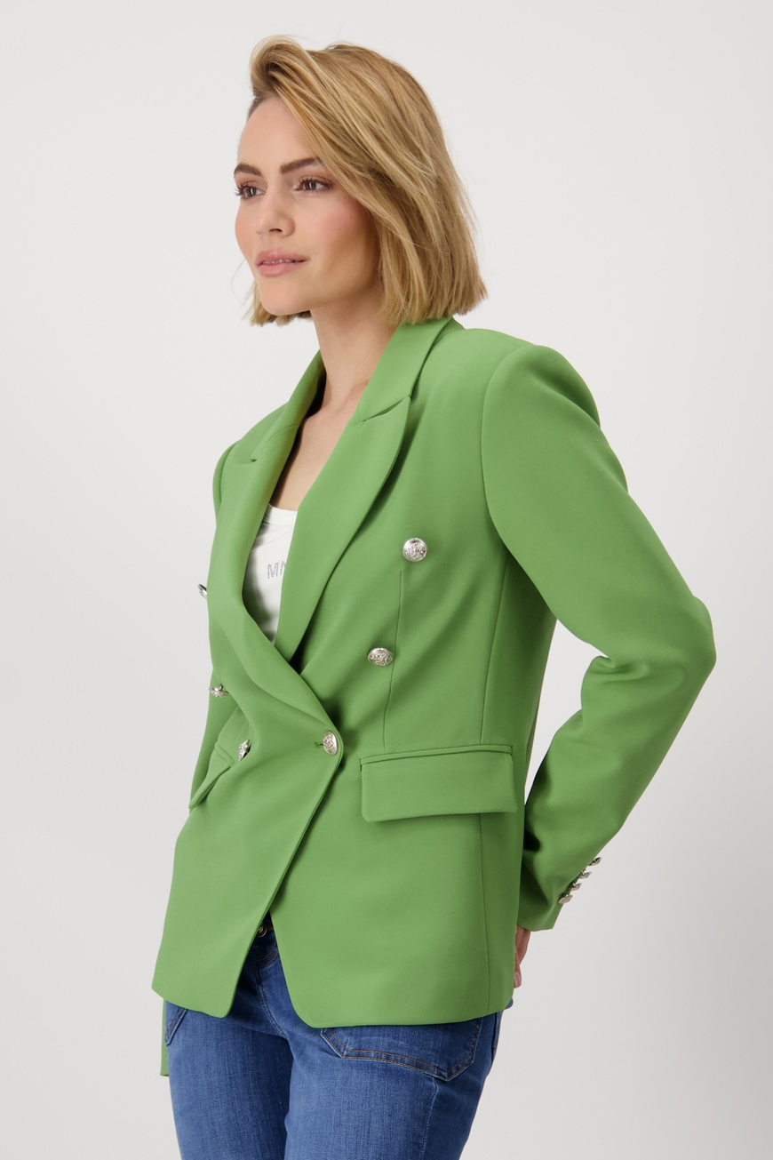 Жакет двубортный женский с воротником-лацканом из коллекции весна-лето 2025 немецкого бренда Monari отличается элегантным внешним видом и двубортной планкой на пуговицах с декоративными пуговицами.