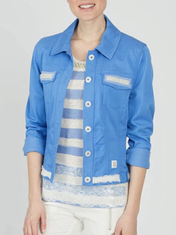 Жакет женский ярко-голубого цвета с полосами на спине и аппликацией в виде морской звезды из страз под "жемчуг" австрийского бренда Sportalm.