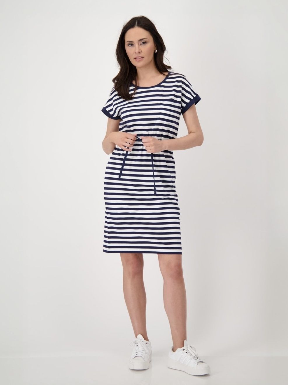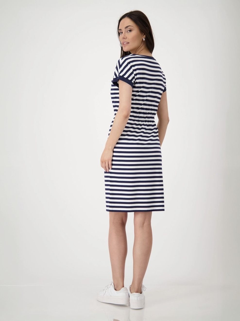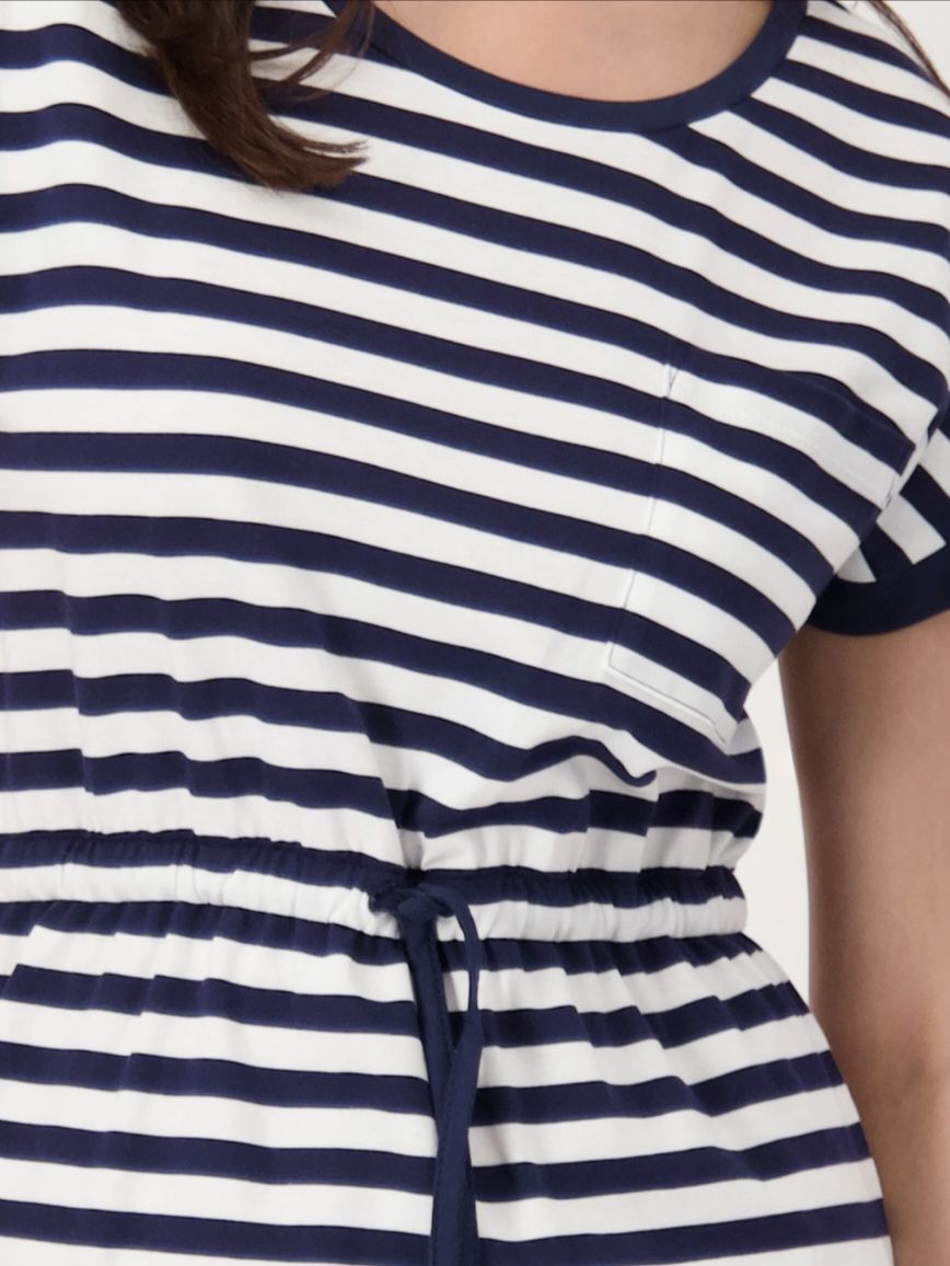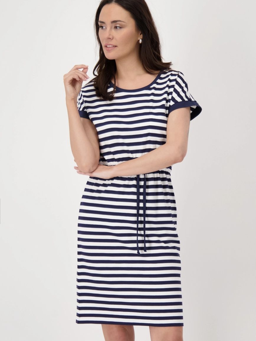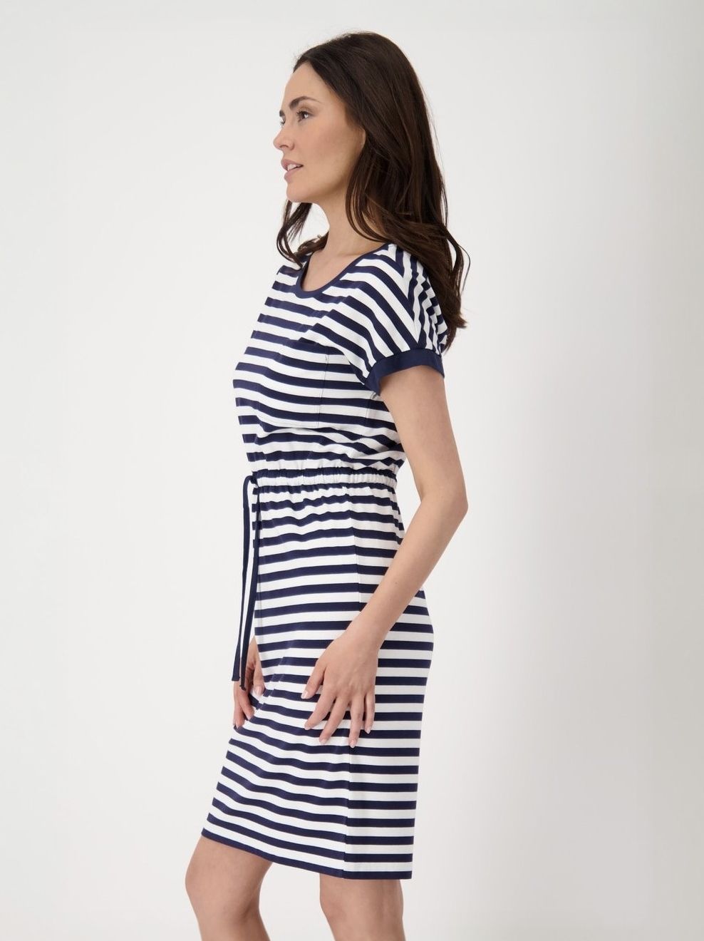 Это платье в полоску из хлопка и модала немецкого бренда Monari впечатляет благодаря нагрудному карману и поясу-завязке.