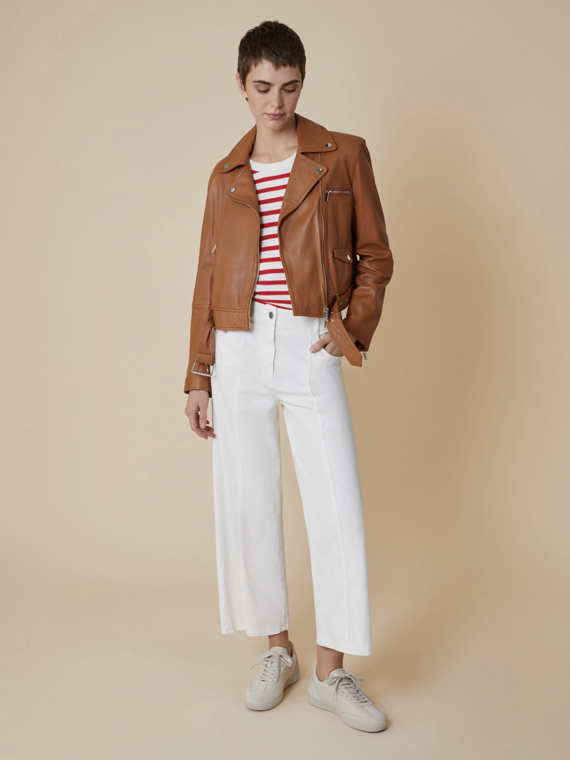 Модель прямого кроя длиной выше бёдер, с характерной асимметричной застёжкой на молнии и воротником с лацканами.