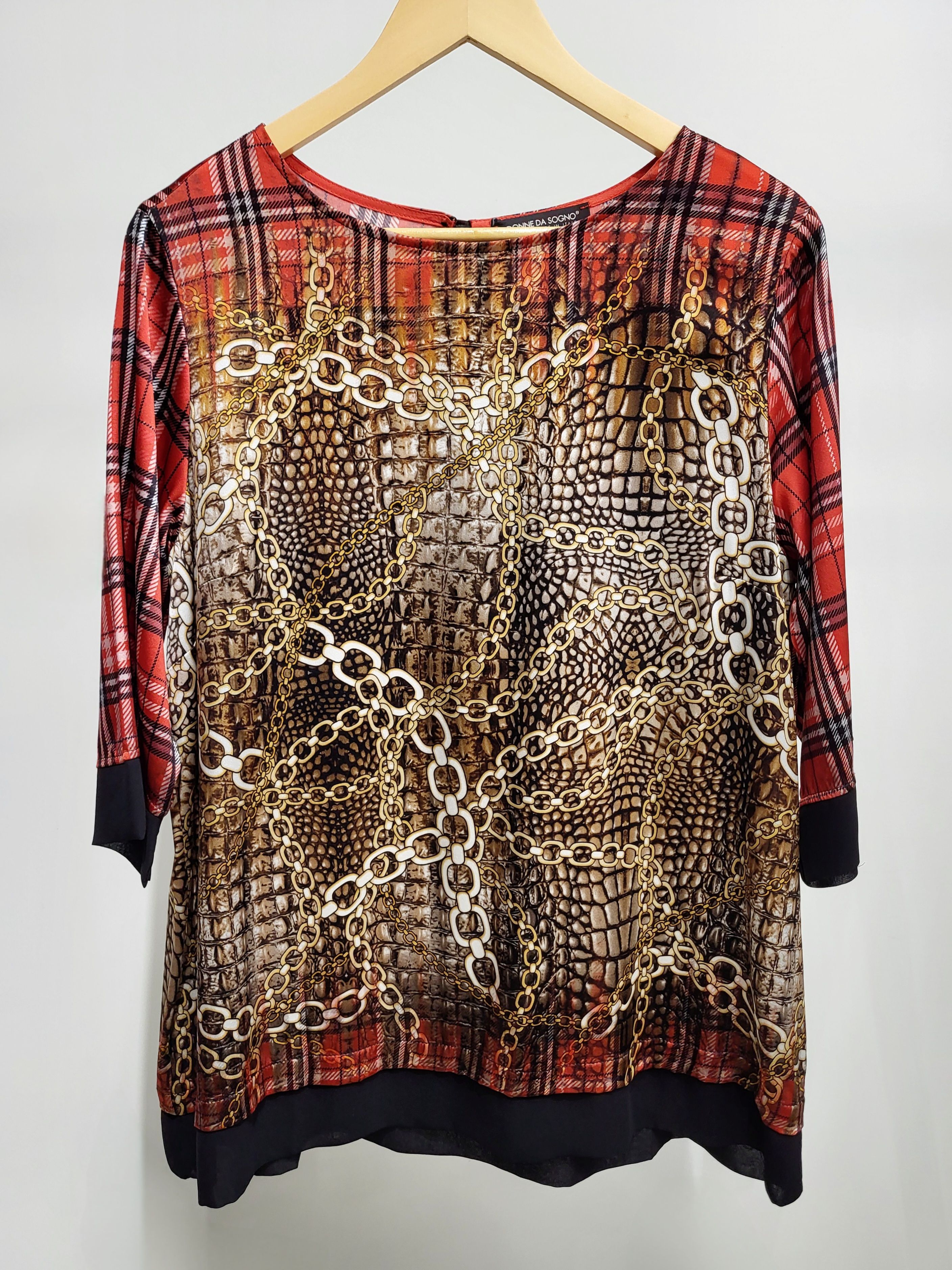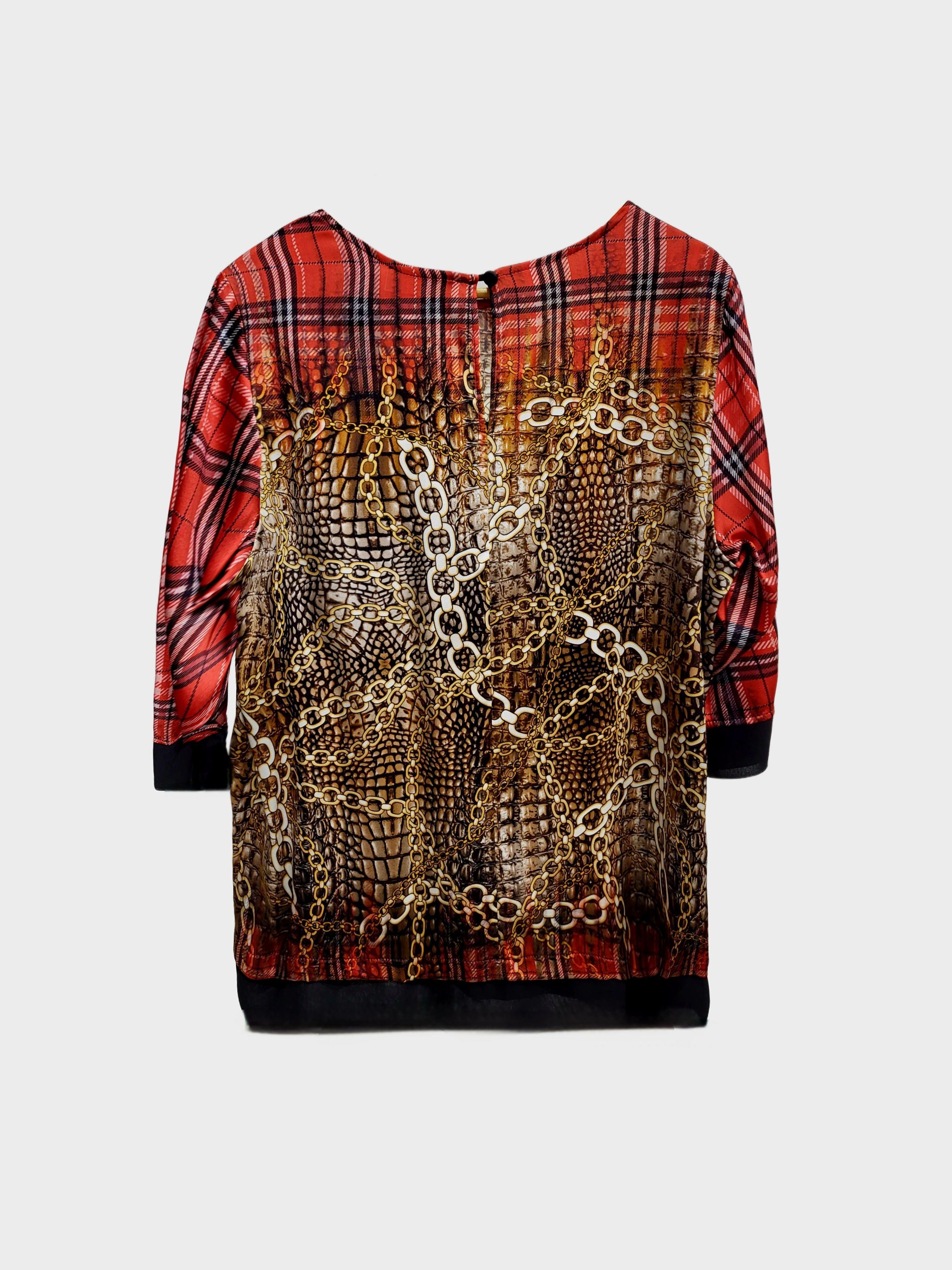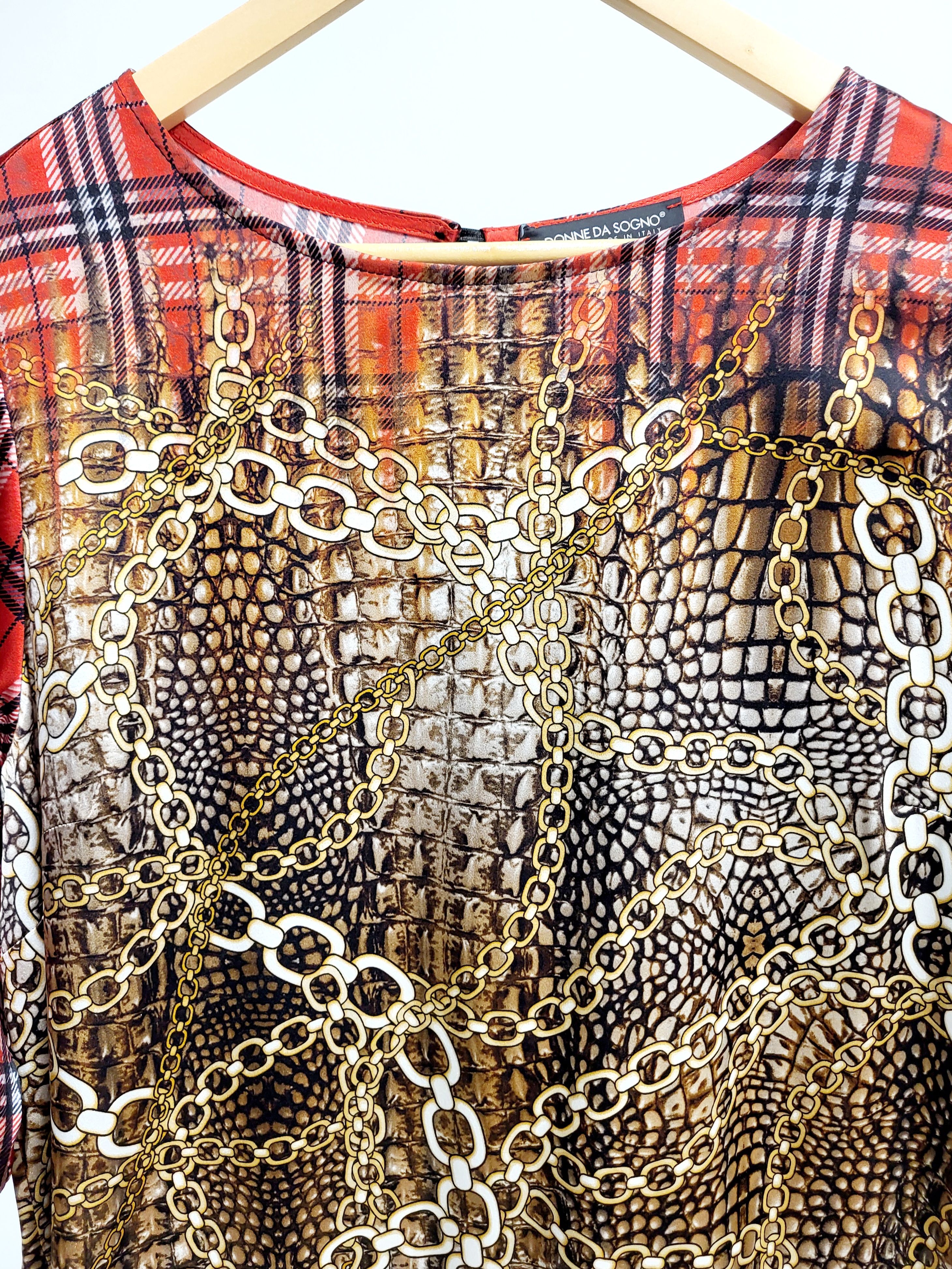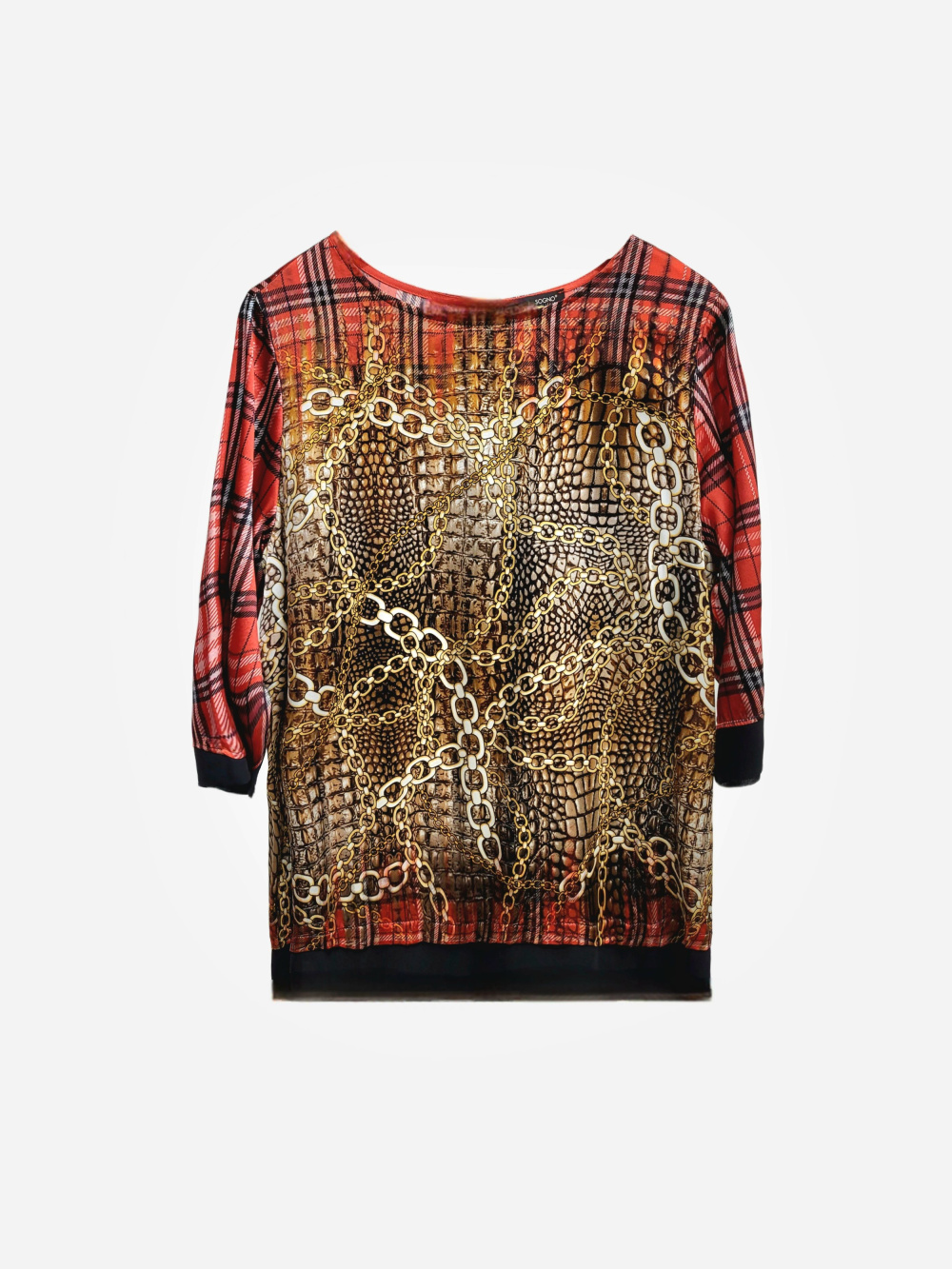 Женская шёлковая блузка с рукавами 3/4 и ярким принтом итальянского бренда Donne da Sogno. Цвет: красный/чёрный/золотистый. Принт: цепи. Бренд: DONNE DA SOGNO Страна бренда: Италия. Страна производства: Италия. Застежка-пуговица на спинке сверху. Овальный вырез. Рукав 3/4. Прямой крой. Состав материала: 92% шёлк, 8% эластан. Рекомендации по уходу: Не стирать. Не отбеливать. Не отжимать. Гладить на минимальном температурном режиме наизнанку. Разрешена только щадящая чистка.