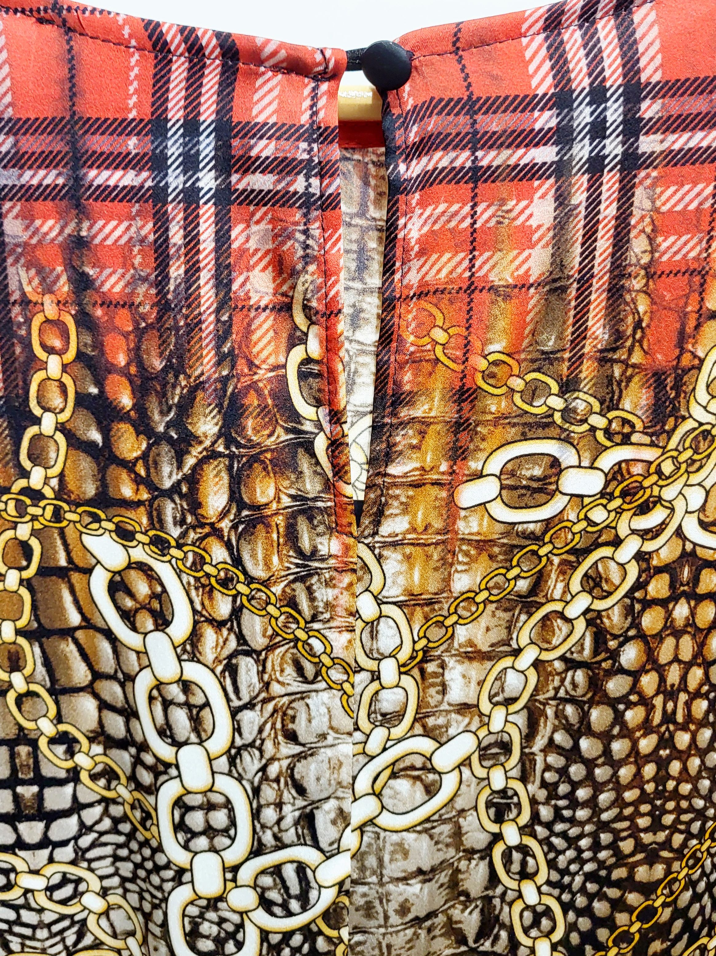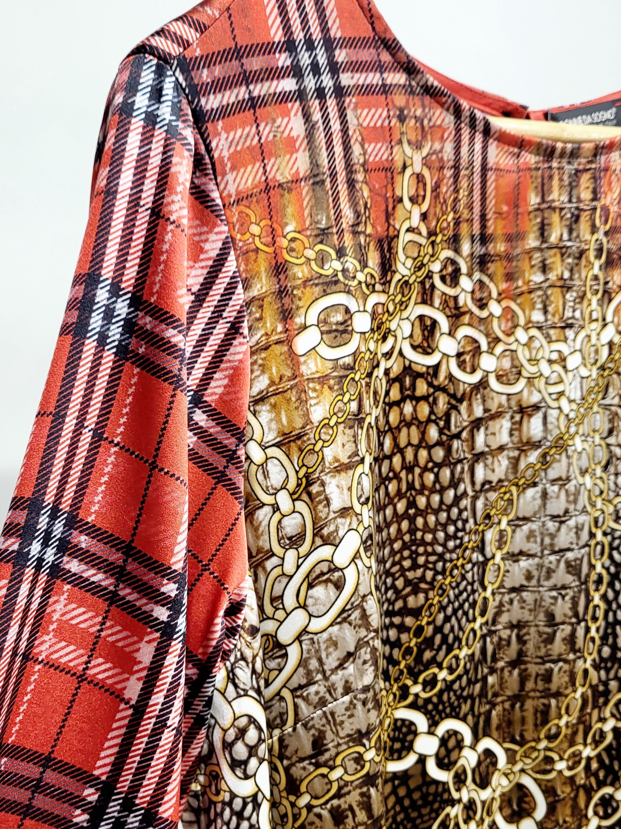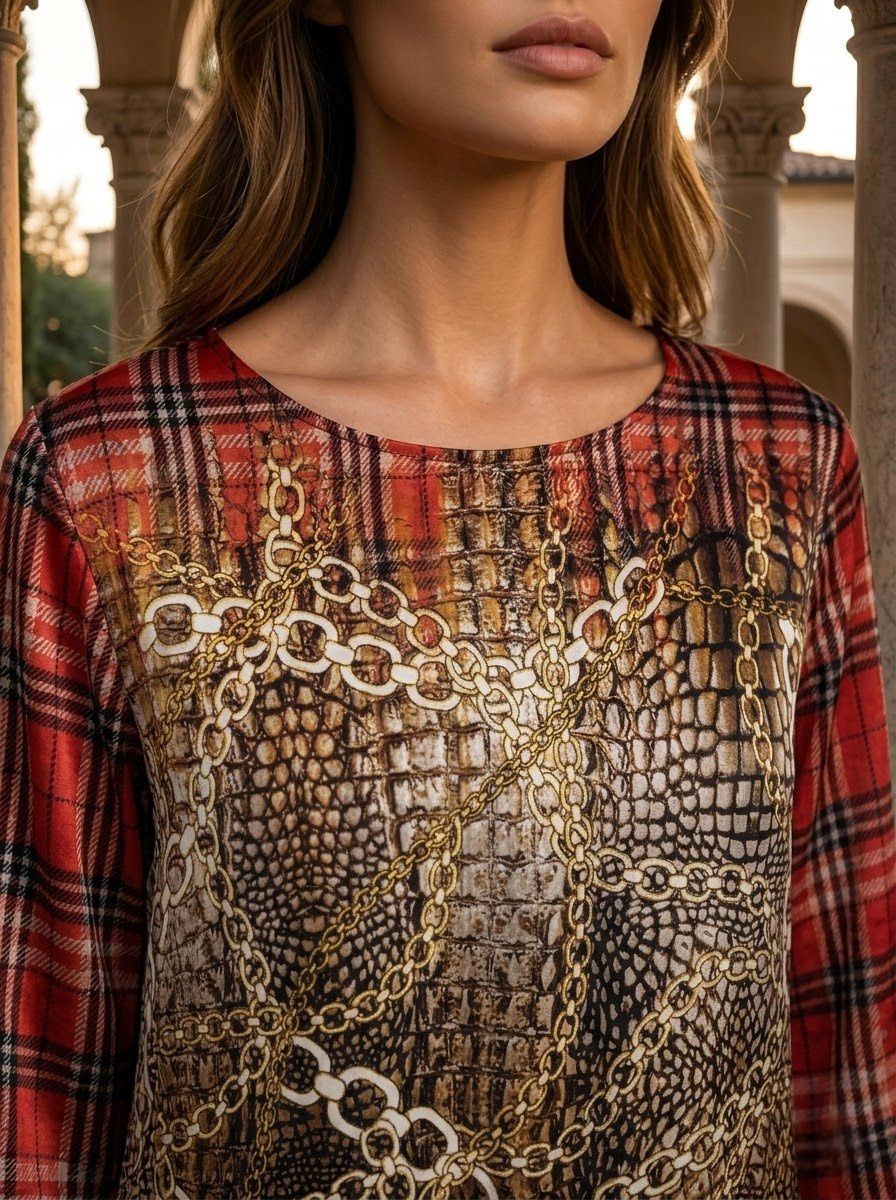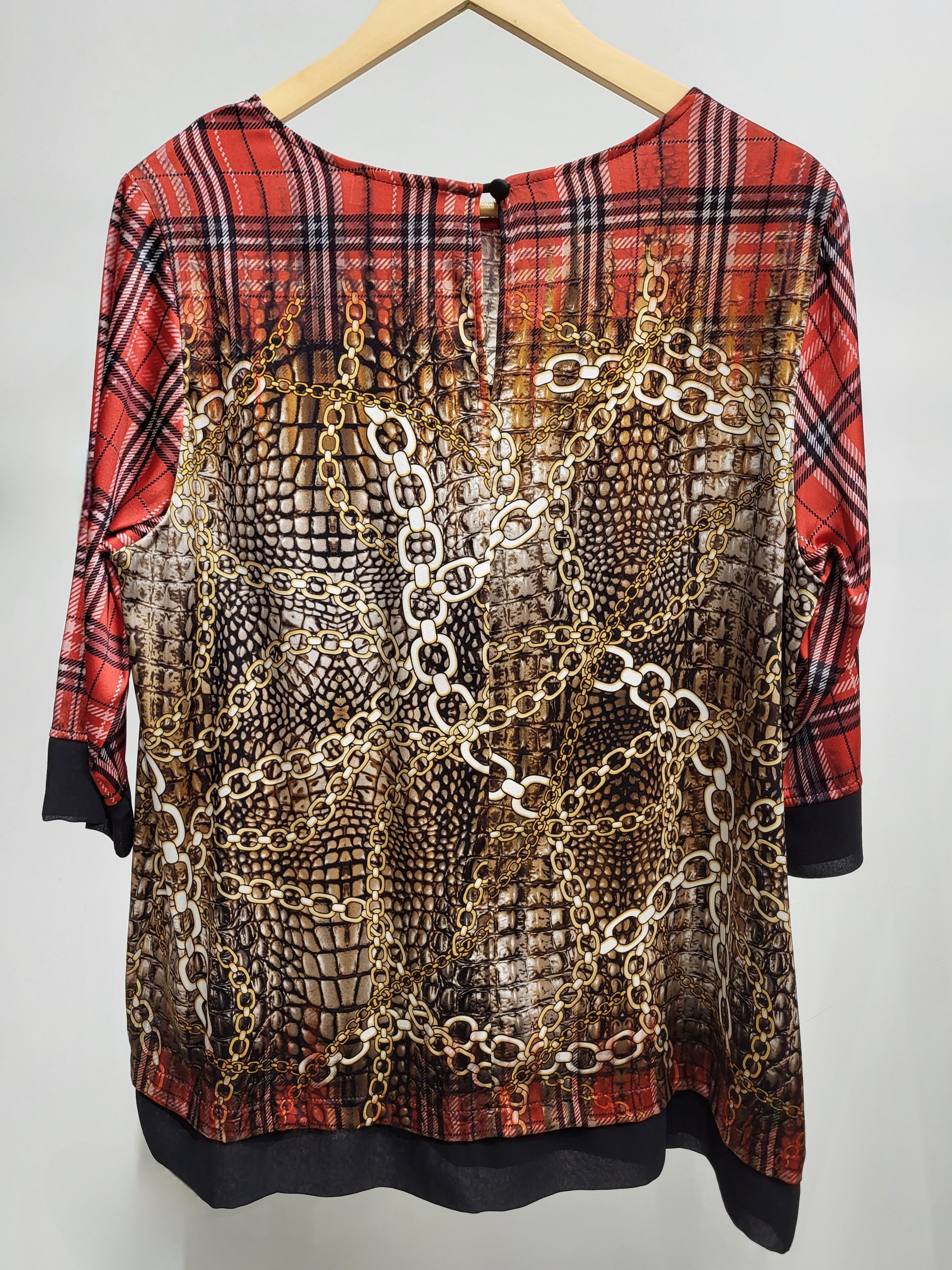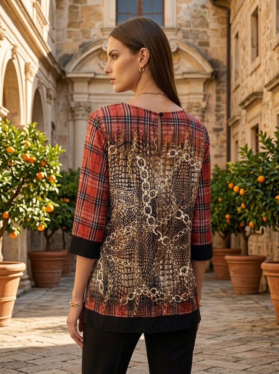 Женская шёлковая блузка с рукавами 3/4 и ярким принтом итальянского бренда Donne da Sogno. Цвет: красный/чёрный/золотистый. Принт: цепи. Бренд: DONNE DA SOGNO Страна бренда: Италия. Страна производства: Италия. Застежка-пуговица на спинке сверху. Овальный вырез. Рукав 3/4. Прямой крой. Состав материала: 92% шёлк, 8% эластан. Рекомендации по уходу: Не стирать. Не отбеливать. Не отжимать. Гладить на минимальном температурном режиме наизнанку. Разрешена только щадящая чистка.