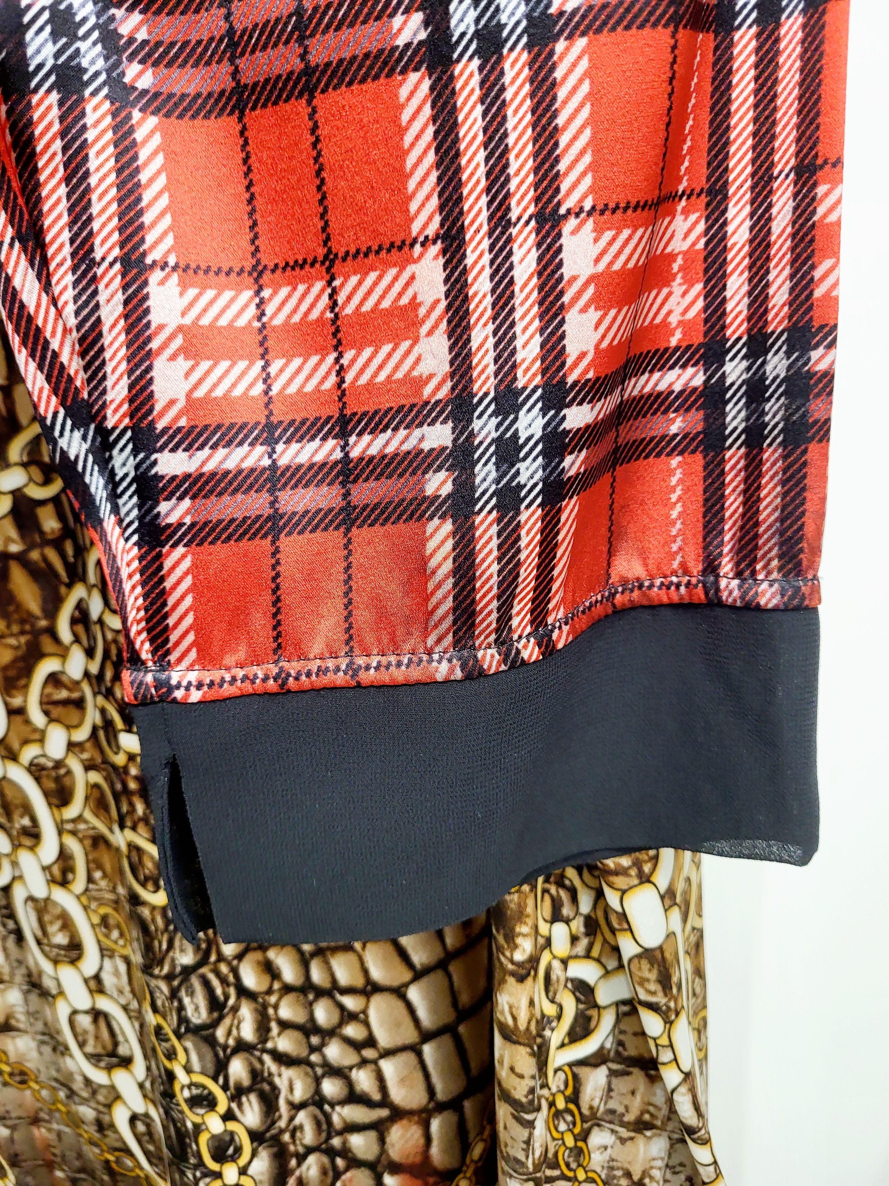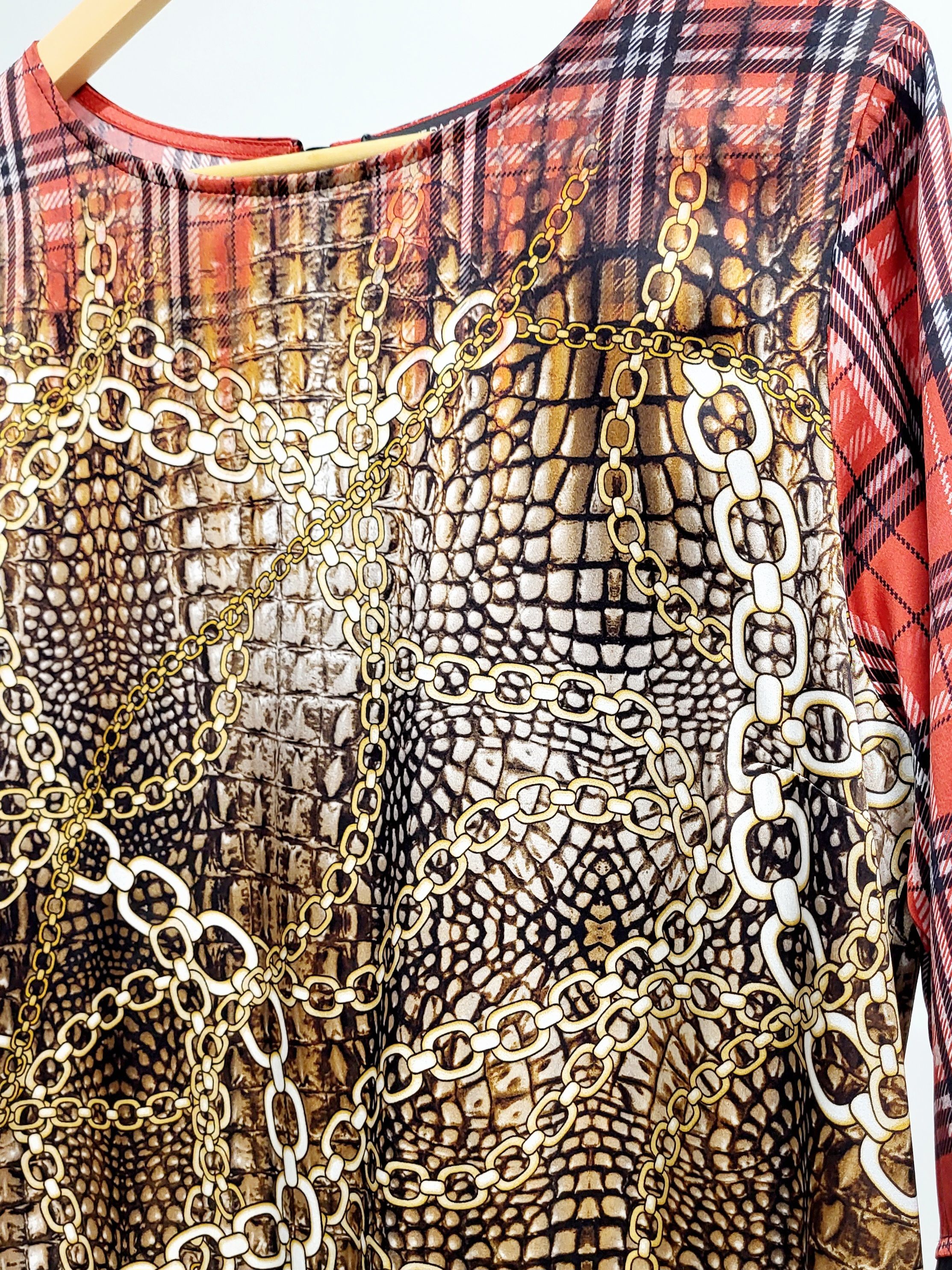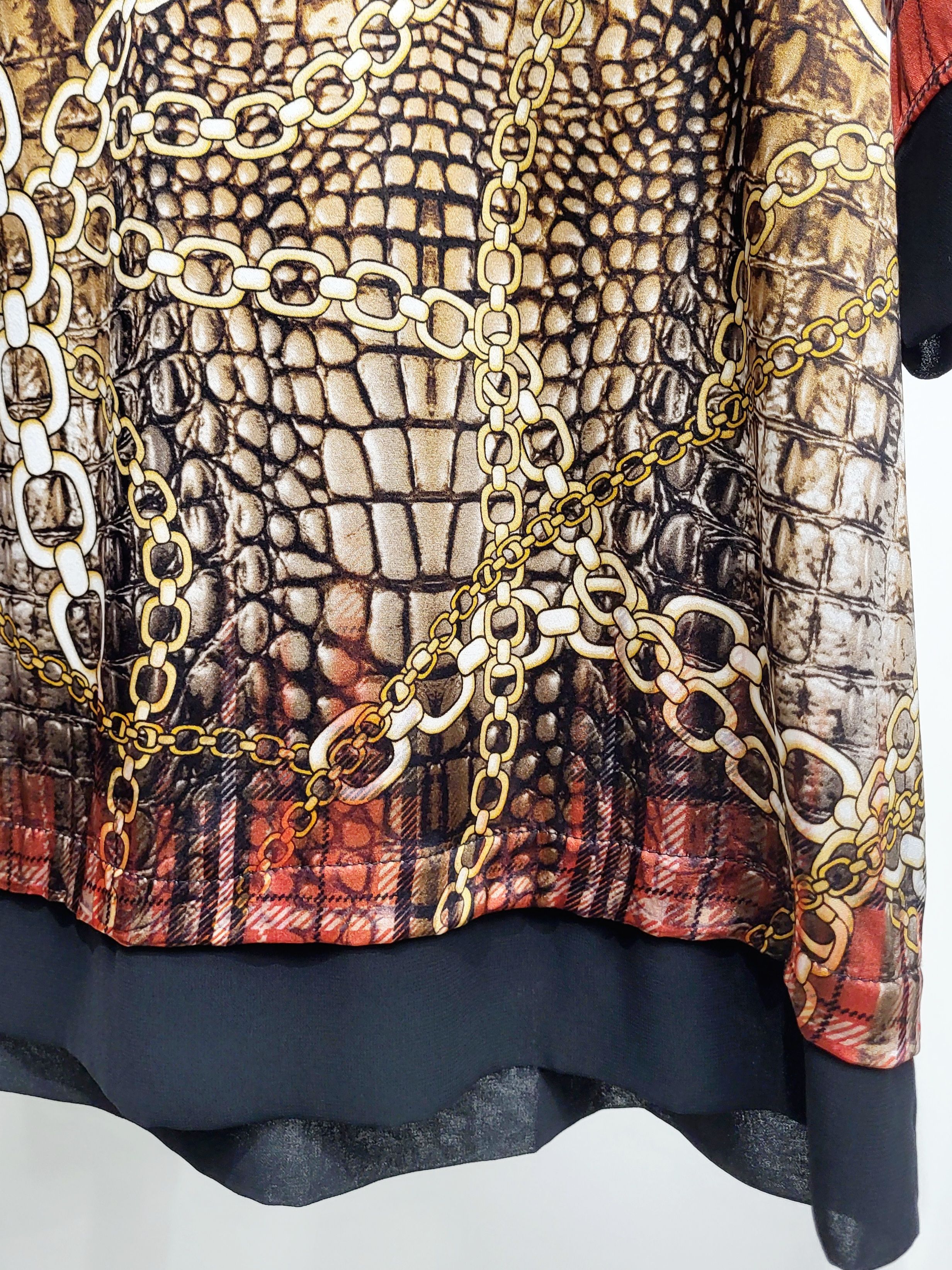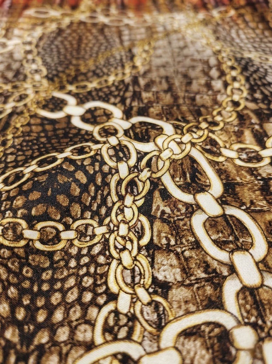 Женская шёлковая блузка с рукавами 3/4 и ярким принтом итальянского бренда Donne da Sogno. Цвет: красный/чёрный/золотистый. Принт: цепи. Бренд: DONNE DA SOGNO Страна бренда: Италия. Страна производства: Италия. Застежка-пуговица на спинке сверху. Овальный вырез. Рукав 3/4. Прямой крой. Состав материала: 92% шёлк, 8% эластан. Рекомендации по уходу: Не стирать. Не отбеливать. Не отжимать. Гладить на минимальном температурном режиме наизнанку. Разрешена только щадящая чистка.