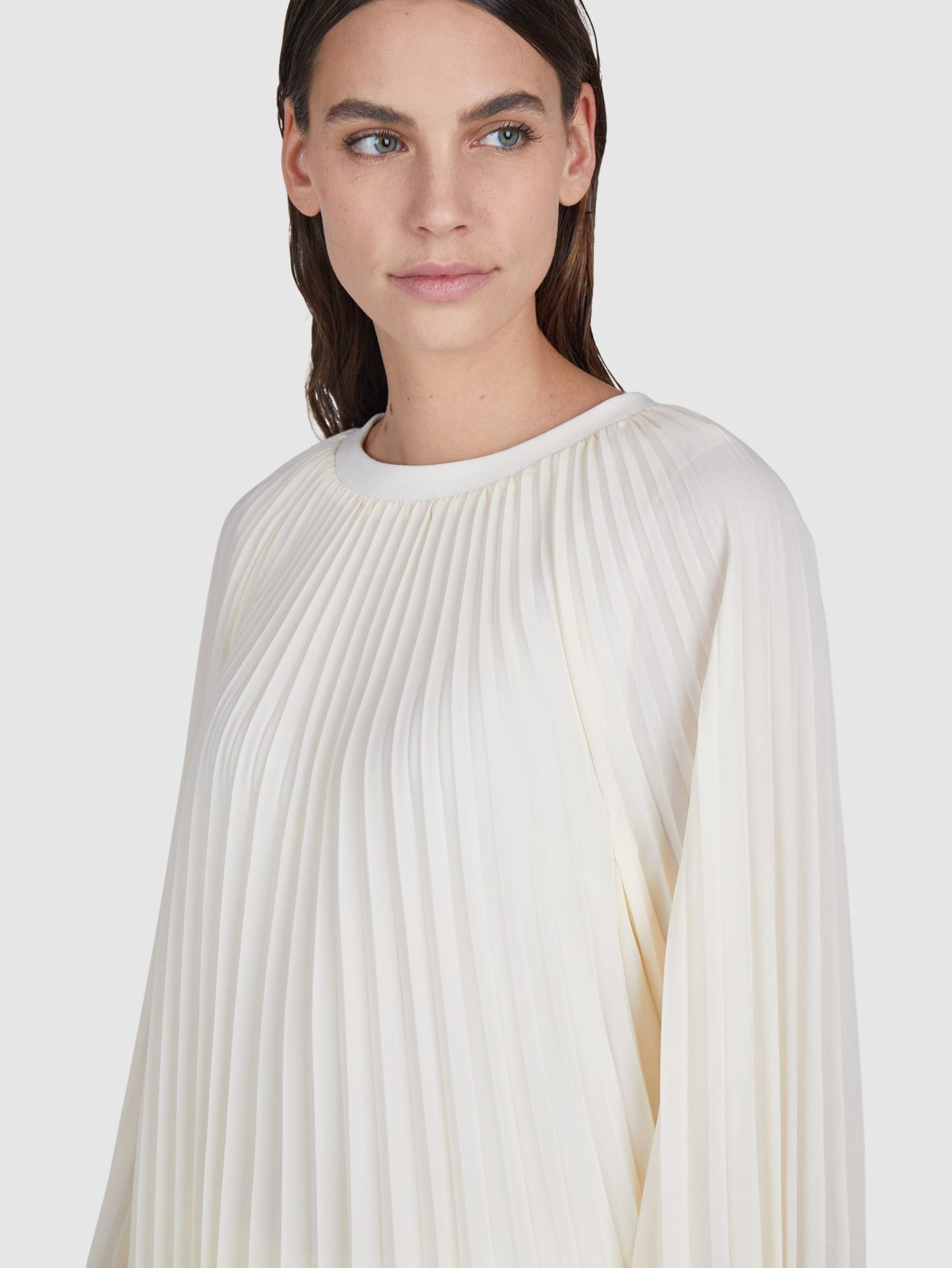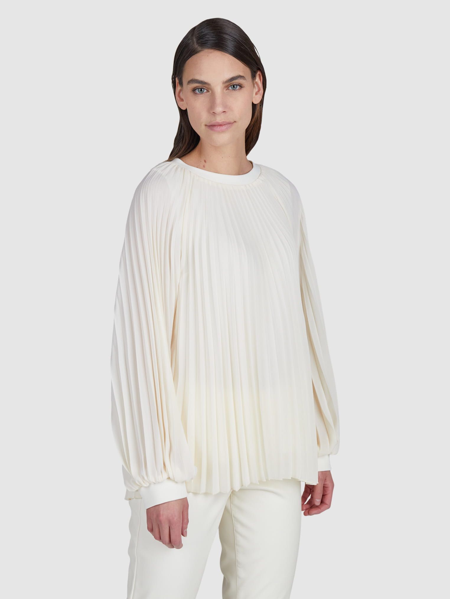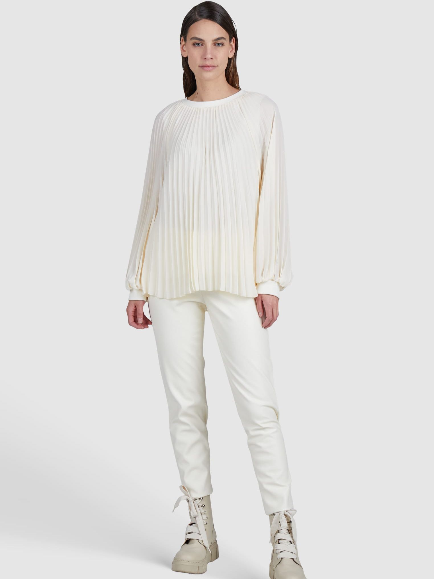 Откройте для себя нашу плиссированную блузку с трикотажными манжетами из мягкого крепа с плиссированной тканью.