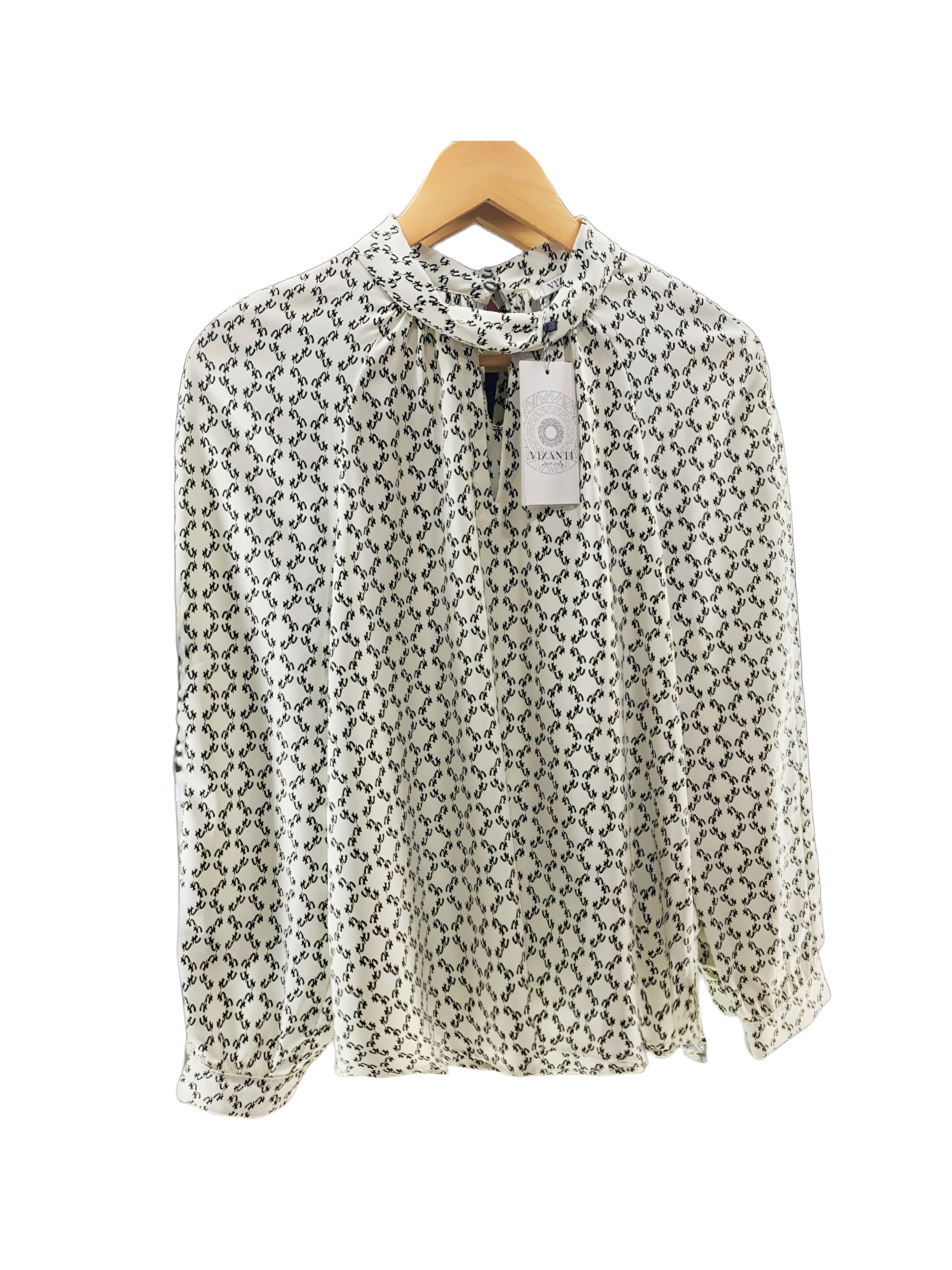 Женская блузка из непрозрачной струящейся вискозы с орнаментом, с длинными рукавами и воротником-стойкой бренда Vizanti. Цвет: молочный. Принт: орнамент. Бренд: VIZANTI. Страна бренда: Россия. Застежка-пуговица на спинке сверху. Воротник-стойка. Вырез-капля. Рукав длинный с манжетой на пуговице. Прямой крой. Состав материала: 62% вискоза, 35% полиэстер, 5% эластан. Рекомендации по уходу: Деликатная стирка при 40 градусах. Не отбеливать. Не сушить в сушильной машине. Гладить на минимальном температурном режиме наизнанку. Разрешена только щадящая чистка.