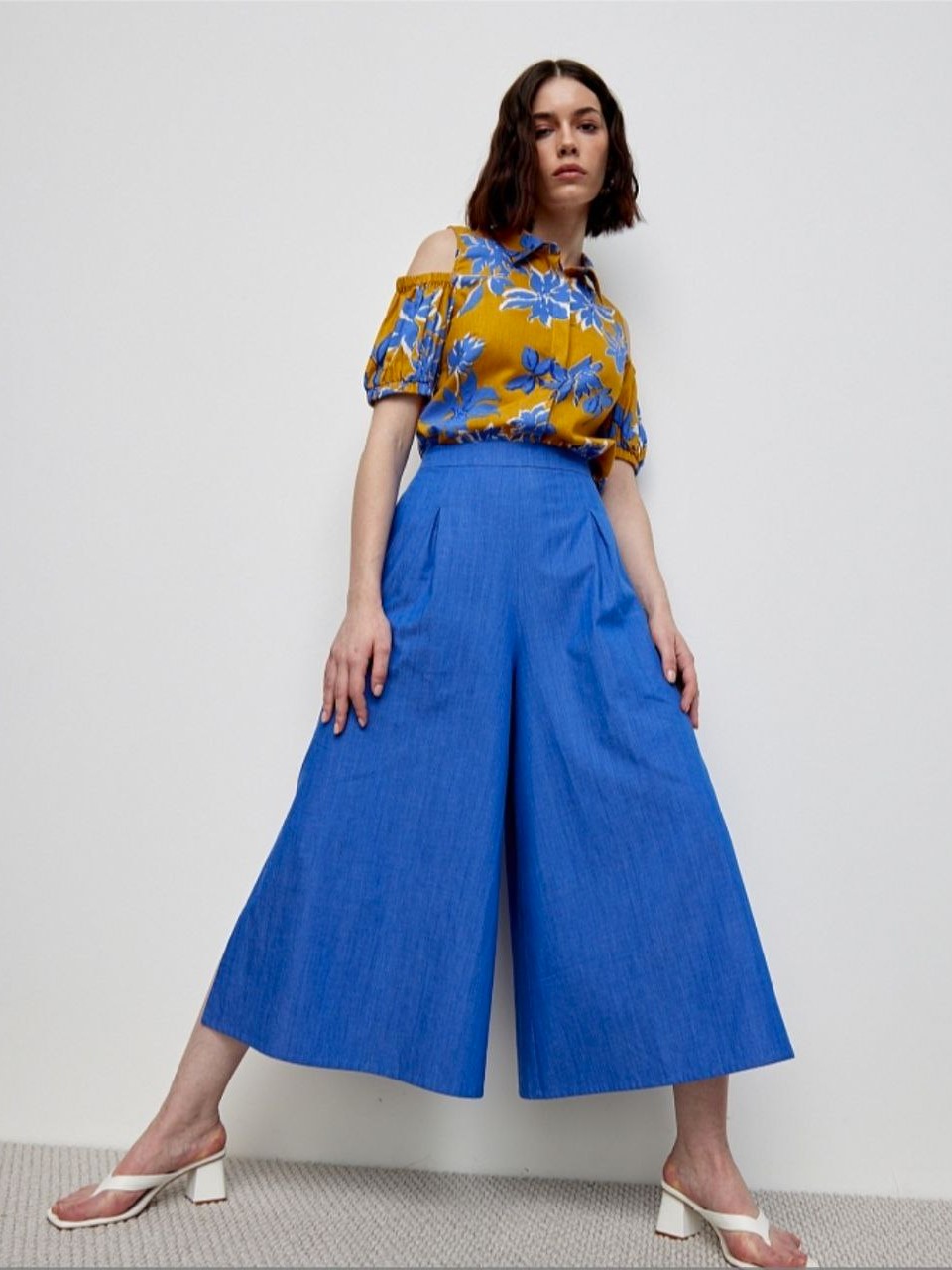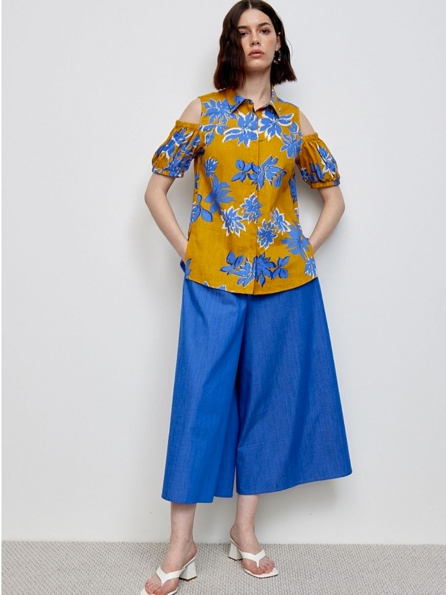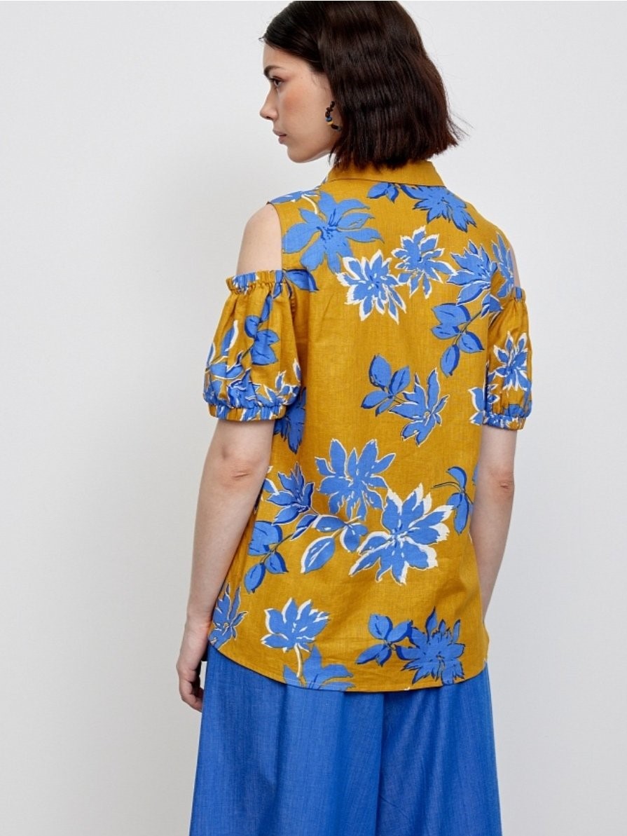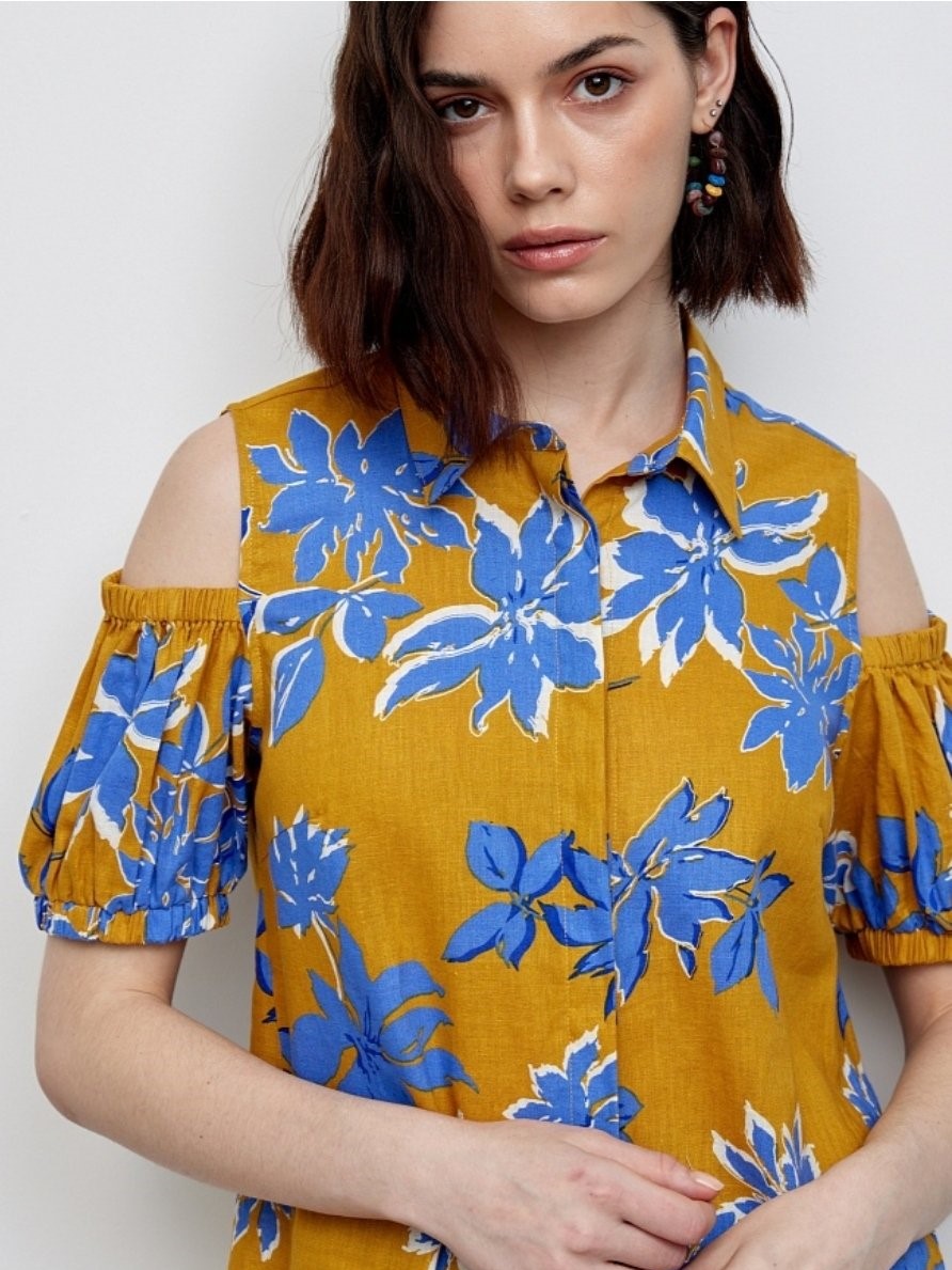 Блуза женская из льна и хлопка с открытыми плечами и цветочным принтом немецкого бренда BULMER.