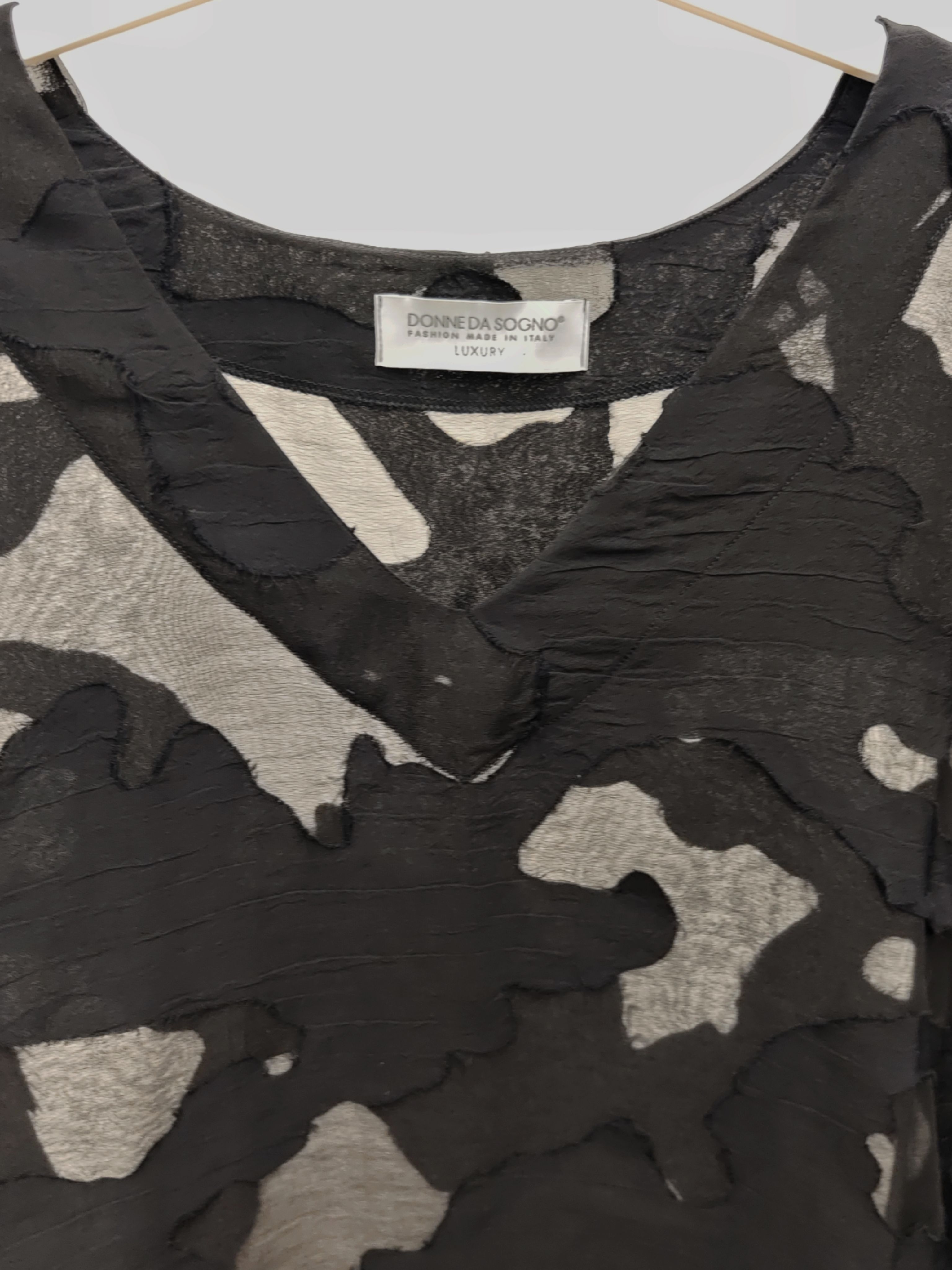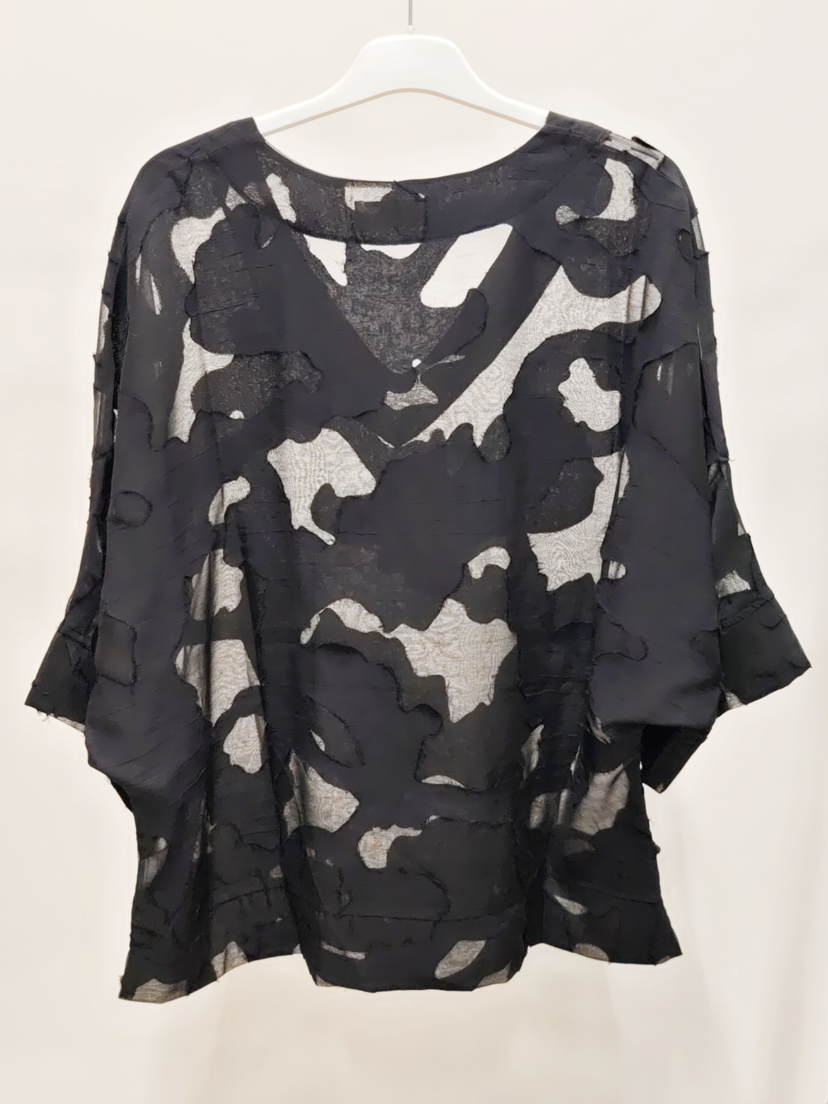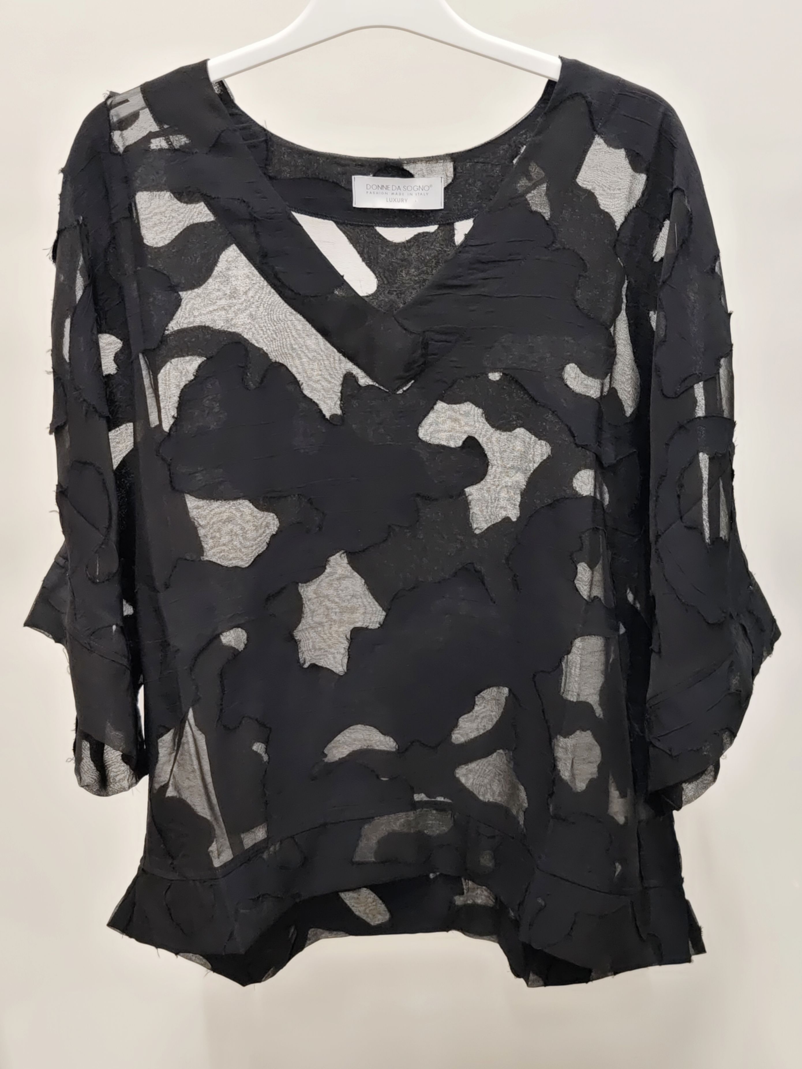 Женская полупрозрачная блузка с рукавами 3/4 и абстрактной аппликацией в тон изделия итальянского бренда Donne da Sogno.