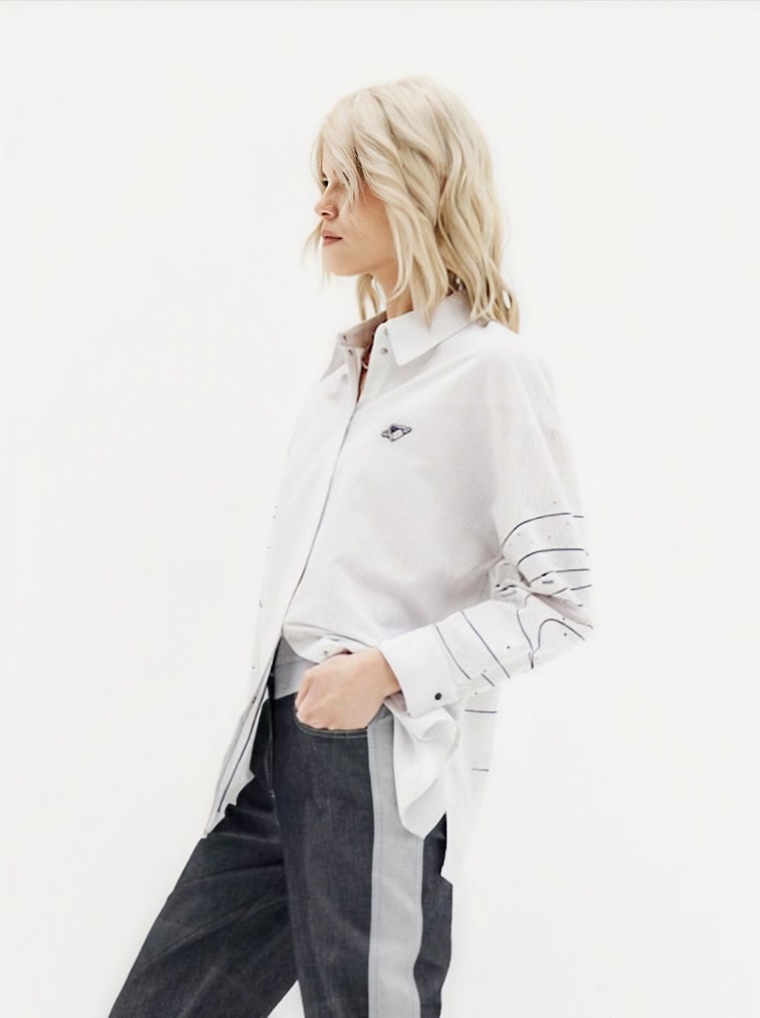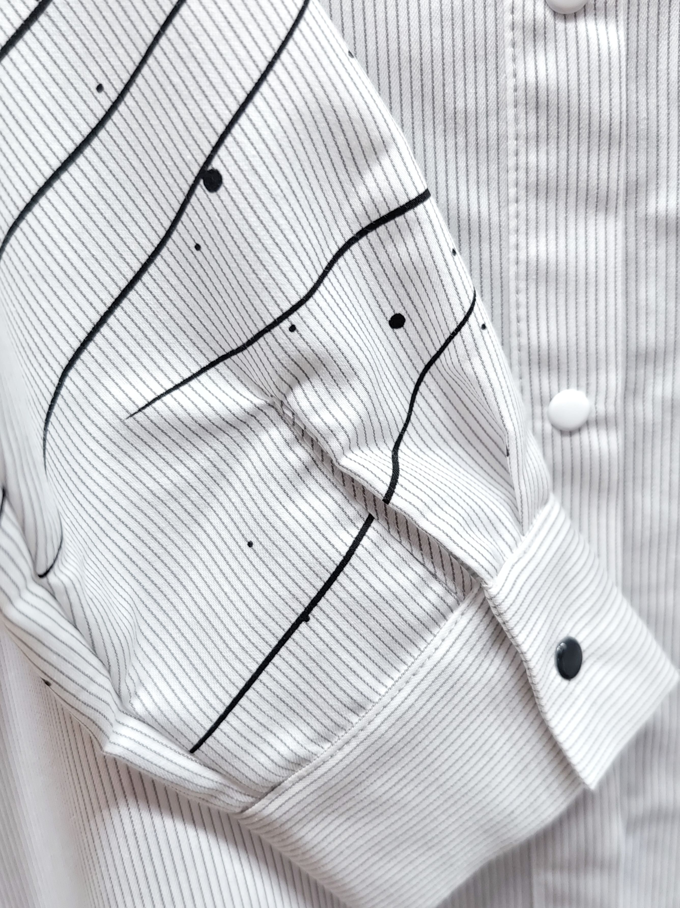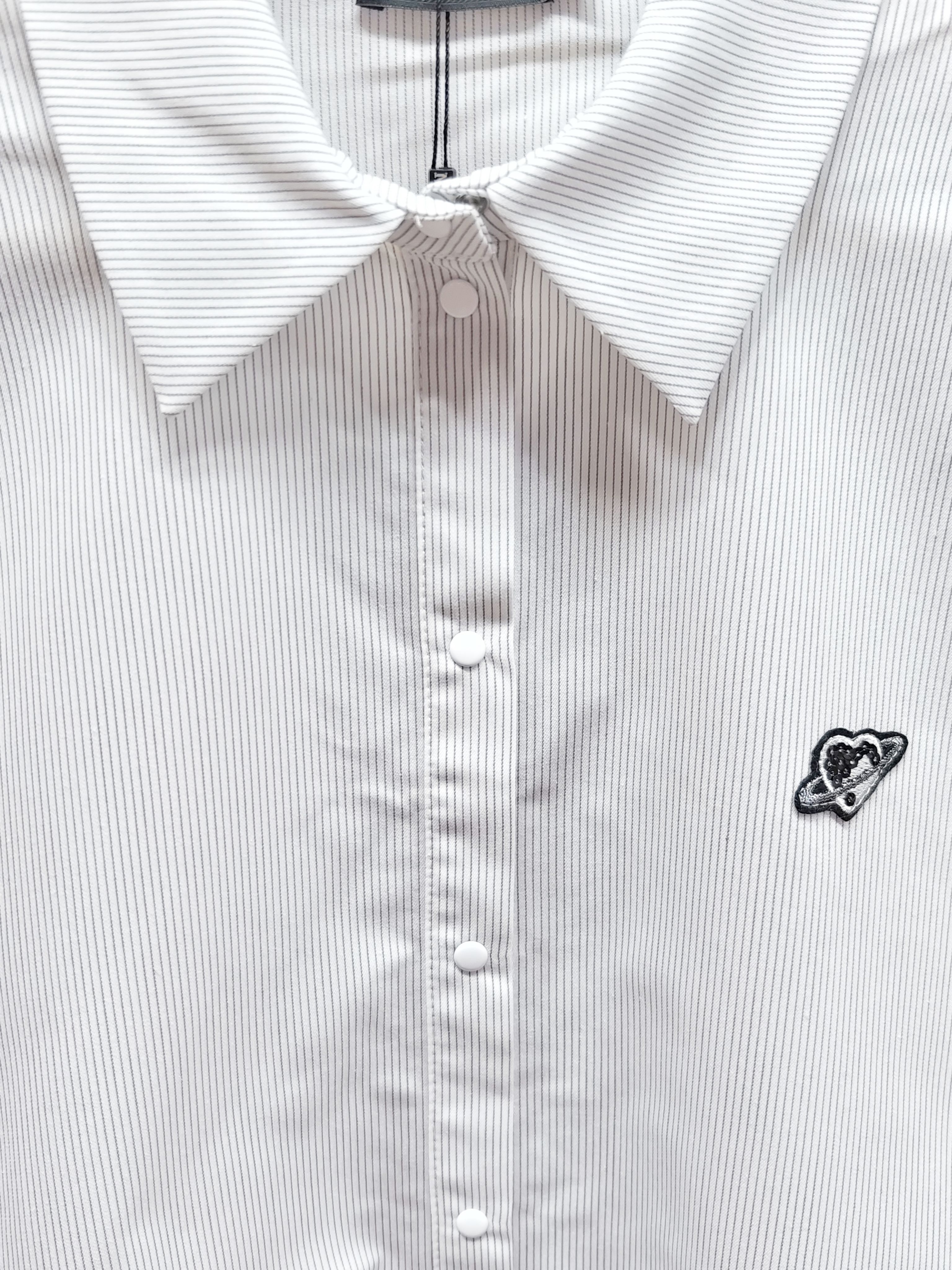 Блузка-рубашка женская в полоску с длинными рукавами, изящным отложным воротником и принтом в виде солнечной системы на спинке бренда Noche Mio.