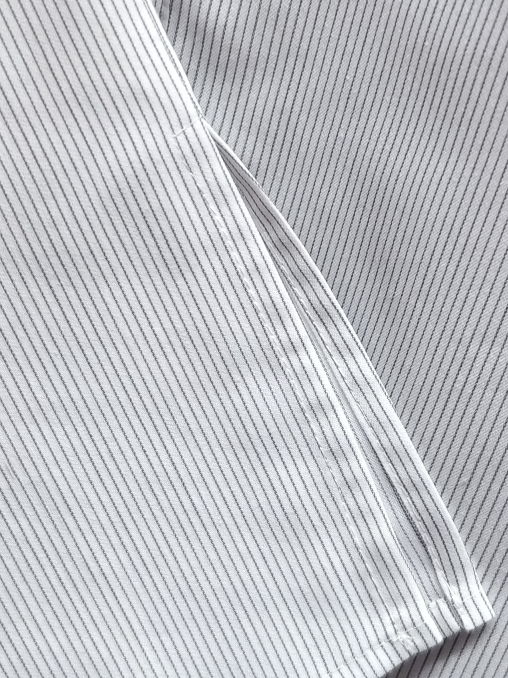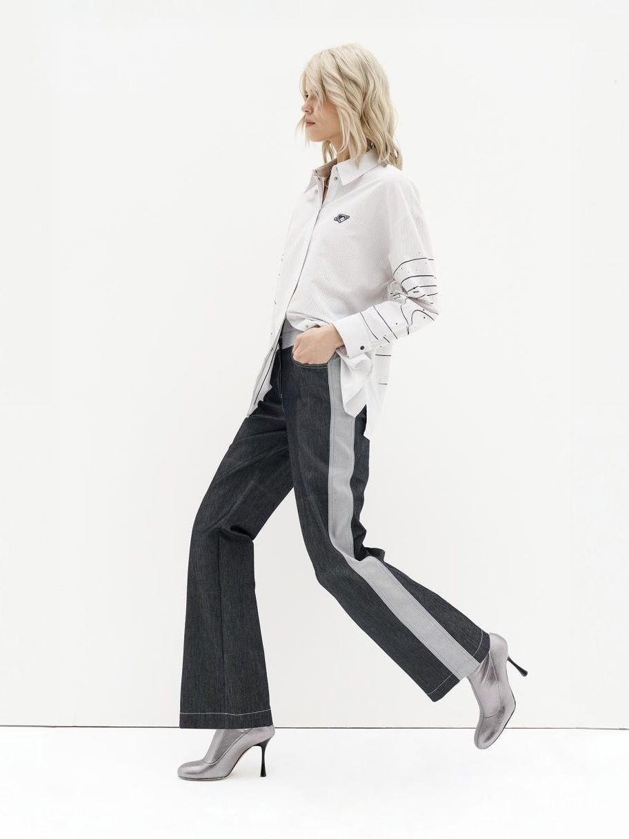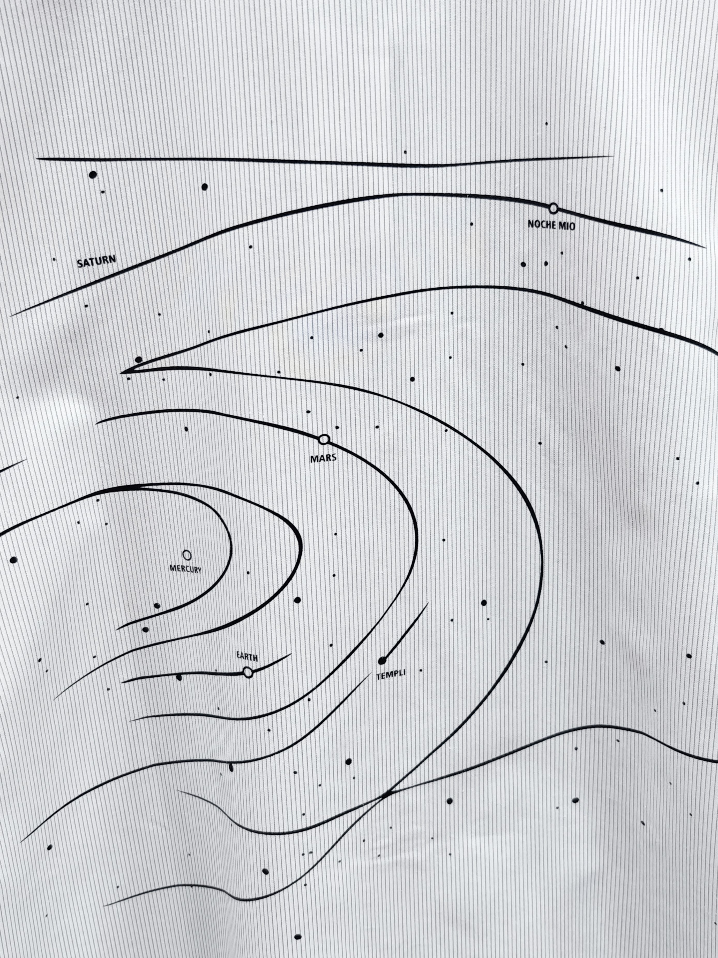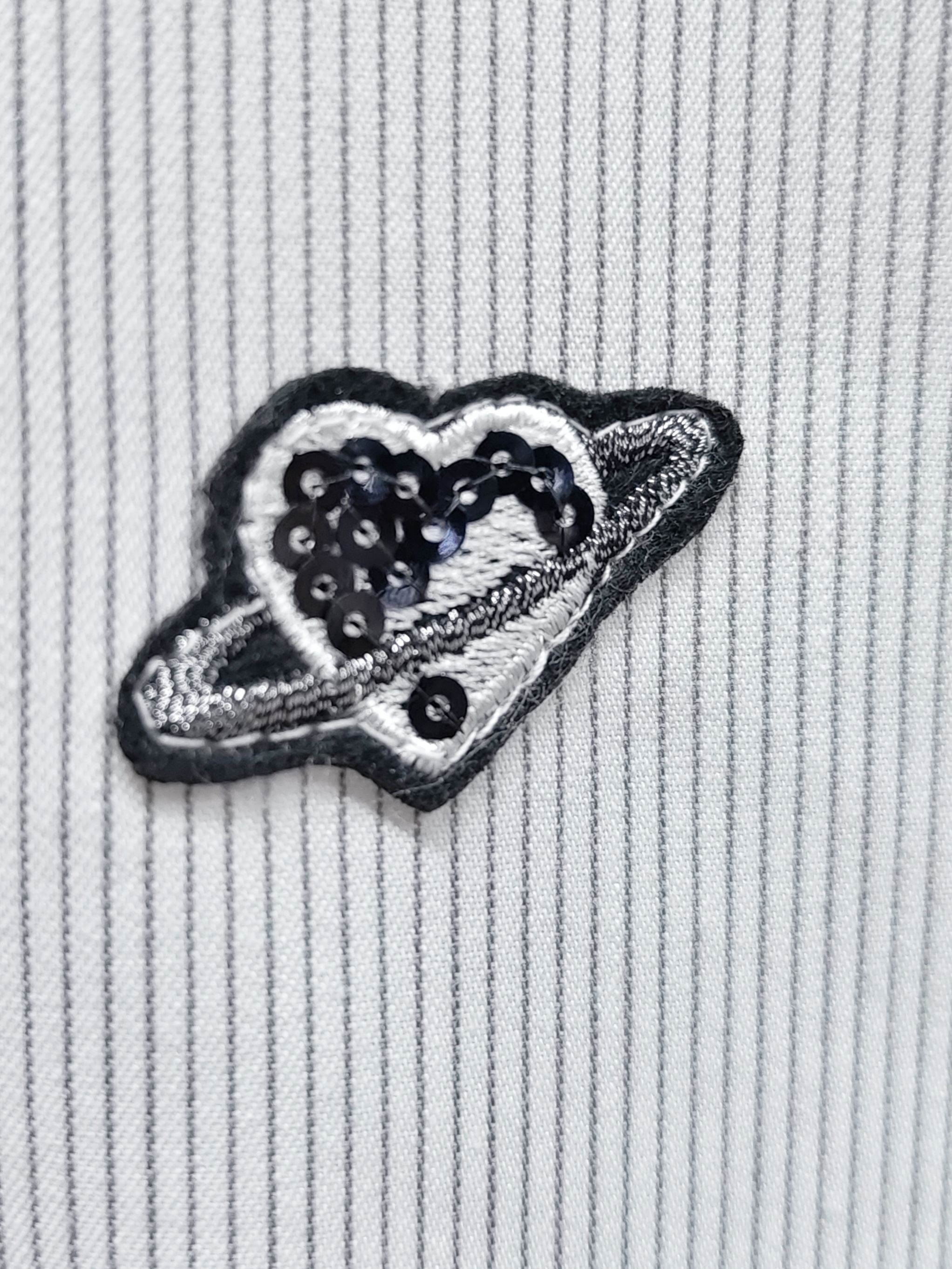 Блузка-рубашка женская в полоску с длинными рукавами, изящным отложным воротником и принтом в виде солнечной системы на спинке бренда Noche Mio.