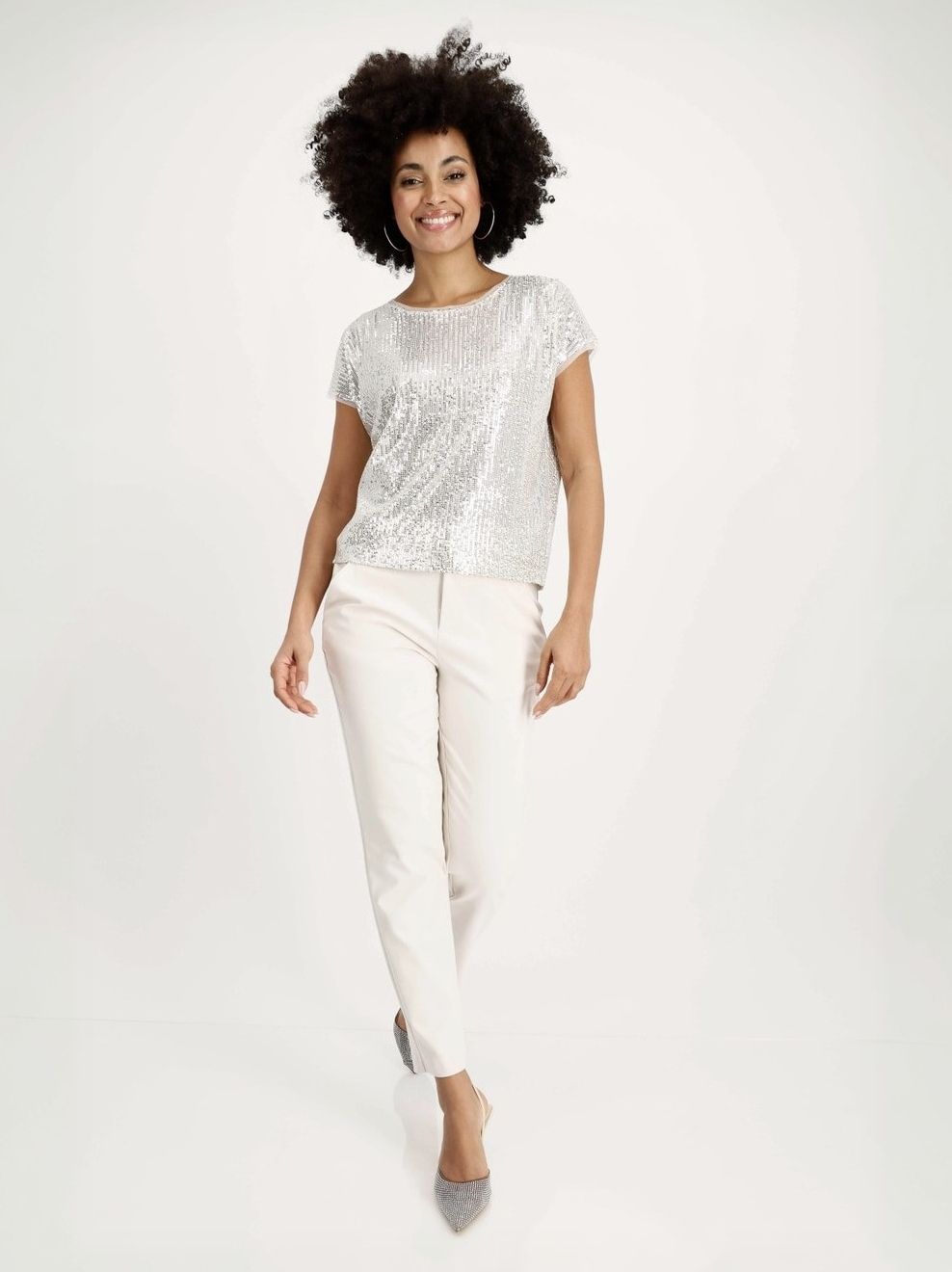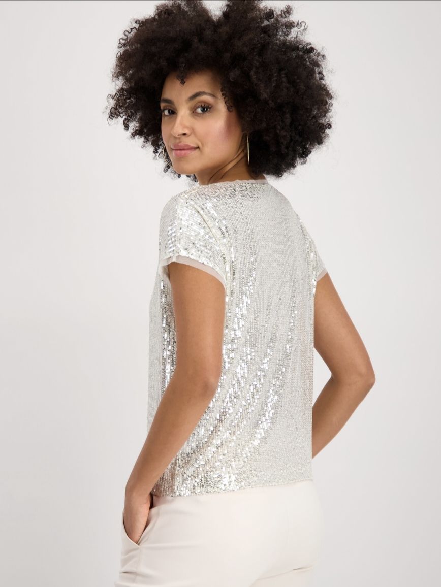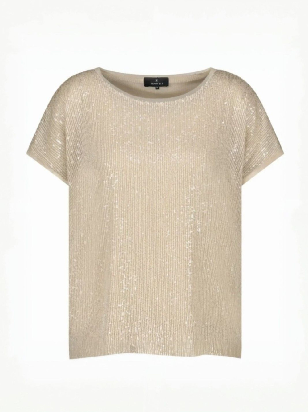Эта женская футболка немецкого бренда Monari впечатляет сверкающими блёстками, которые покрывают весь верх и проложены сеткой.