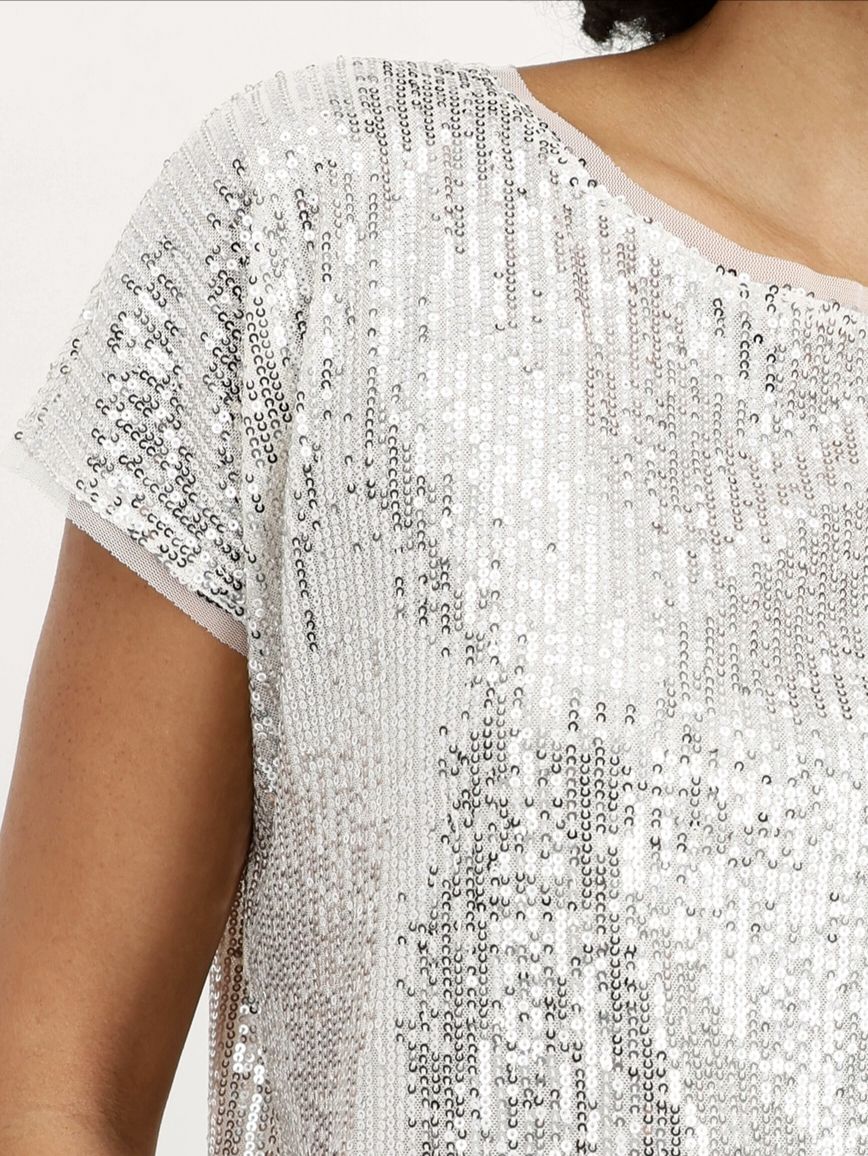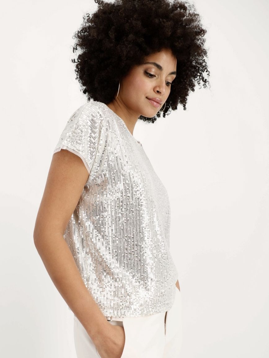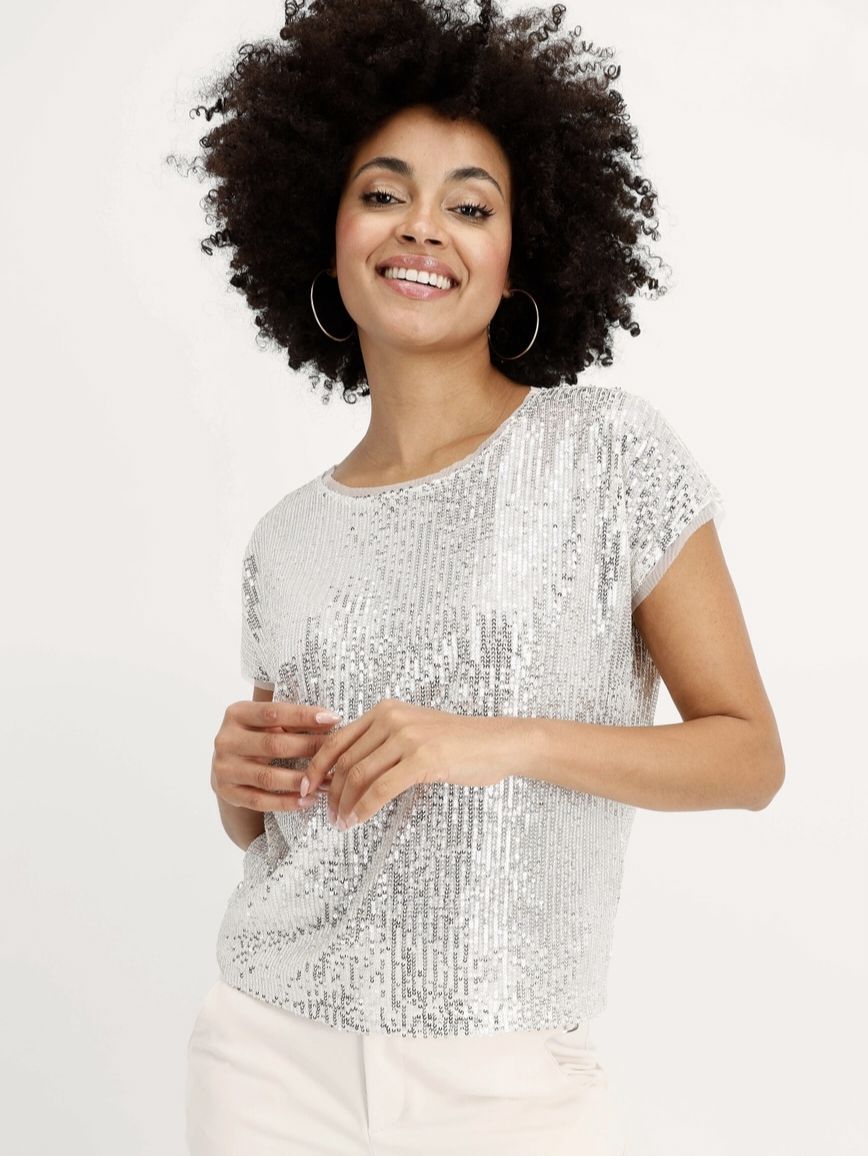 Эта женская футболка немецкого бренда Monari впечатляет сверкающими блёстками, которые покрывают весь верх и проложены сеткой.