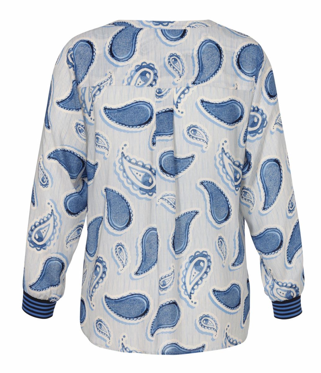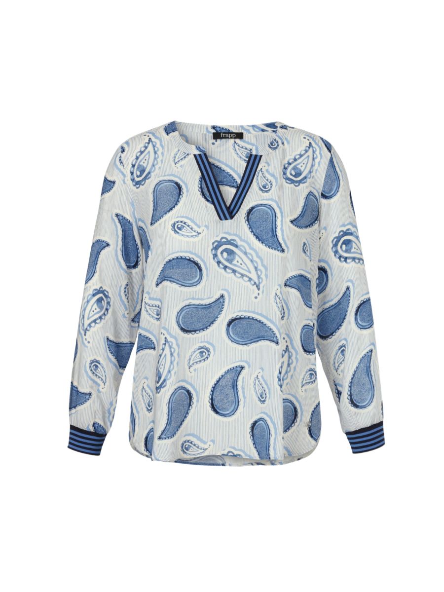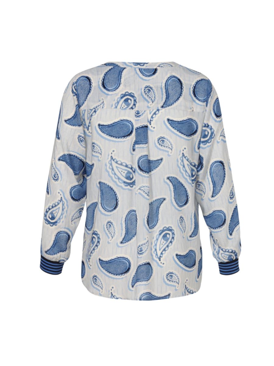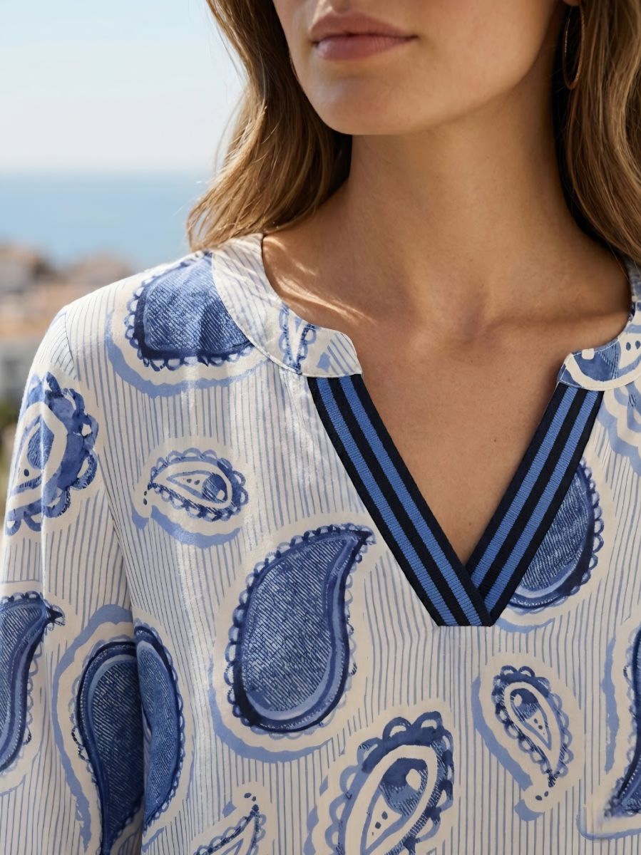 Блузка с V-образным вырезом и изящной отделкой в полоску темно-синего и кобальтово-синего цветов.