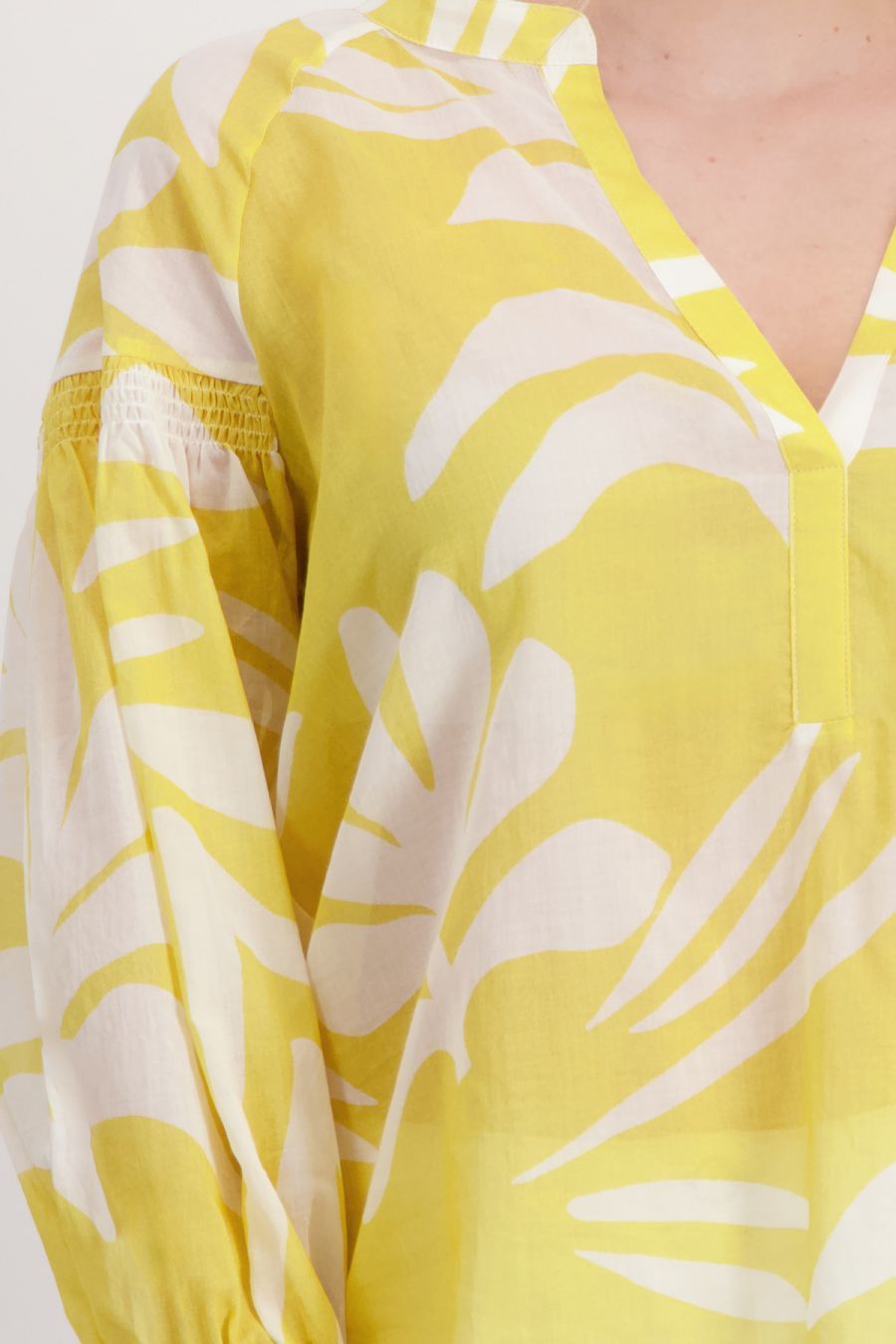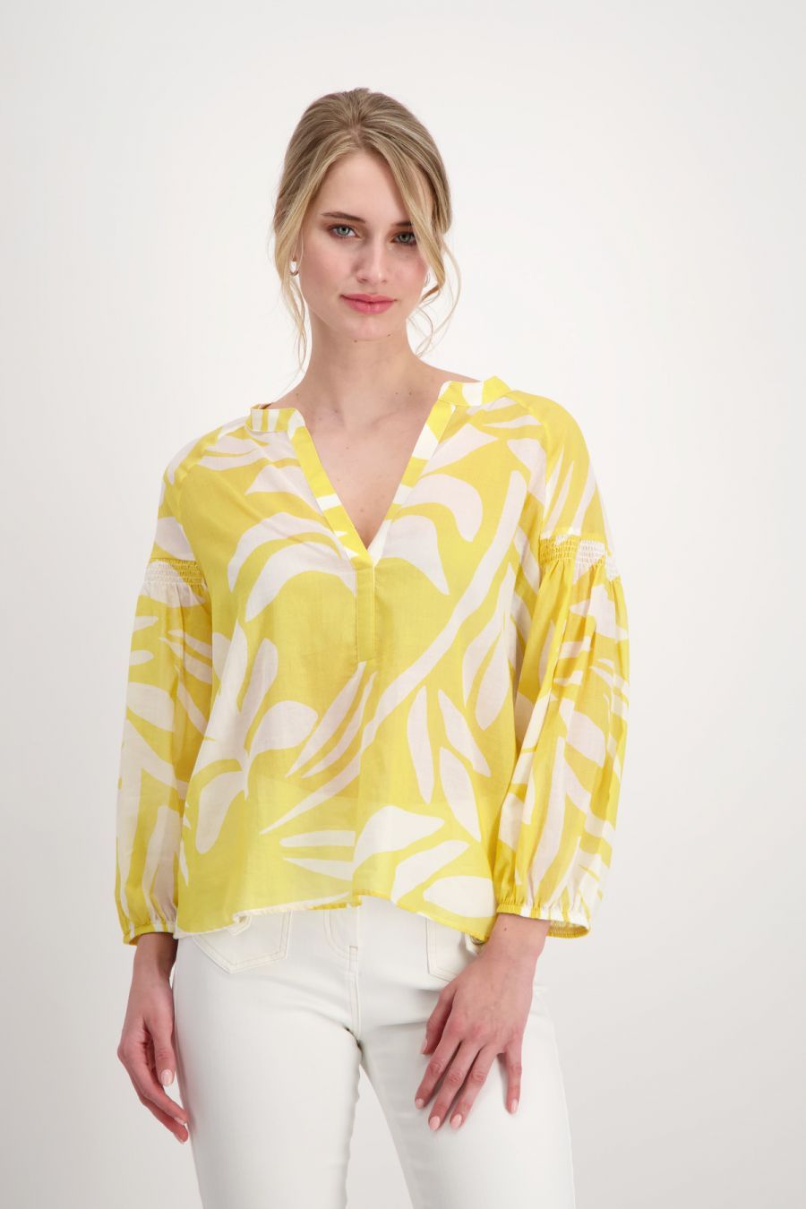 Воздушная блузка из 100% хлопка с цветочным узором по всей поверхности и экстравагантными рюшами на спине и плечах немецкого бренда Monari.