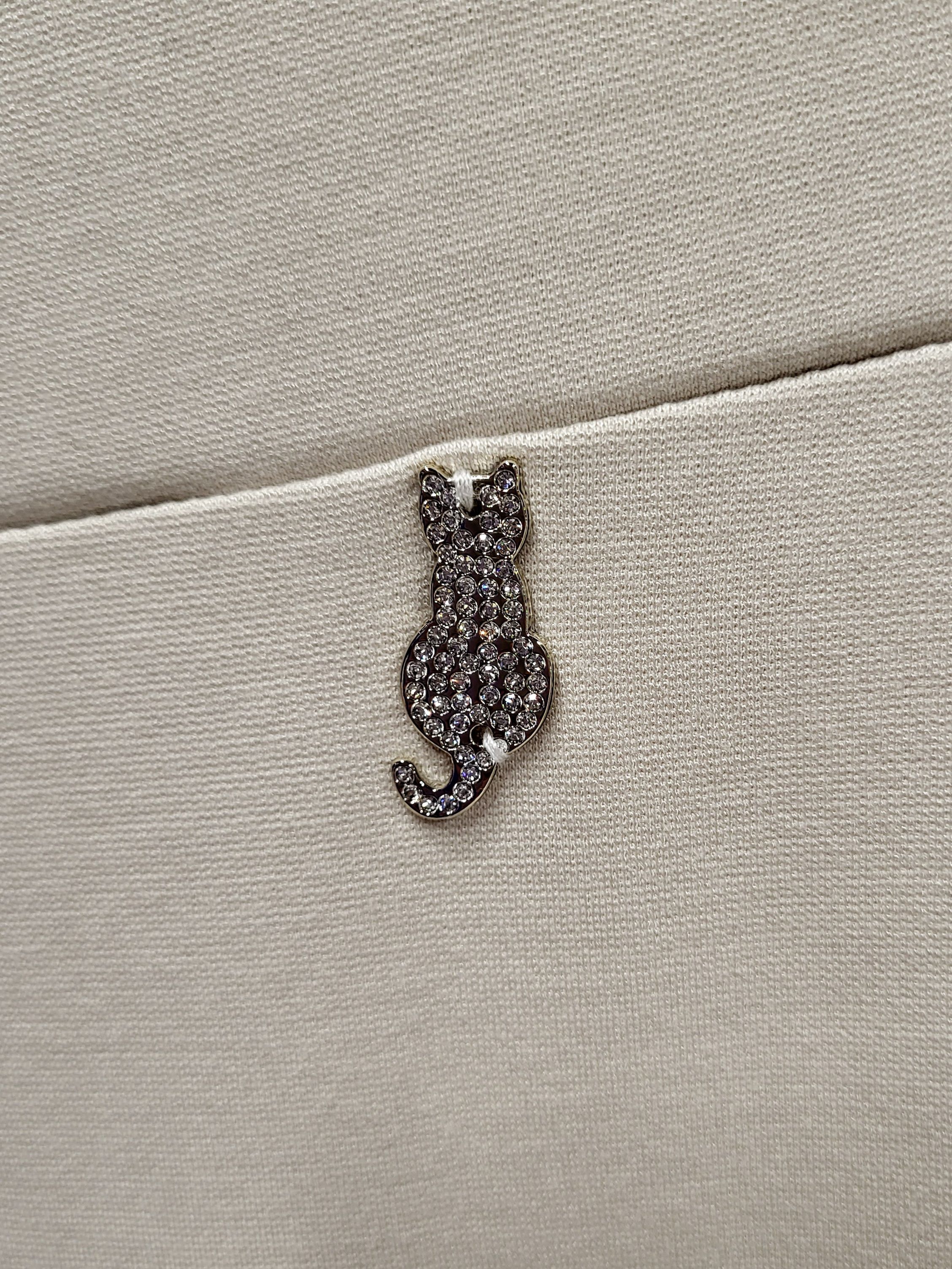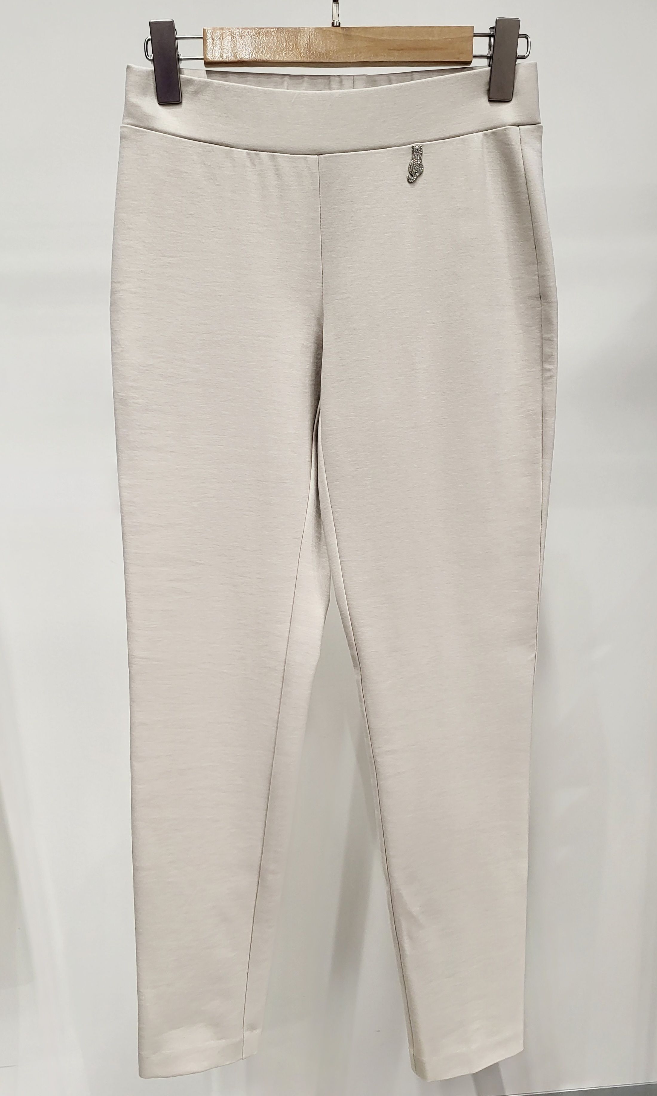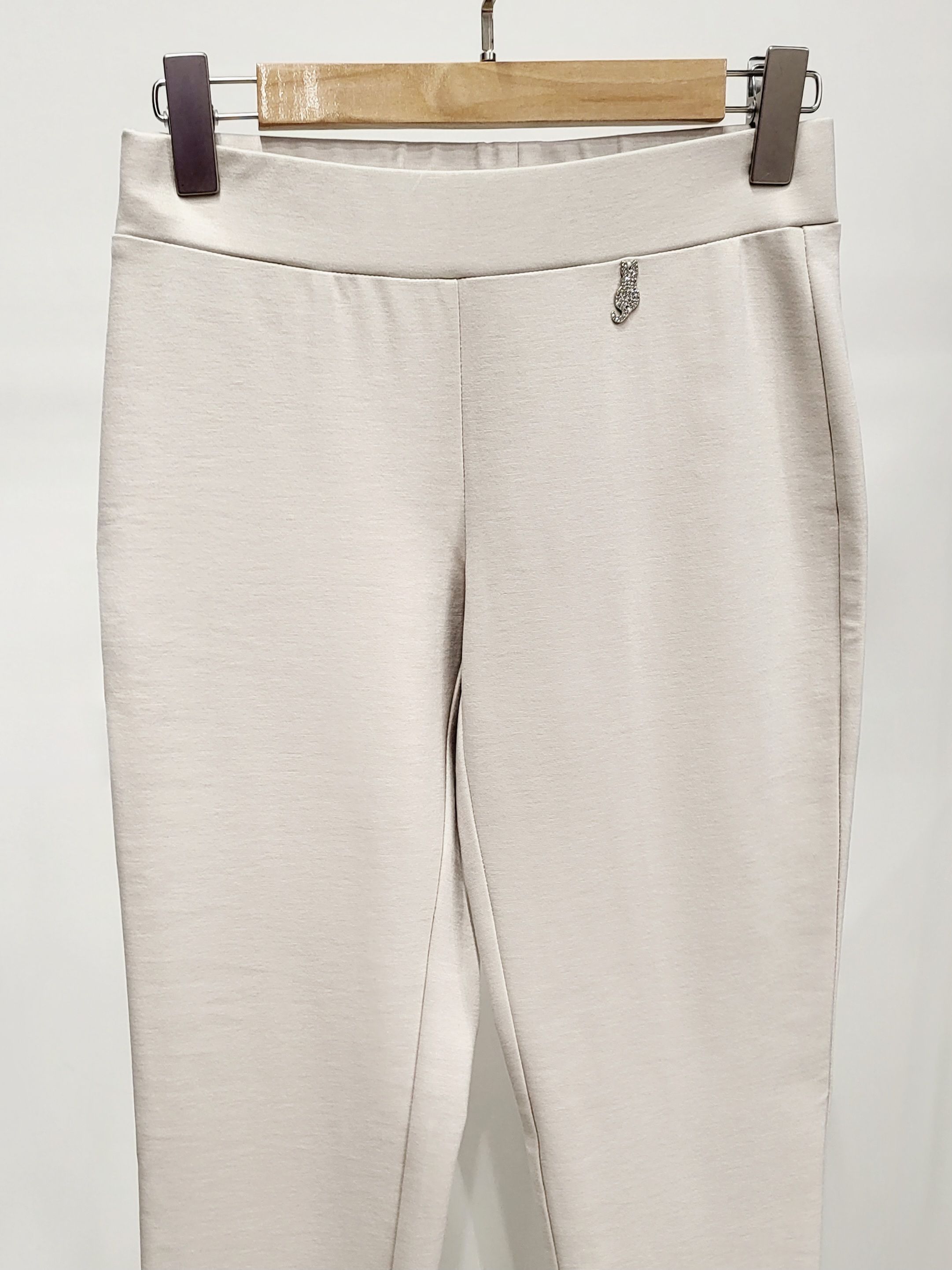 Зауженные трикотажные женские брюки итальянского бренда Donne da Sogno. Цвет: чёрный, молочный. Страна производства: Италия. Средняя посадка. Трикотажный пояс-резинка. Нашивка "кошка" со стразами. Состав материала: 65% вискоза, 32% нейлон, 3% эластан.