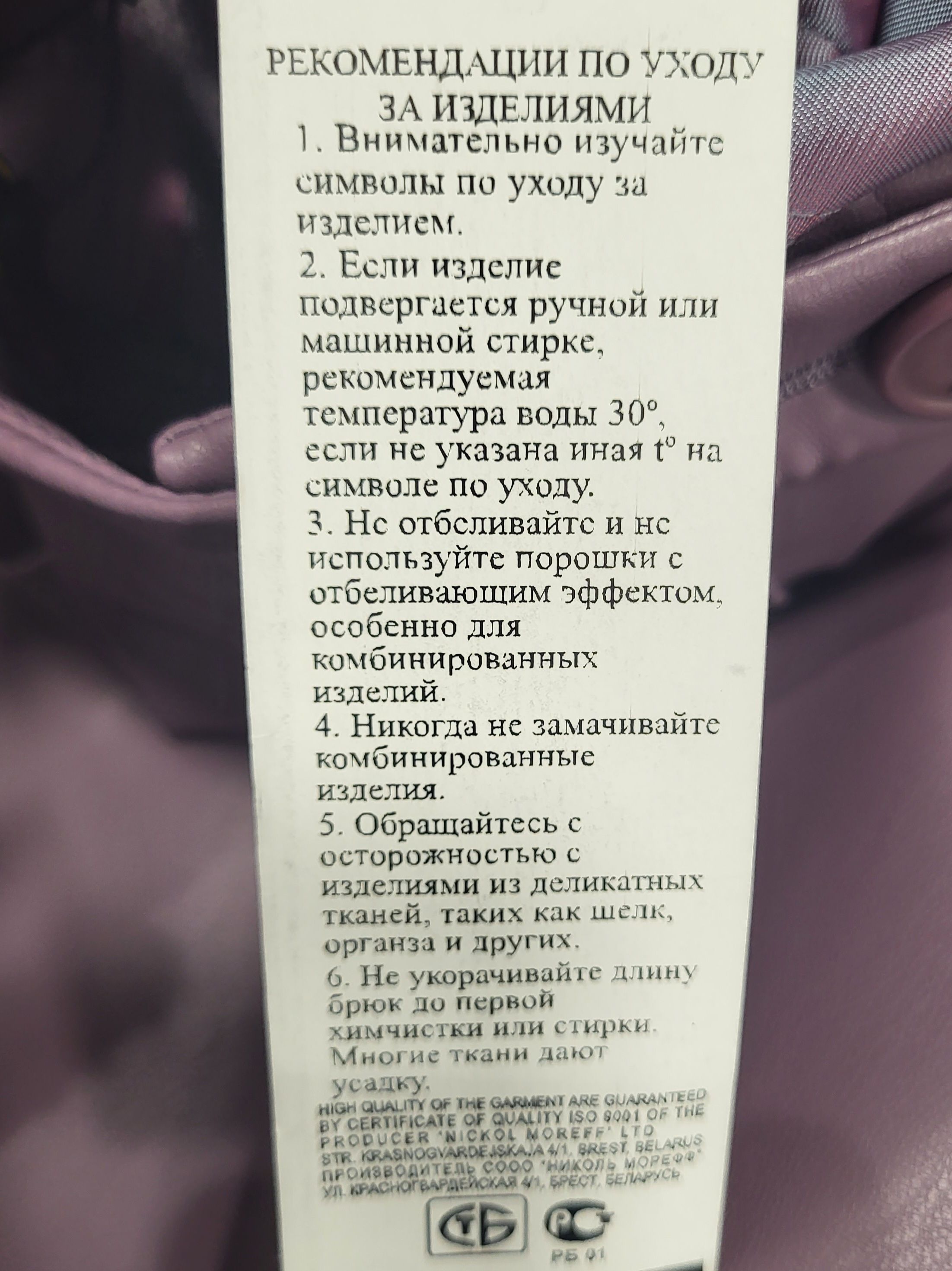 Рекомендации по уходу: Не стирать. Не отбеливать. Не отжимать. Гладить на минимальном температурном режиме наизнанку. Разрешена только щадящая чистка.