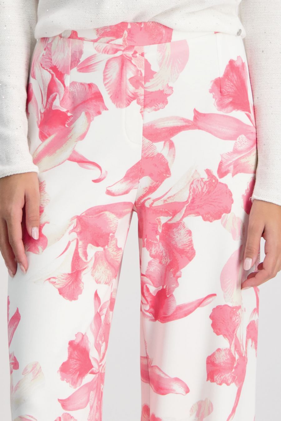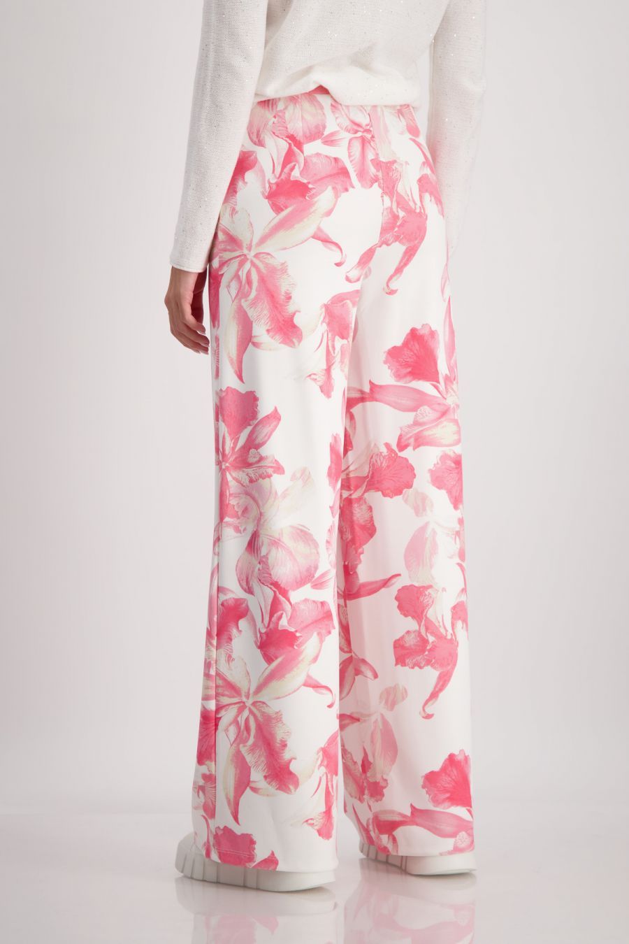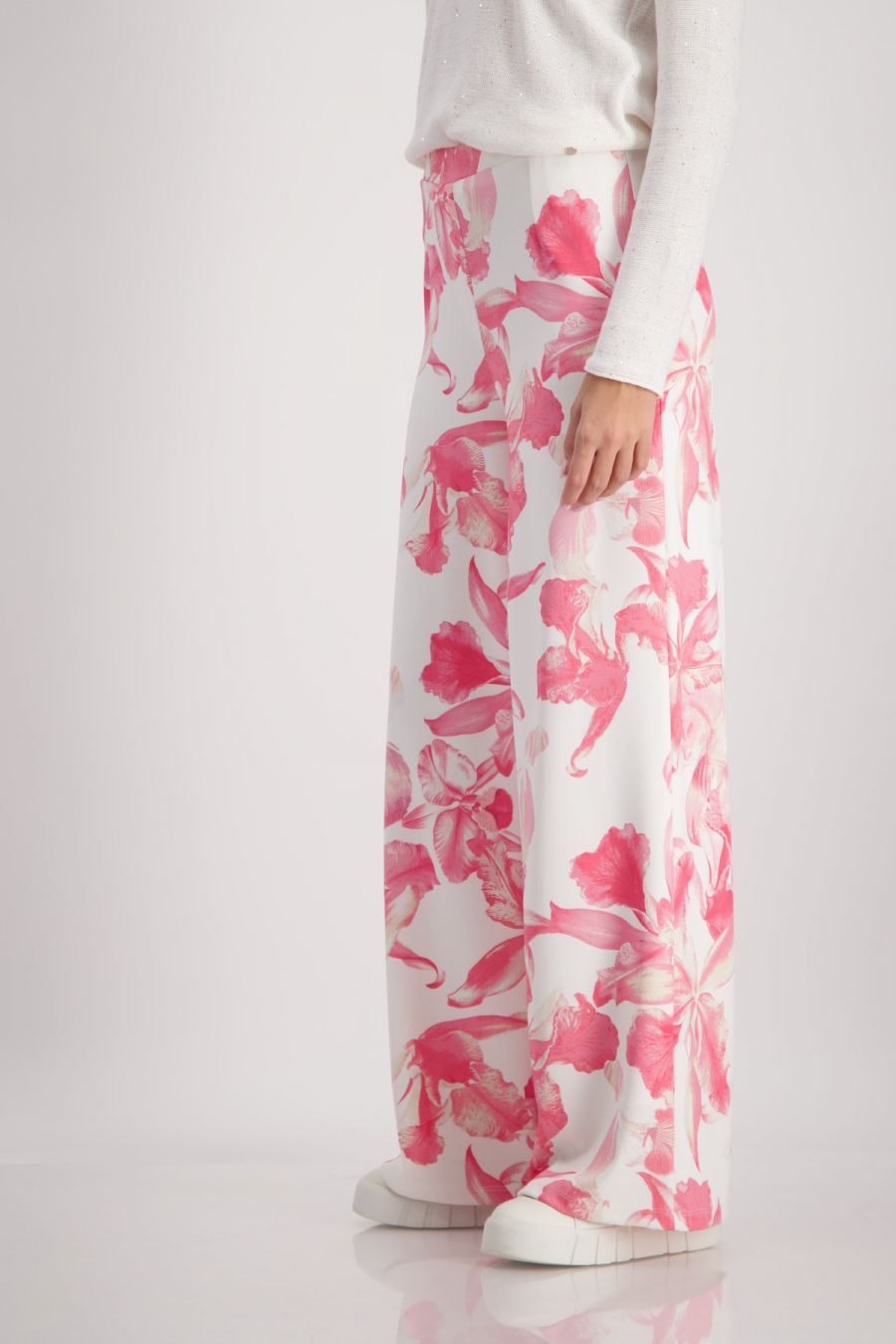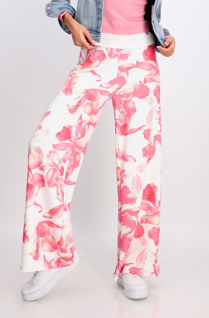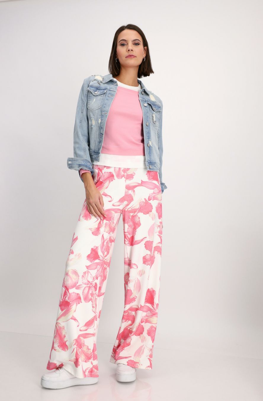 Широкие брюки с цветочным принтом из мягкого неопрена с резинкой на талии из новой коллекции весна-лето 2024 немецкого бренда Monari. Цвет: белый/коралловый (260). Принт: флористический. Бренд: Monari. Страна бренда: Германия. Коллекция: весна-лето 2024. Неопрен. Эластичный материал. Мягкий материал. Широкая модель. Цветочный узор по всей поверхности. Пояс на резинке. Рост модели 1,76 м, размер 34 (40 рос.). Длина внутренней штанины для всех размеров составляет 82 см. Состав материала: 60% полиэстер, 35% вискоза, 5% эластан. Рекомендации по уходу: Деликатная стирка при 30 градусах. Не отбеливать. Не отжимать. Гладить на минимальном температурном режиме наизнанку. Химчистка запрещена.