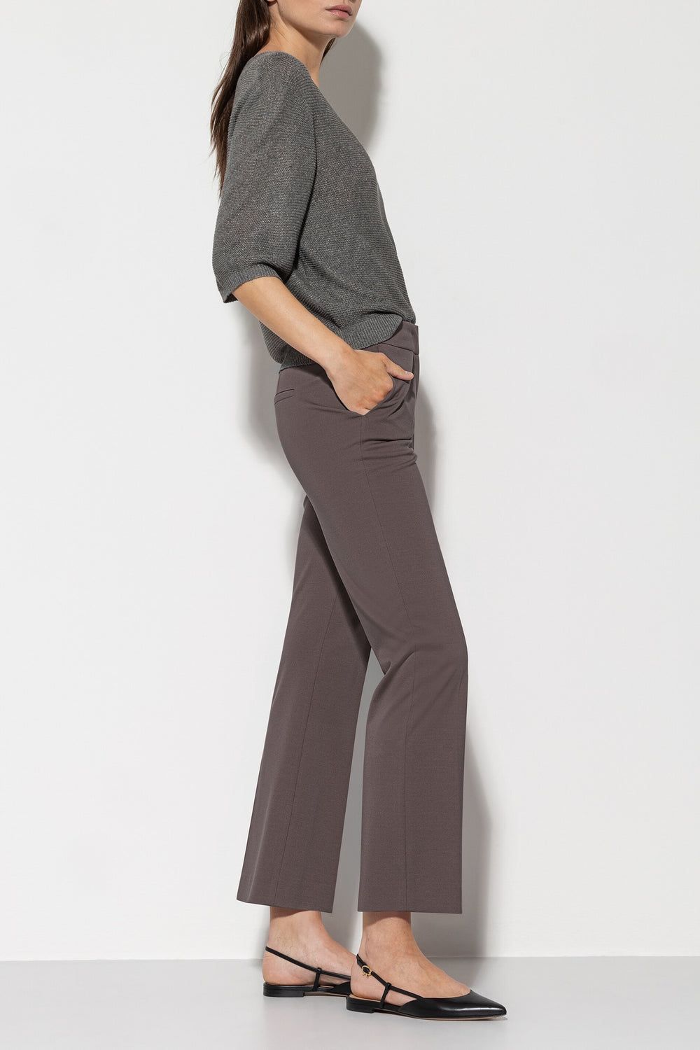 Слегка укороченные трикотажные брюки Babyflare в костюмном силуэте из мягкого материала пунто милано немецкого премиального бренда Luisa Cerano.