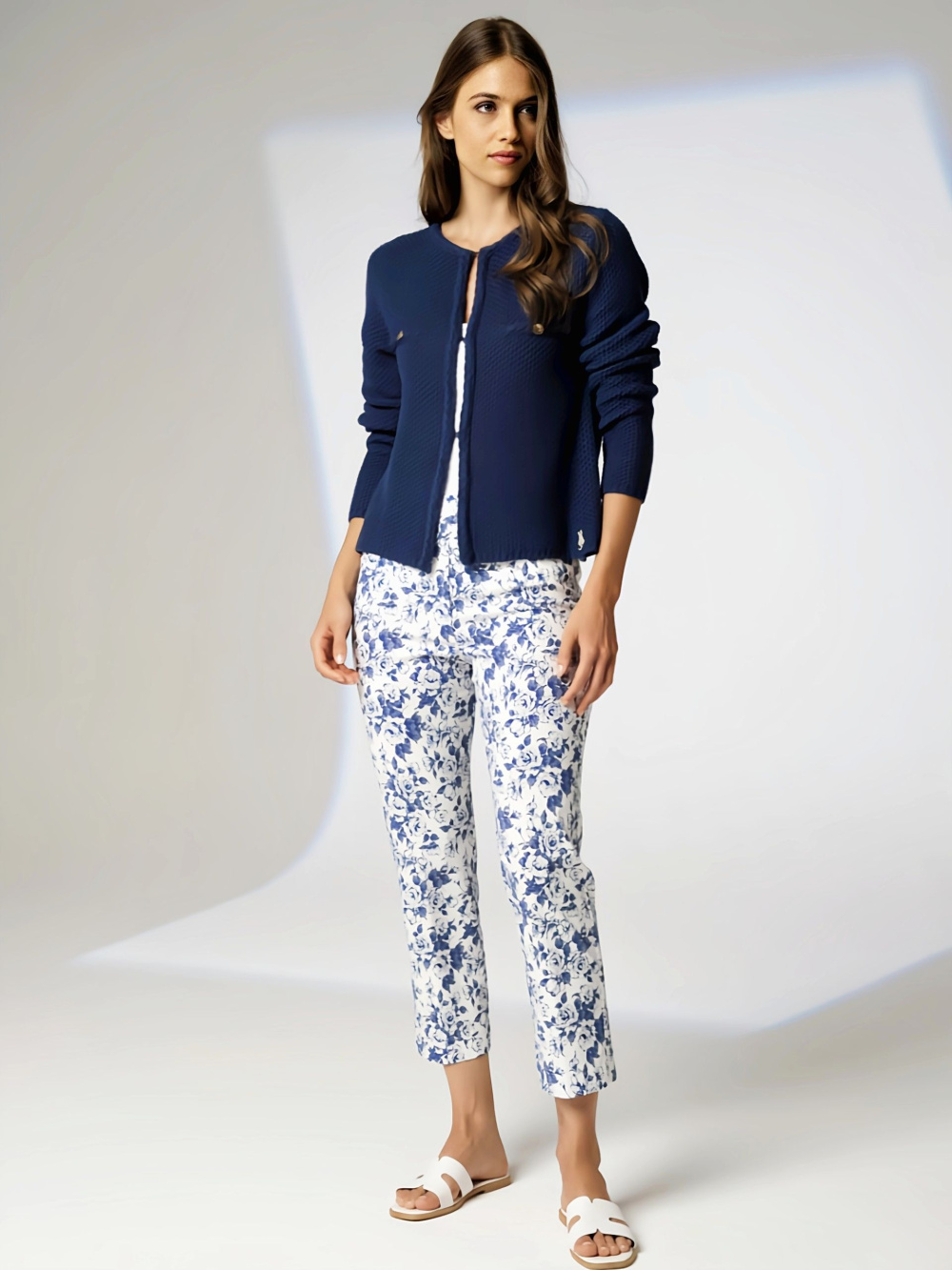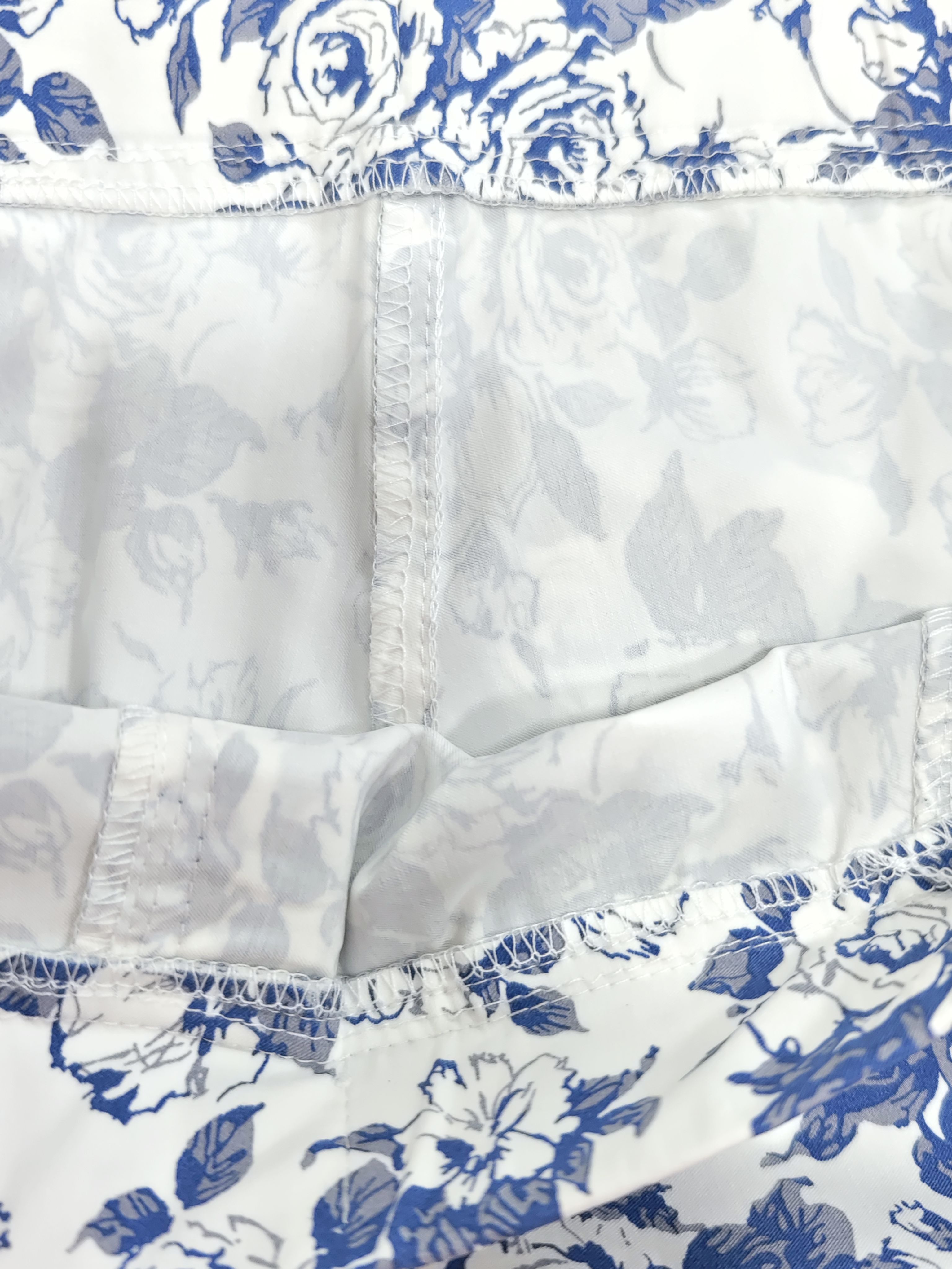 Брюки женские трикотажные укороченные из эластичного хлопка белого цвета с мелким цветочным принтом голубого цвета итальянского бренда Donne da Sogno.