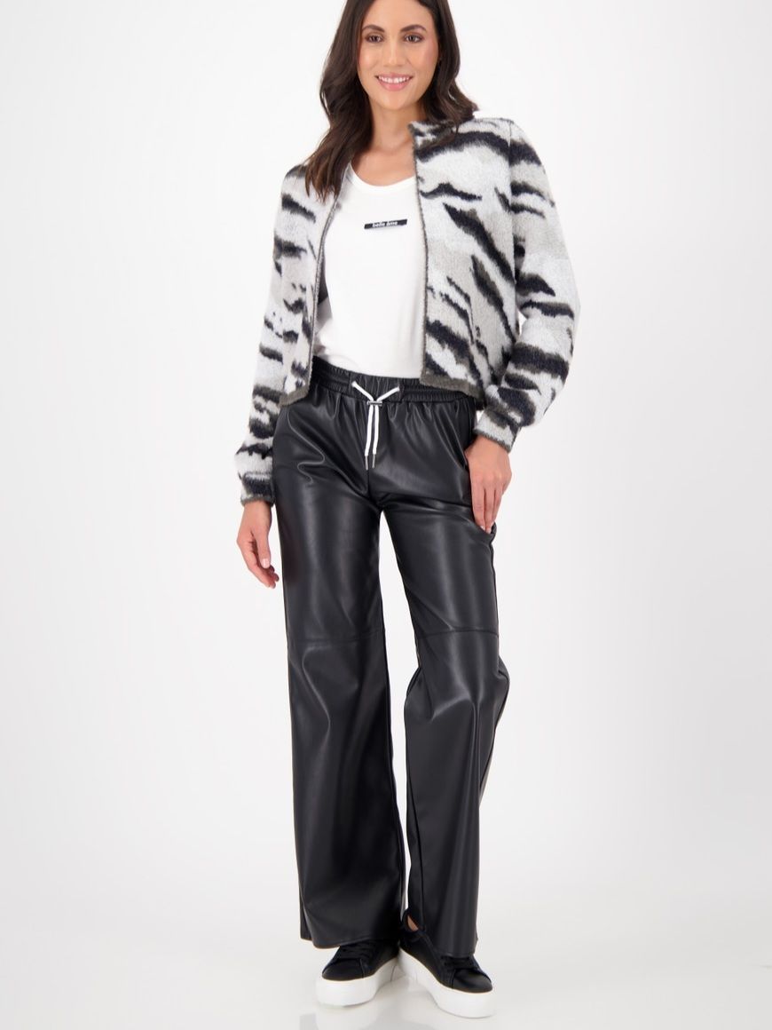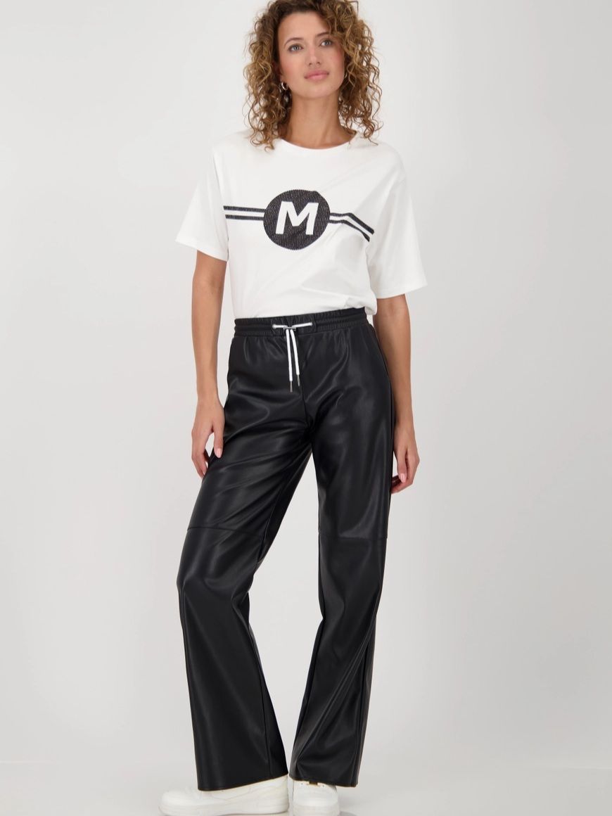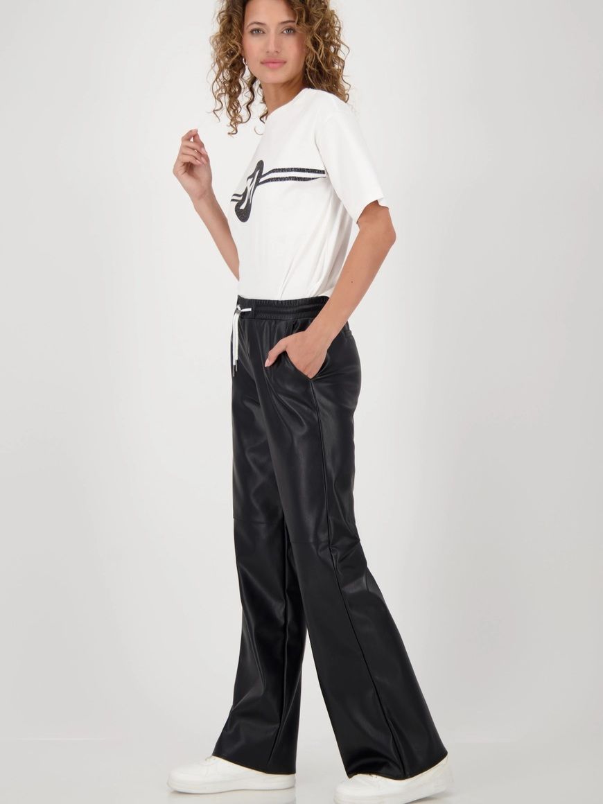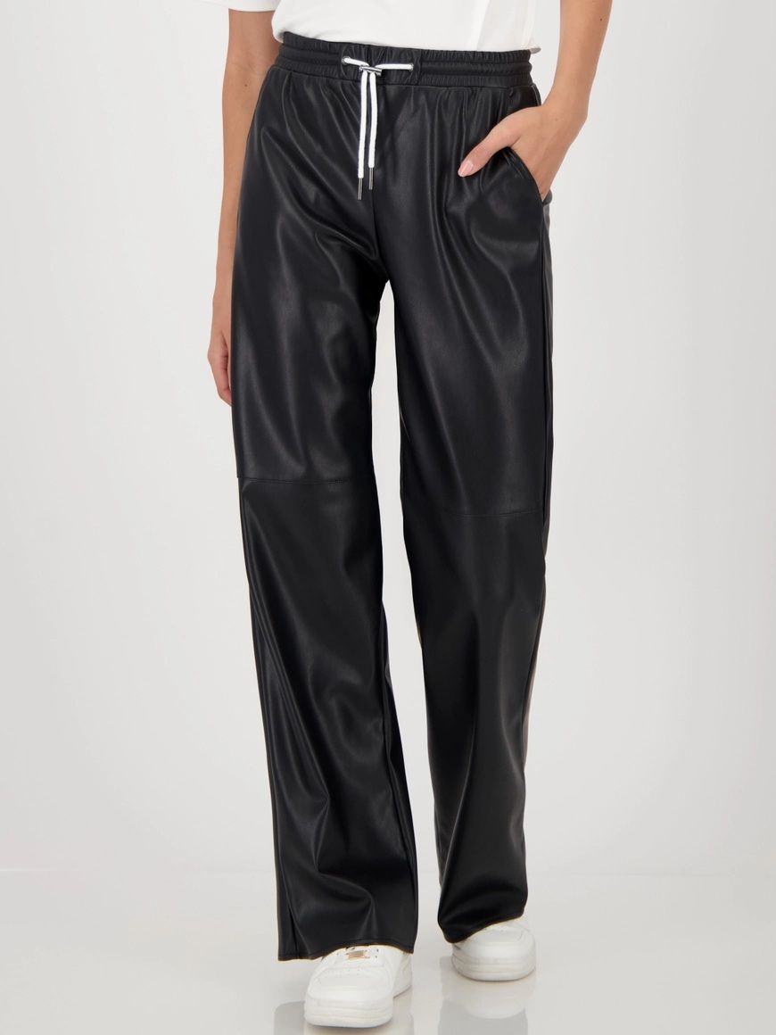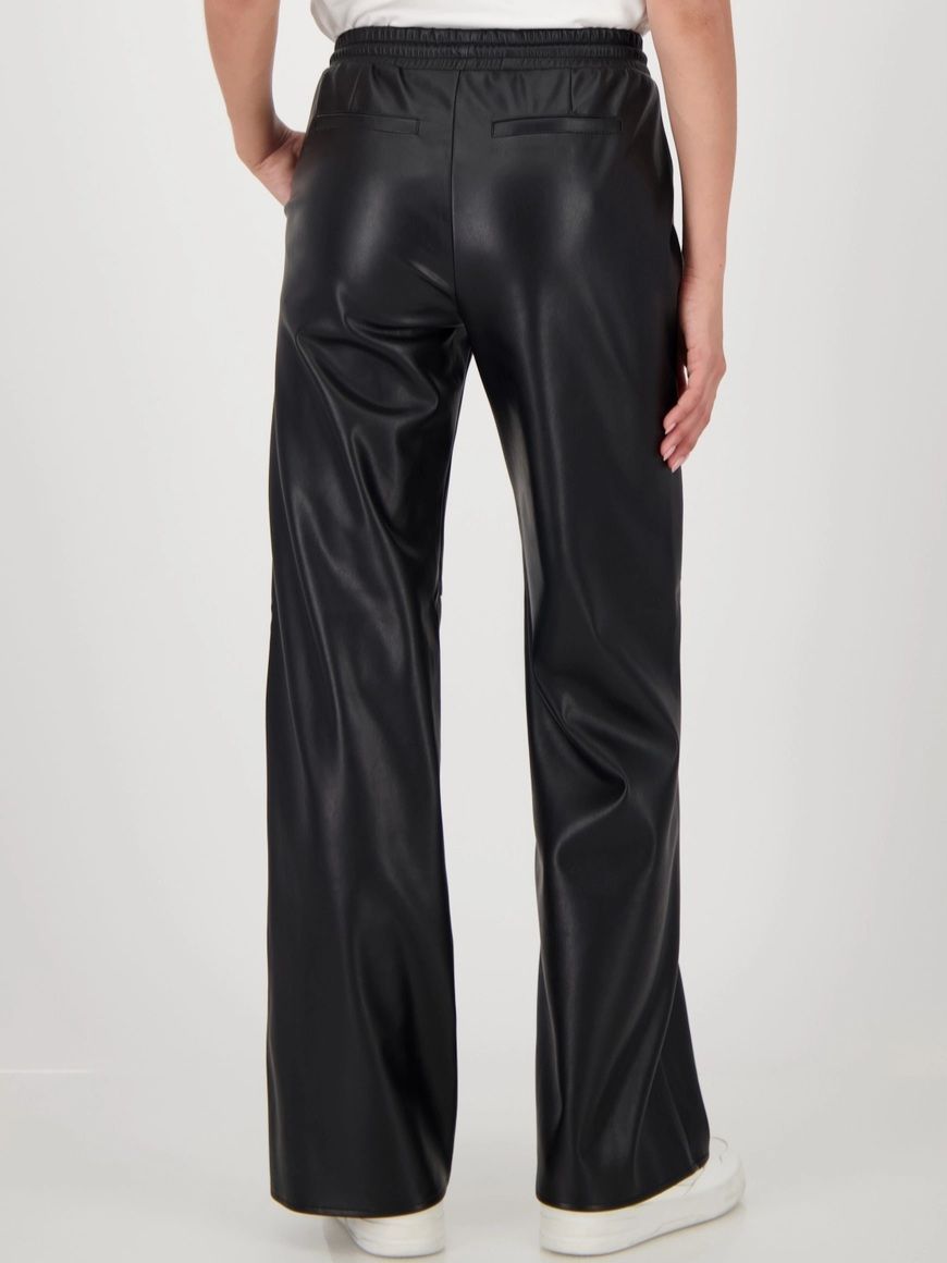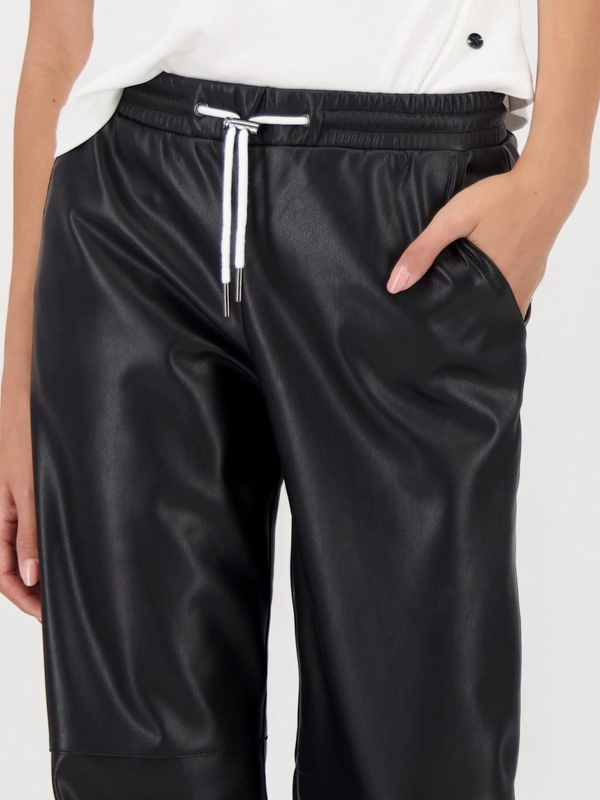 Стильные женские брюки немецкого бренда Monari из искусственной кожи с эластичным поясом, кулиской, боковыми карманами и накладными карманами — современные и универсальные.