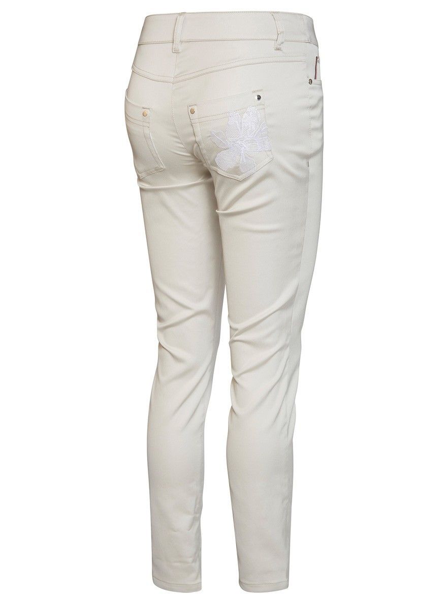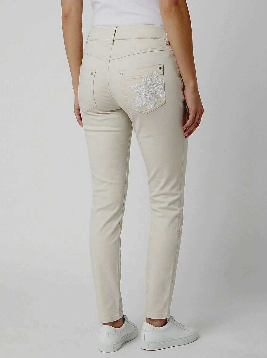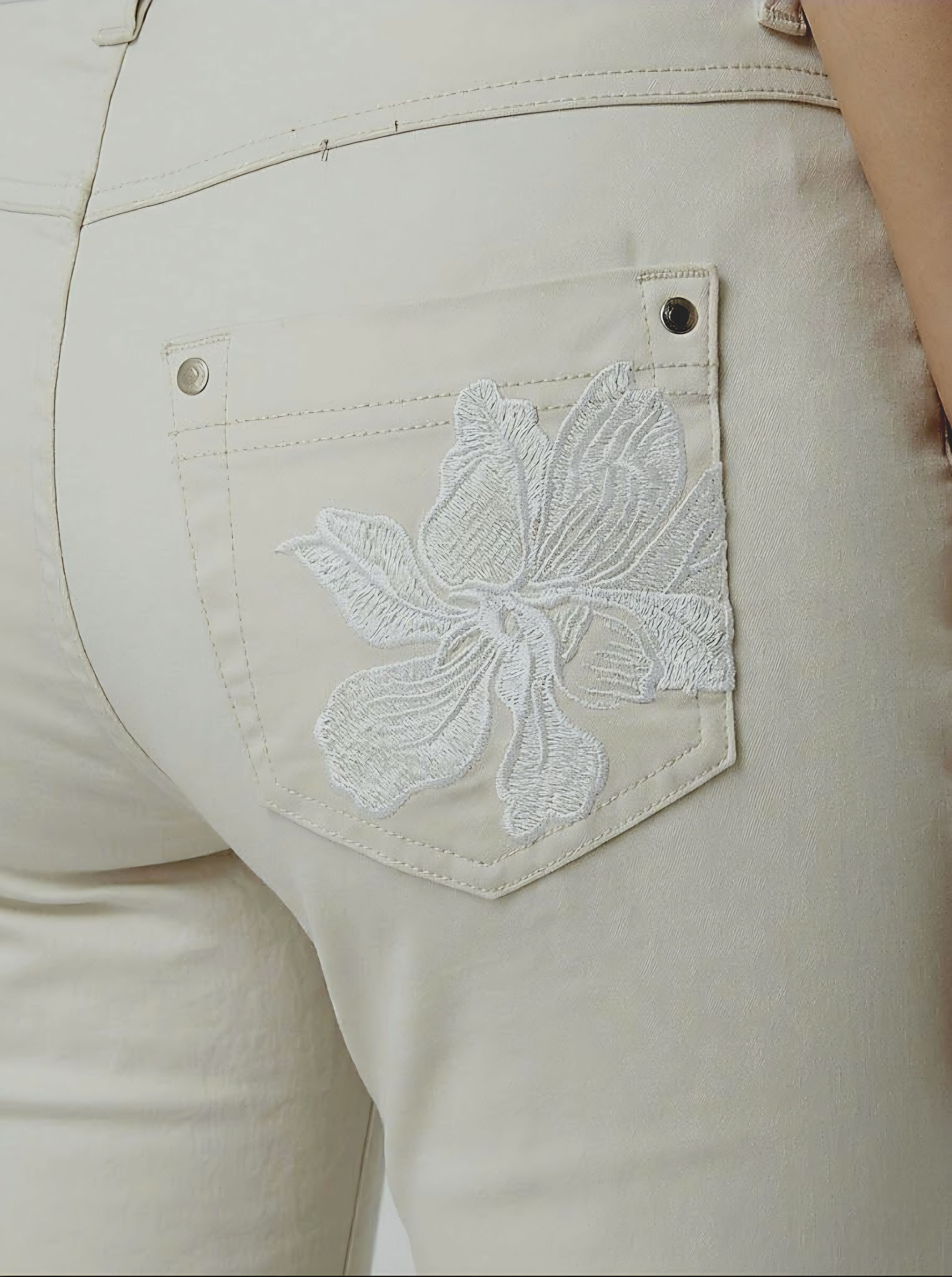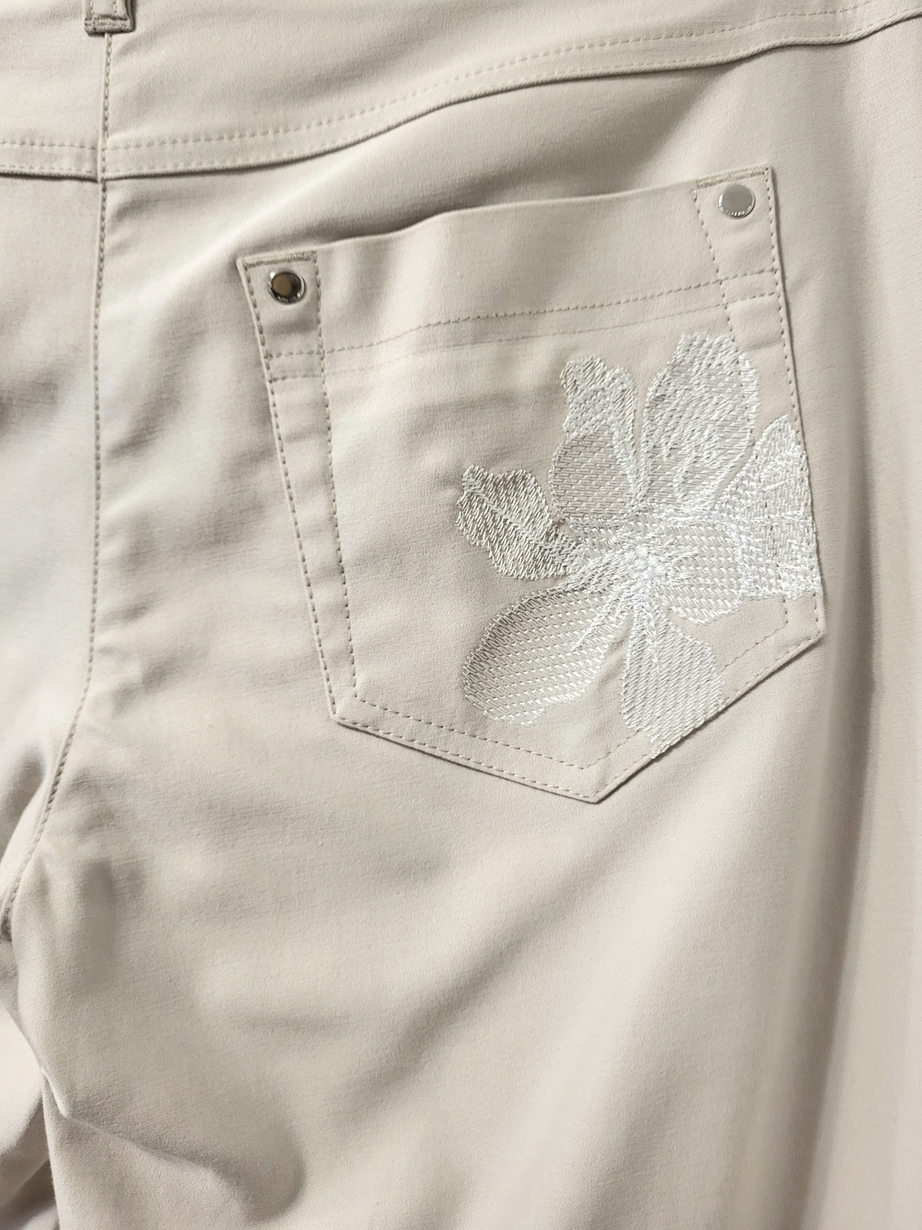 Вышивка в виде цветка белого цвета на кармане сзади.