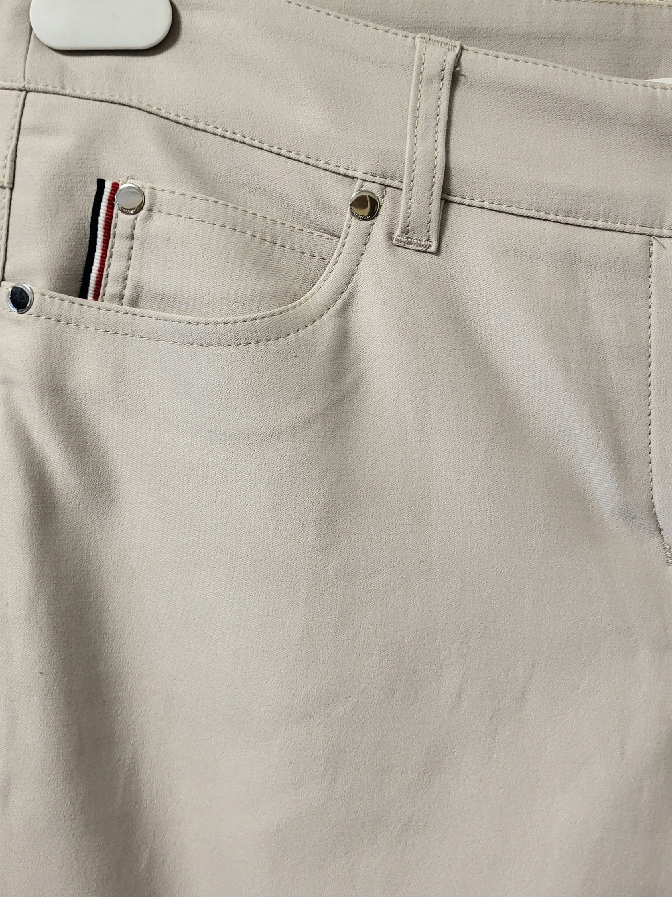 У модели прямой «пятикарманный» крой, притачной пояс со шлевками для ремня, застежка на крючок и молнию.