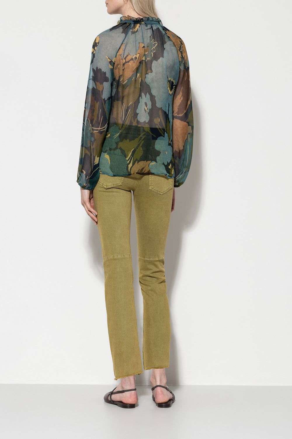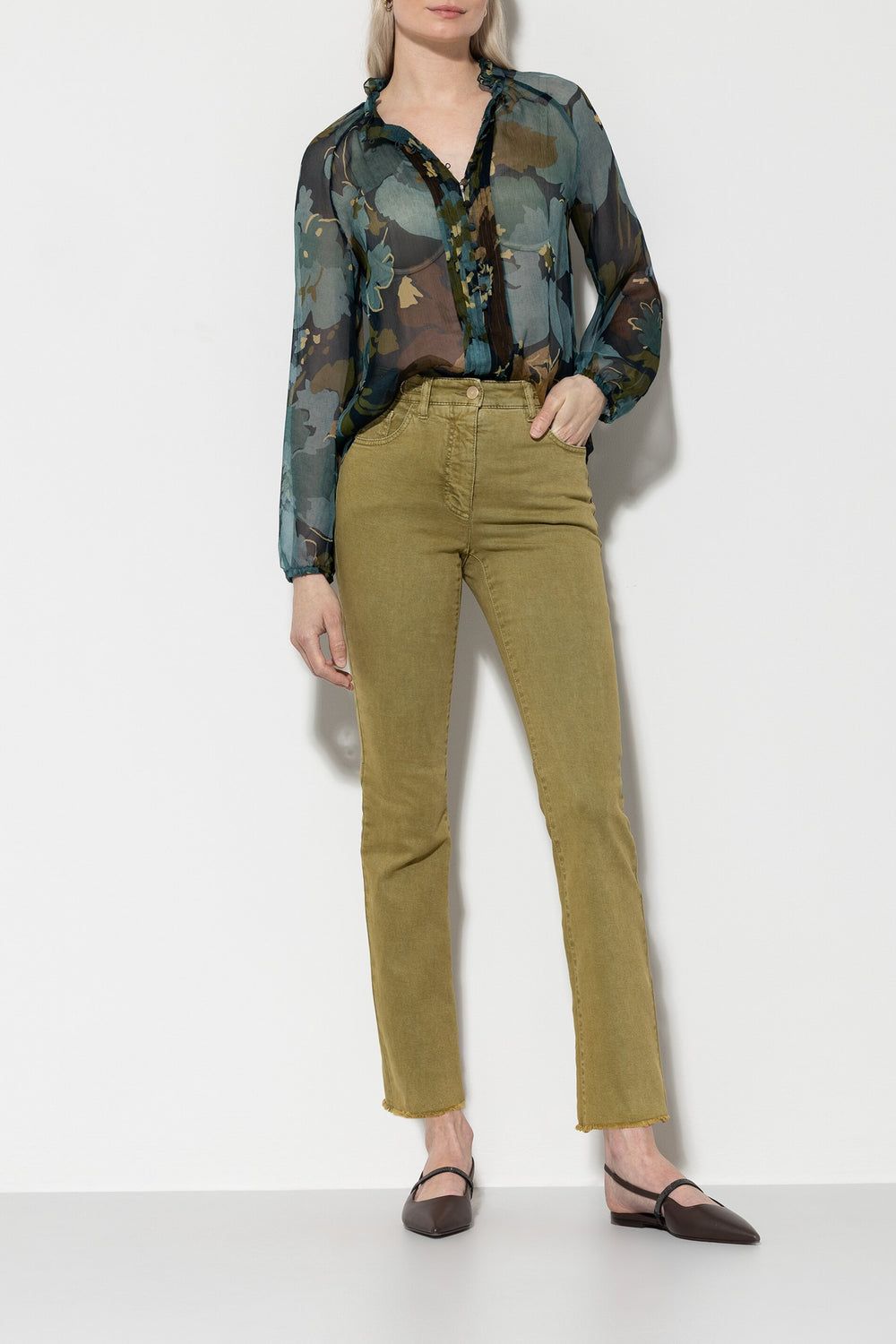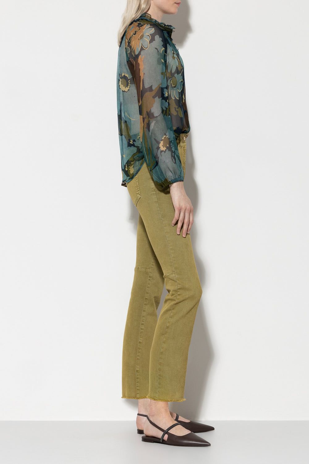 Необработанный край брючин подчеркнут короткой бахромой.