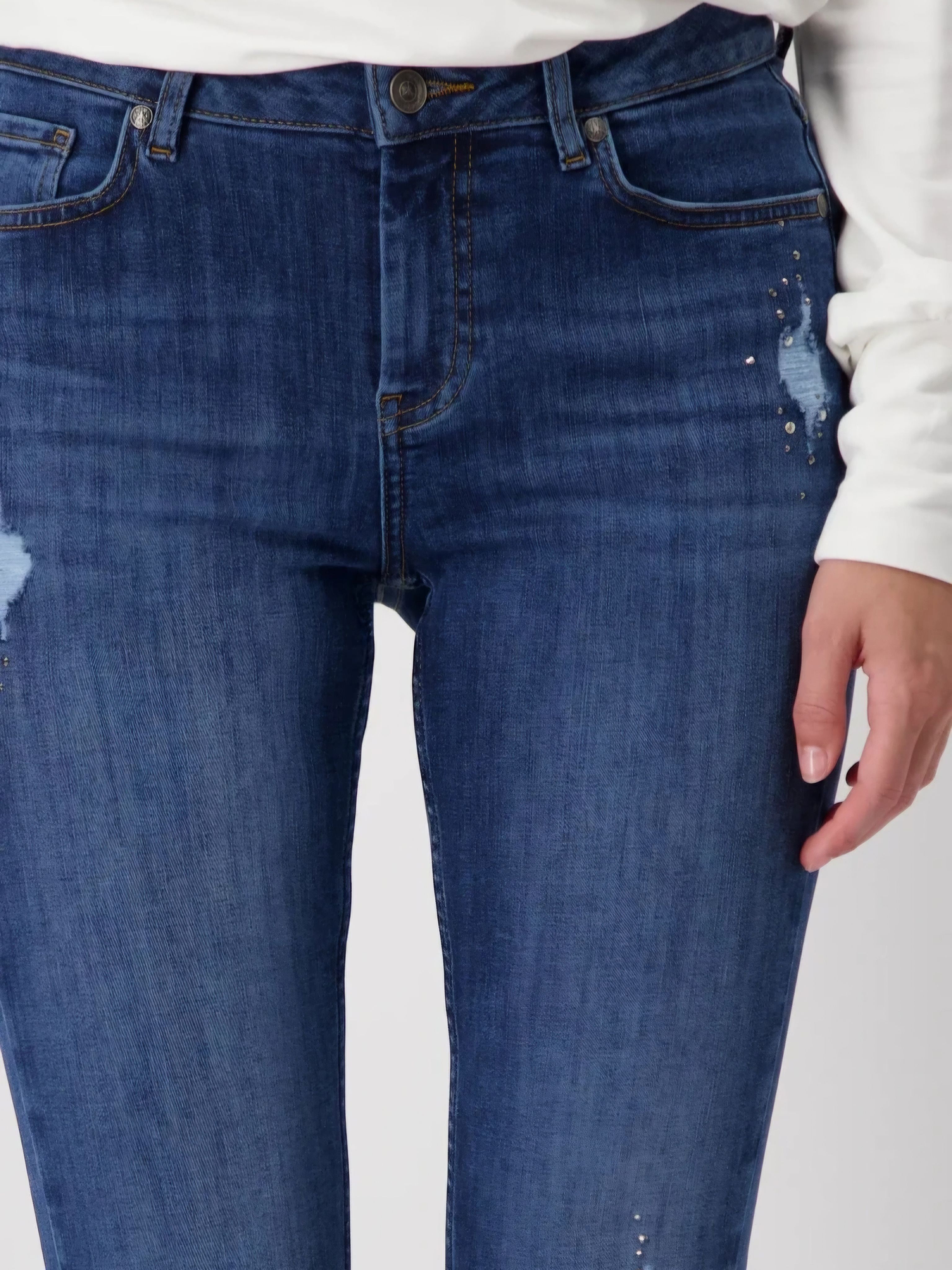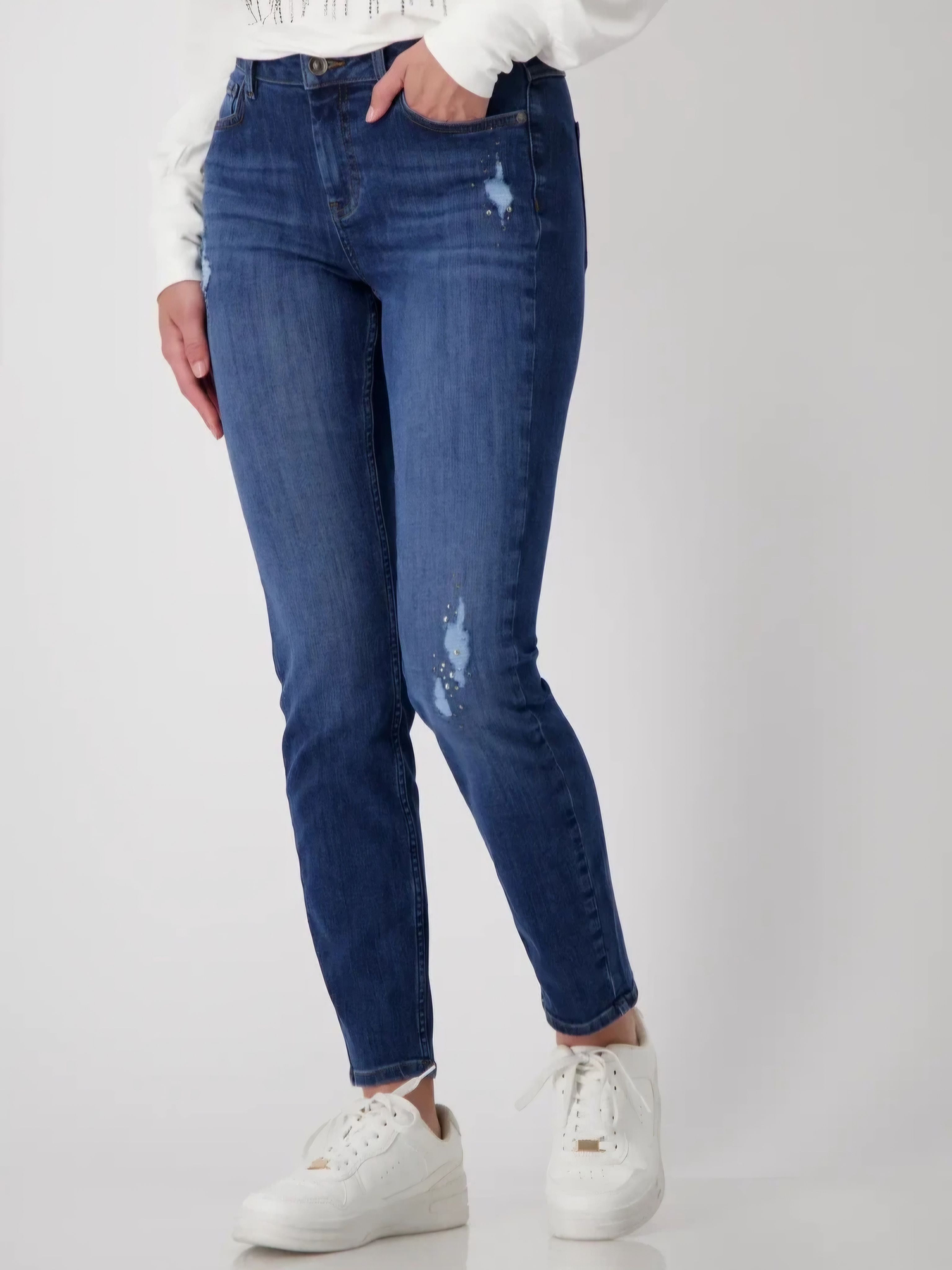 Джинсы с потертостями и стразами из коллекции осень-зима 2024 немецкого бренда Monari. Цвет: синий джинс. Бренд: Monari. Страна бренда: Германия. Коллекция: осень-зима 2024. Наши потертые джинсы со стразами придадут каждому наряду что-то особенное. Изготовлены из высококачественной смеси хлопка и эластичного материала для оптимального комфорта. Высококачественная смесь хлопка. Эластичный материал. Отделка стразами. Зауженная модель. Нормальная высота талии. 5-карманный стиль. Рост модели 1,74 м, размер 34 (40-42). Длина внутренней штанины для всех размеров составляет 74 см. Состав материала: 80% хлопок, 17% полиэстер, 3% эластан. Страна производства: Турция. Рекомендации по уходу: Специальный щадящий режим стирки (30°C). Не отбеливать. Не сушить в стиральной машине. Гладить с максимальной температурой подошвы 110 °C (гладить с паром нельзя). Не подвергать химической чистке.