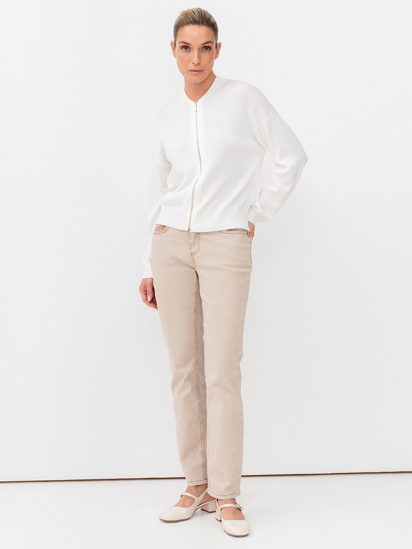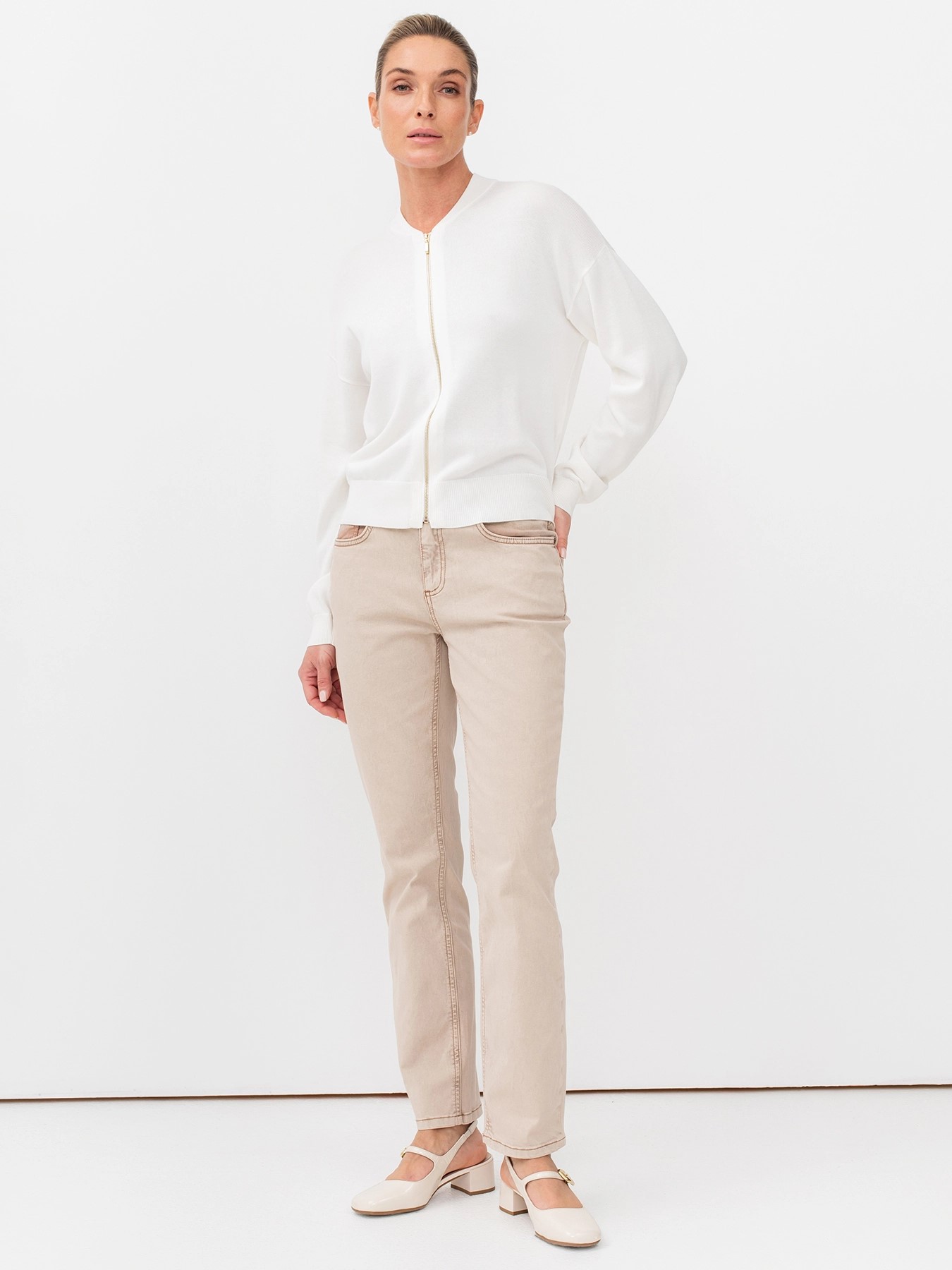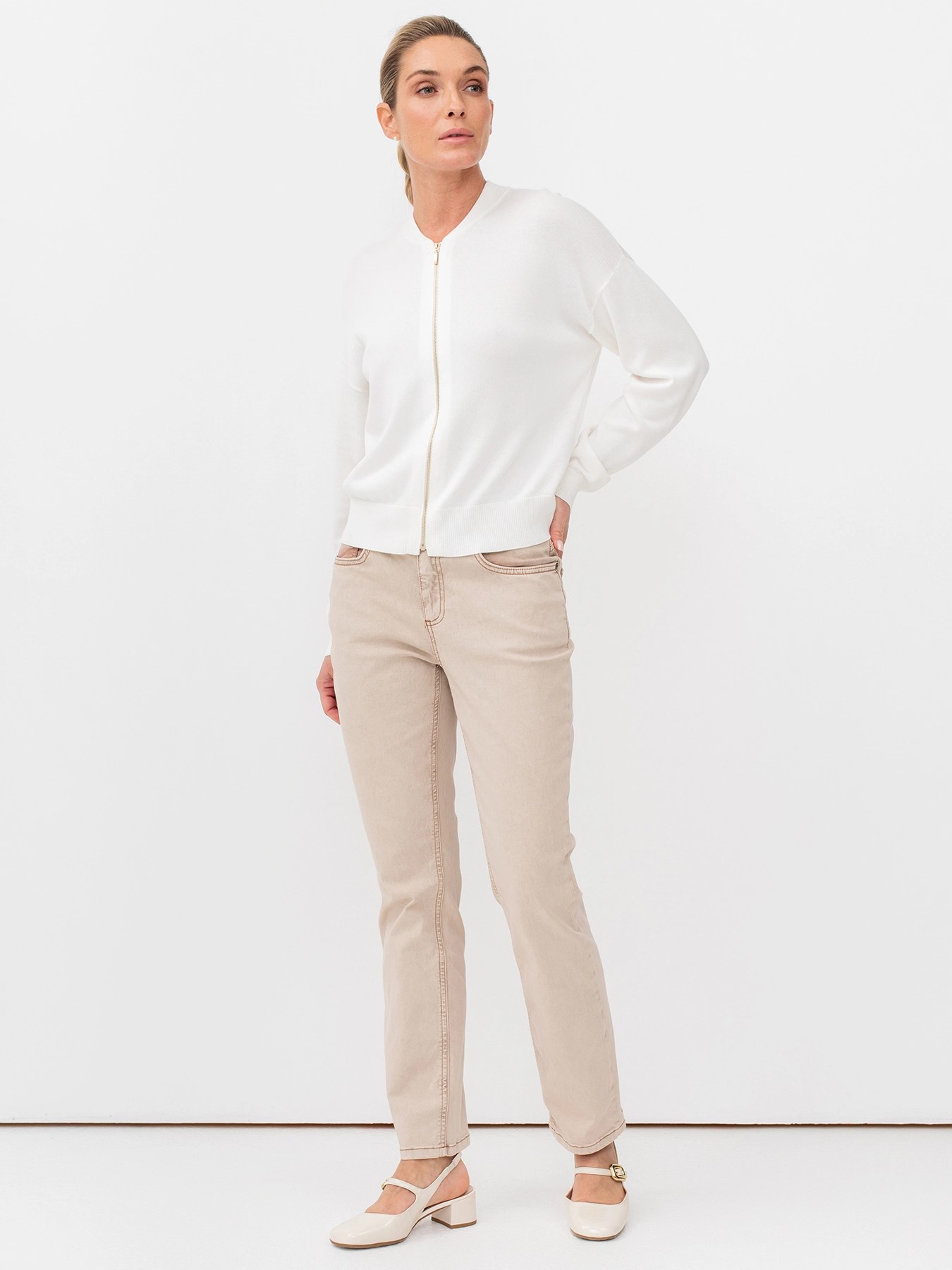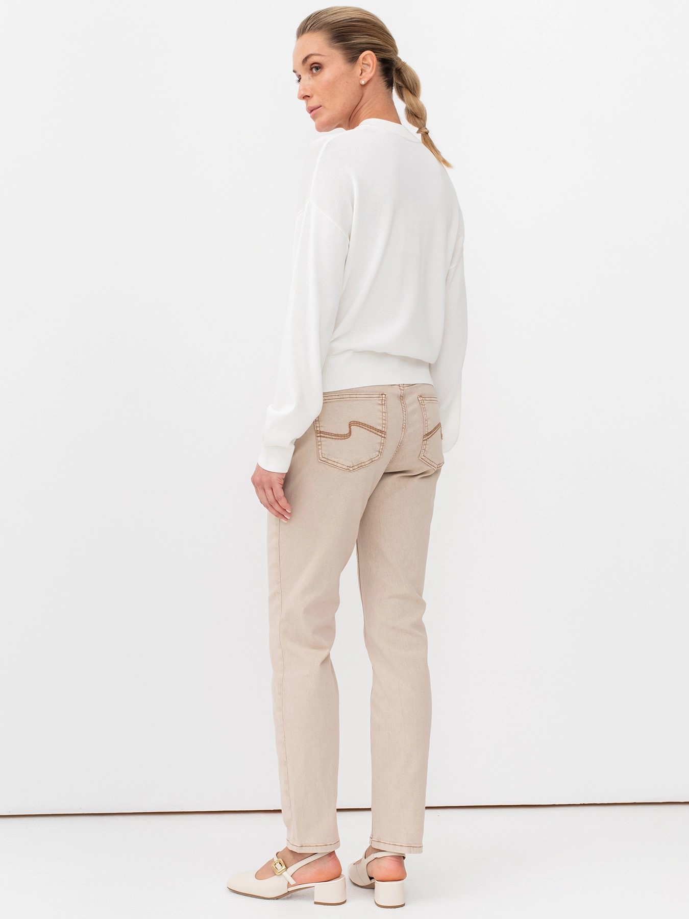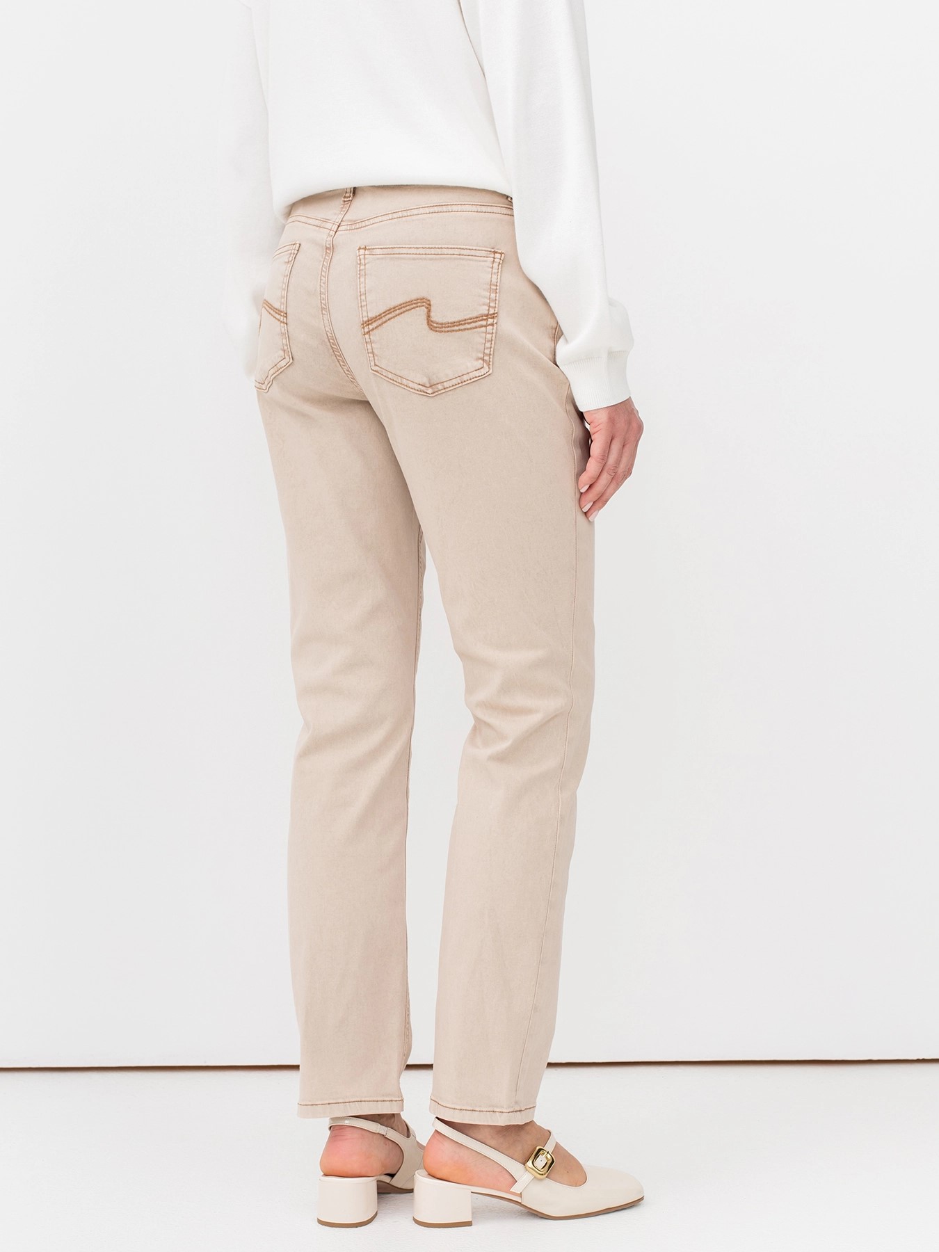 Бежевые женские джинсы прямого кроя с мраморной варкой и контрастными швами немецкого бренда Bulmer.