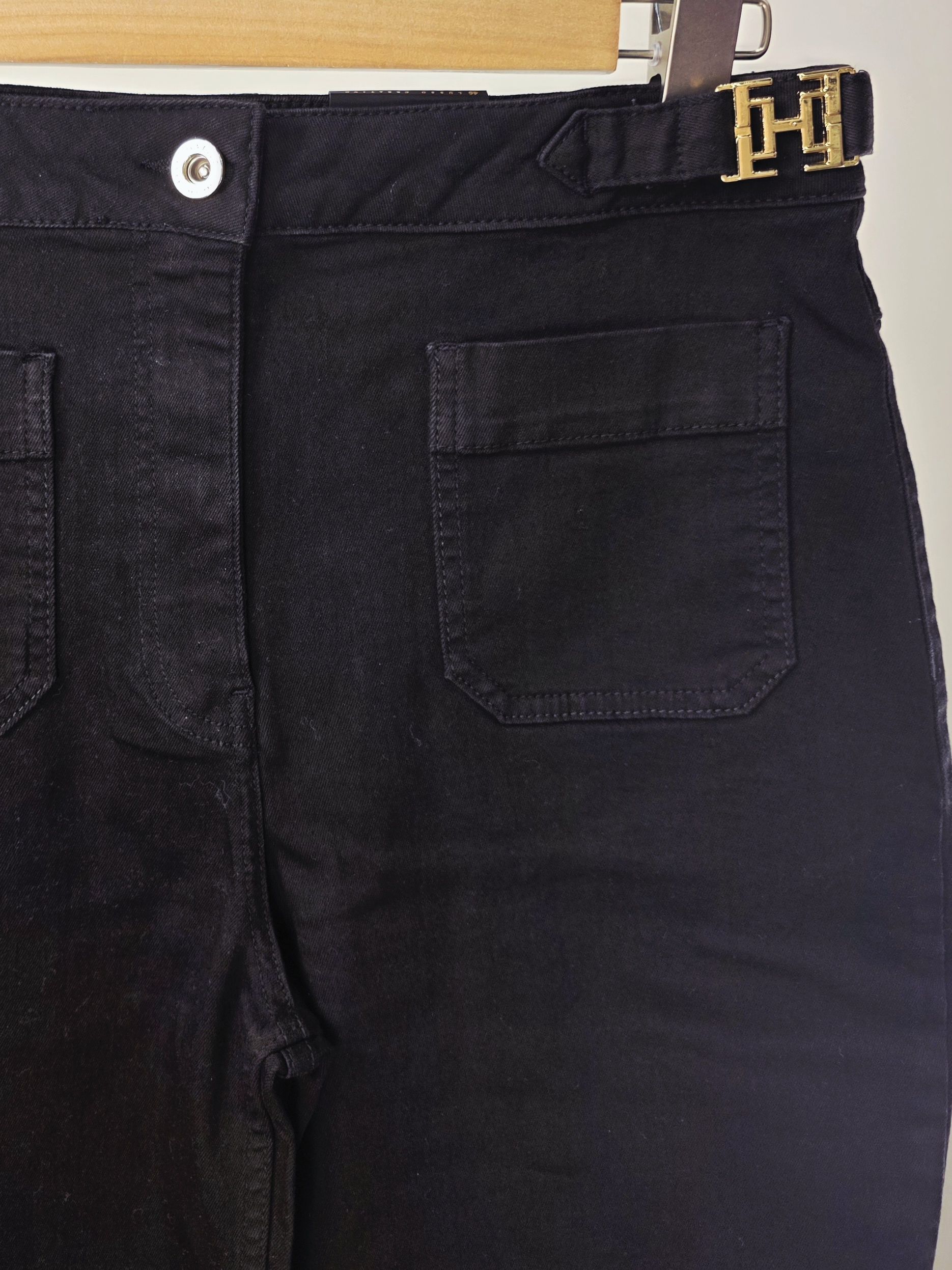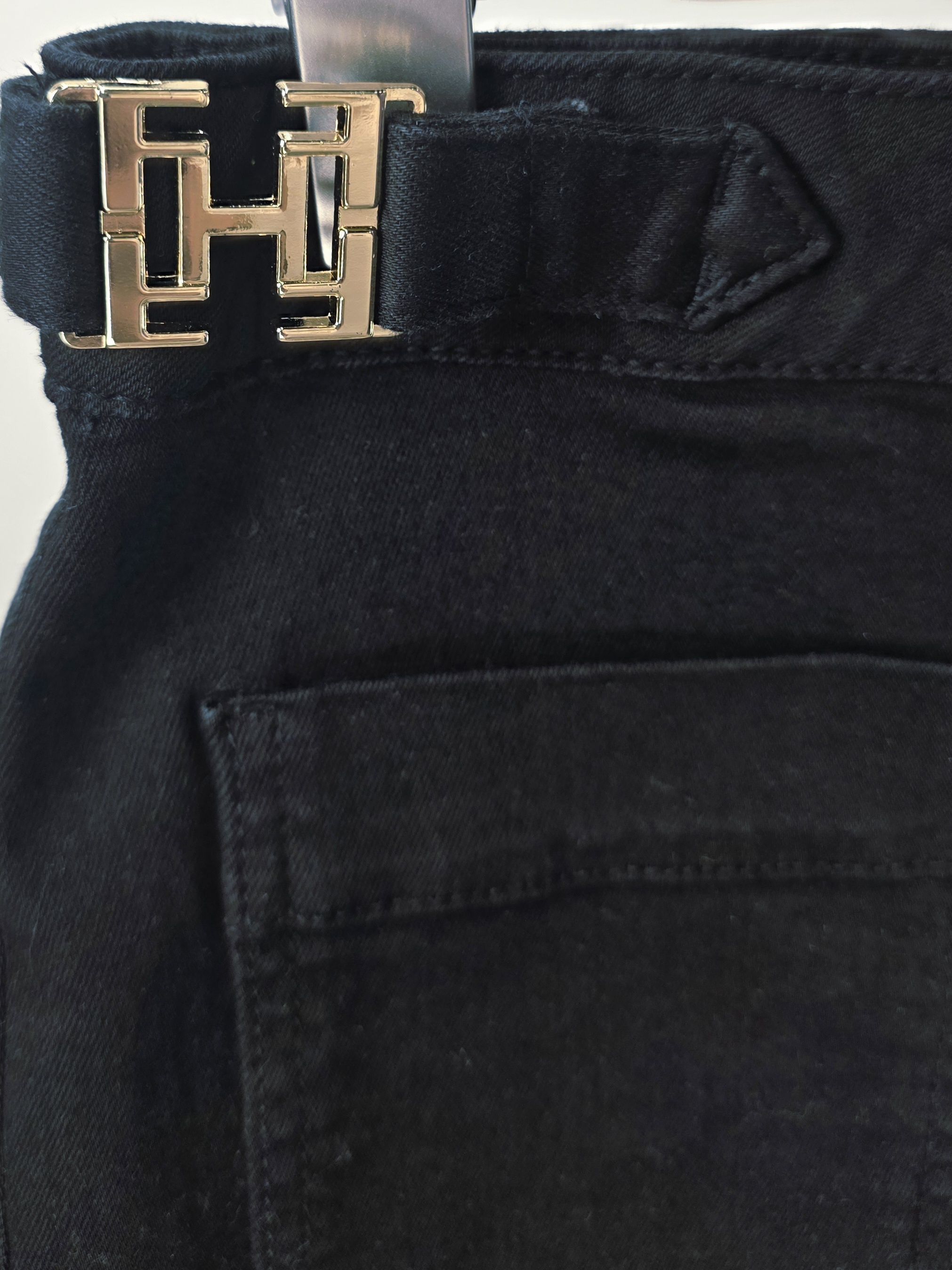 Джинсовые женские брюки (джинсы) прямого кроя из плотной хлопковой ткани с эластаном матового чёрного цвета и декоративными золотистыми пряжками на поясе итальянского бренда Franco Vello.