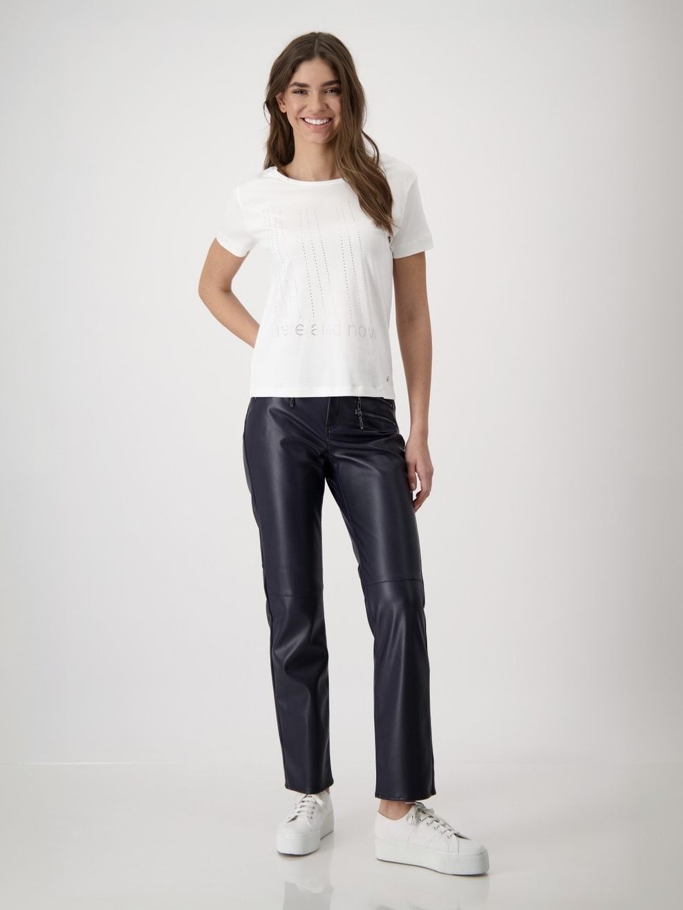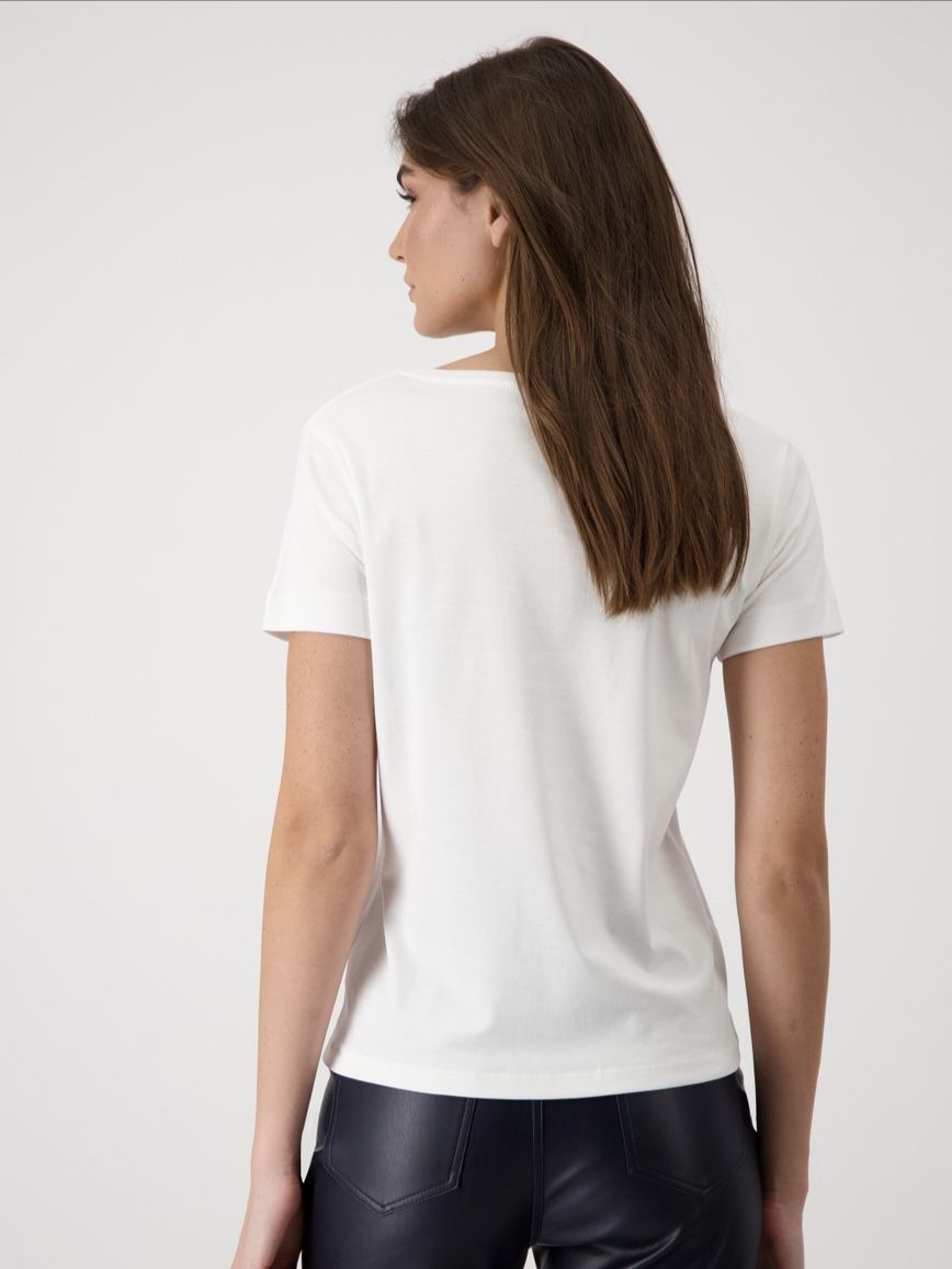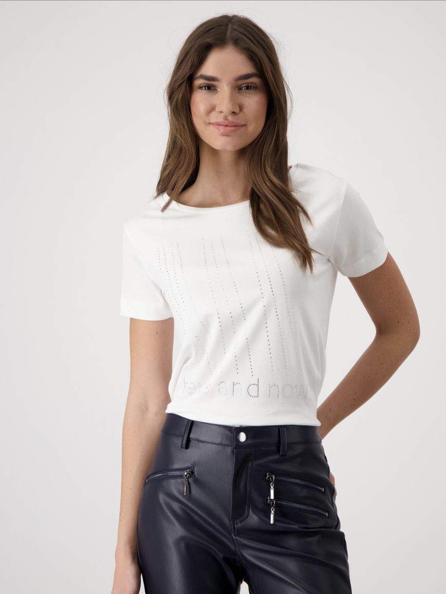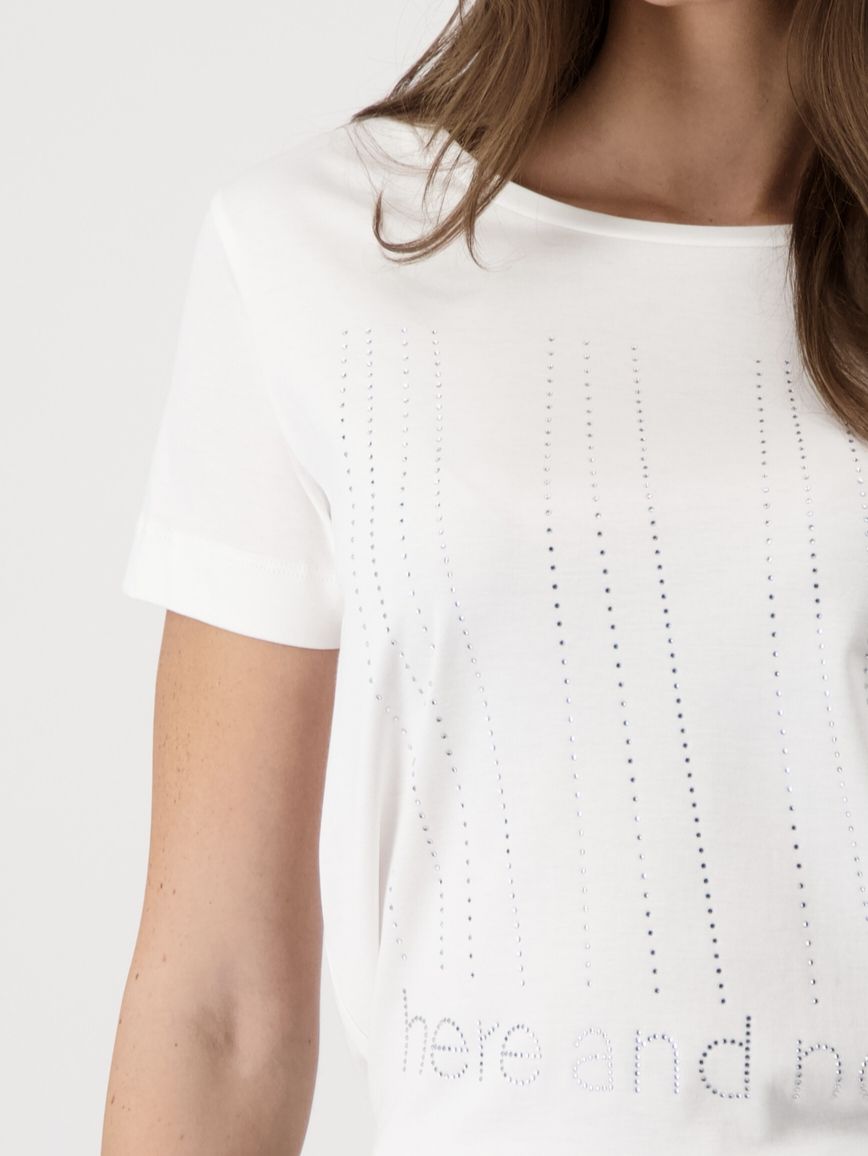 Эта футболка из 100% хлопка из коллекции весна-лето 2025 немецкого бренда Monari впечатляет своей мягкостью и элегантной надписью «Здесь и сейчас», выполненной из сверкающих страз.