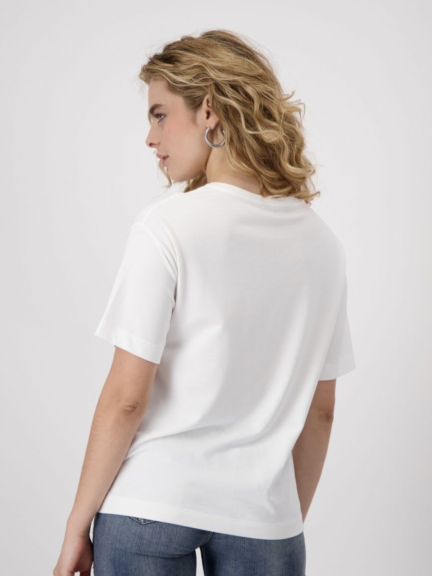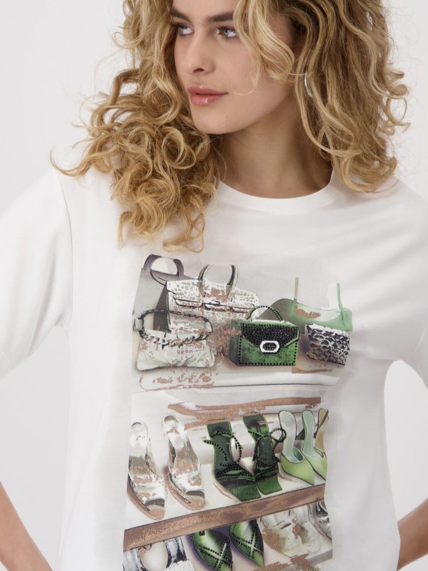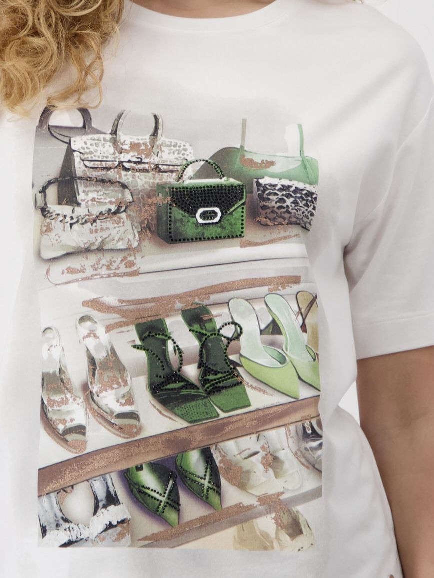 Эта футболка из коллекции весна-лето 2025 немецкого бренда Monari, выполненная из высококачественной хлопково-модальной смеси, впечатляет своим стильным принтом в виде обуви и сумки, украшенным сверкающими стразами.