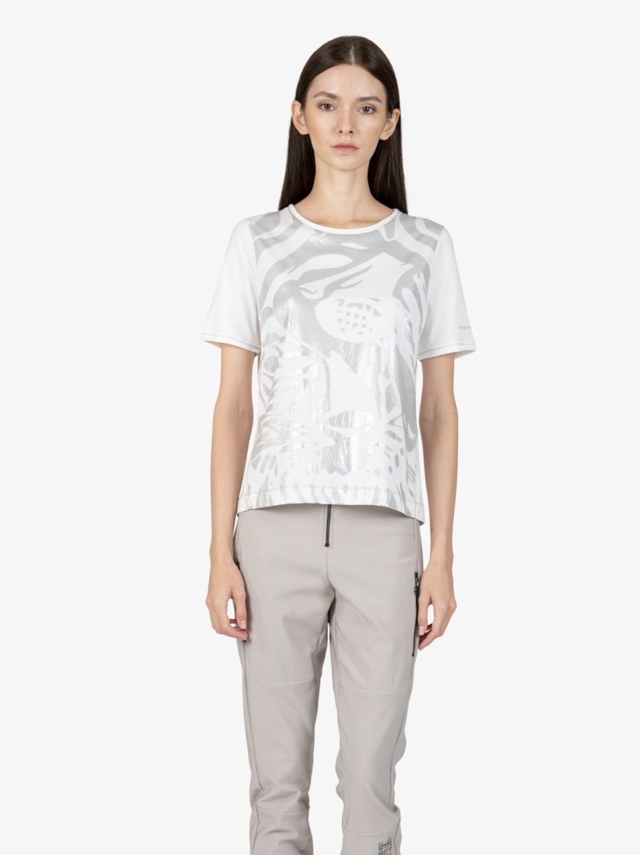 Футболка женская с абстрактным принтом, коротким рукавом и круглым вырезом из коллекции весна-лето 2025 австрийского премиального бренда Sportalm идеально подходит модницам.