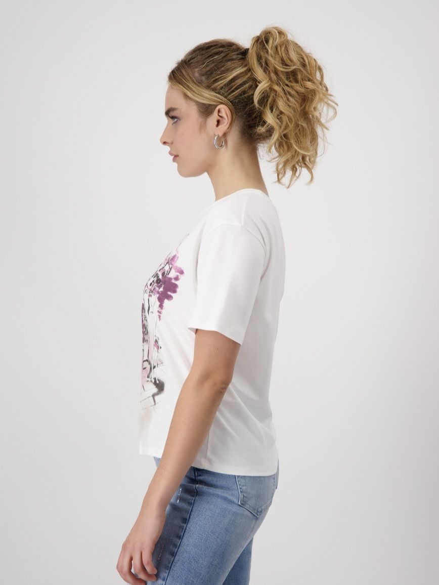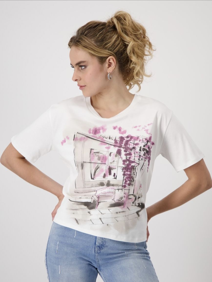 Эта футболка из 100% хлопка немецкого бренда Monari впечатляет своим городским принтом с собакой и классическим круглым вырезом. Идеально подходит для повседневного образа с короткими рукавами.