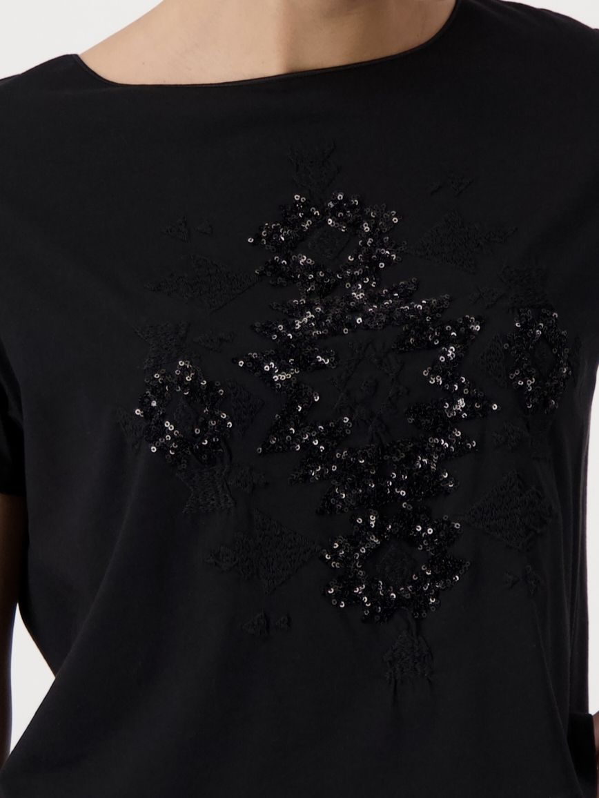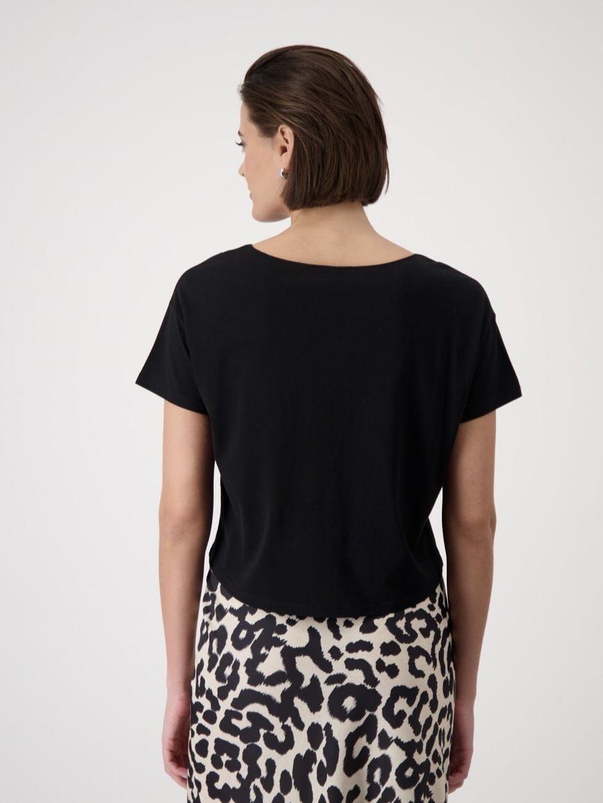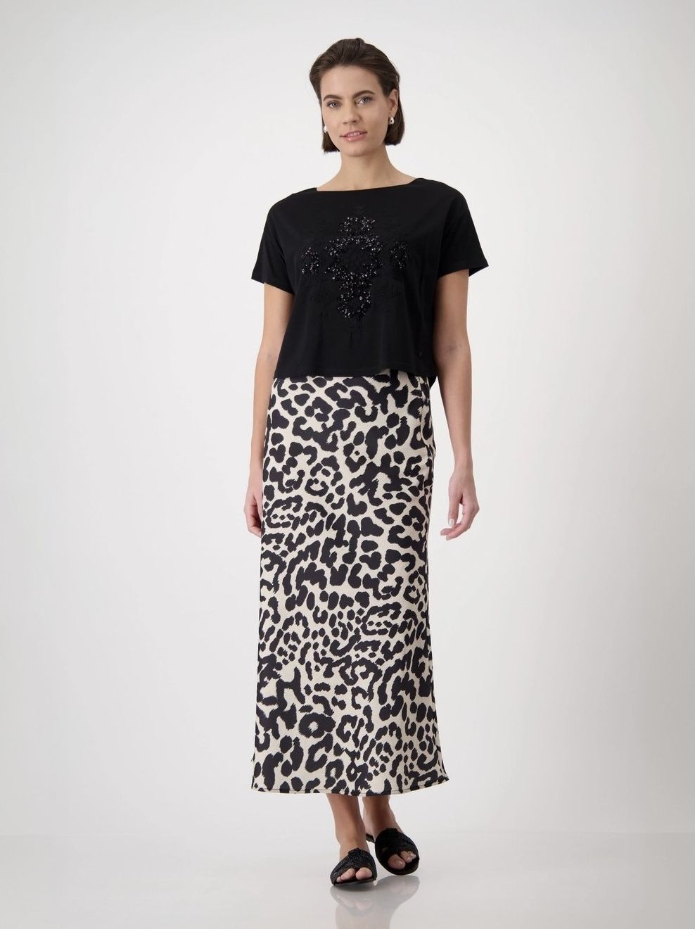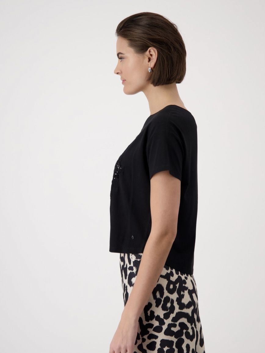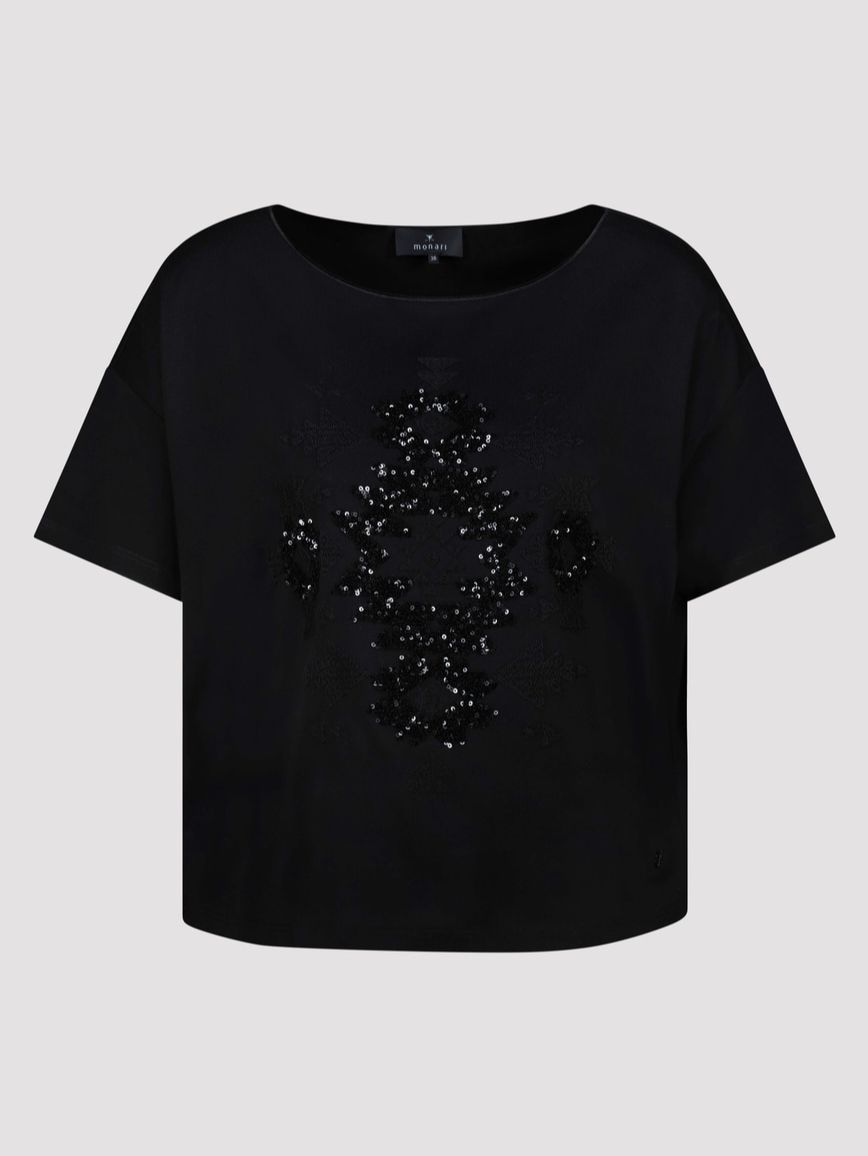 Эта футболка из 100% хлопка немецкого бренда Monari впечатляет своей мягкостью и элегантной надписью «Здесь и сейчас», выполненной из сверкающих страз.