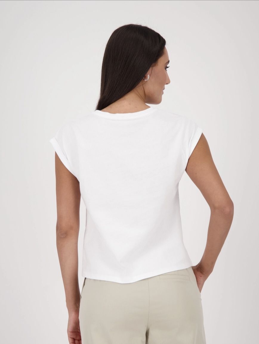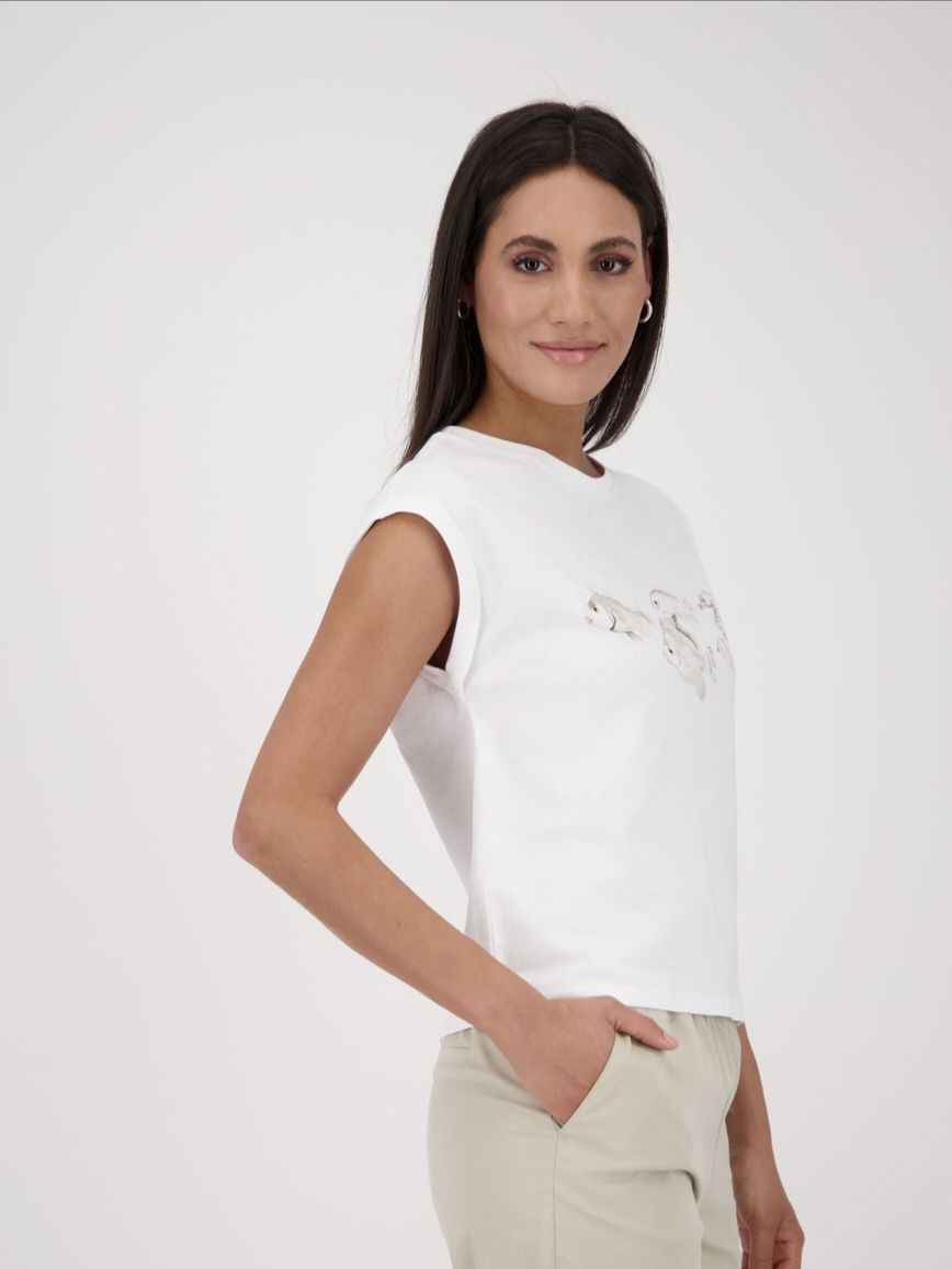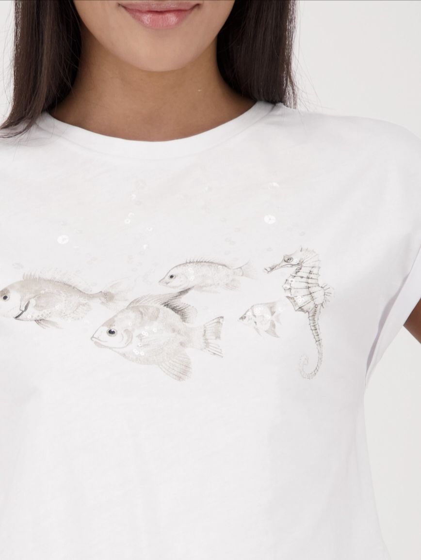 Эта футболка немецкого бренда Monari с изображением рыбок изготовлена из 100% хлопка и украшена сверкающими блёстками.