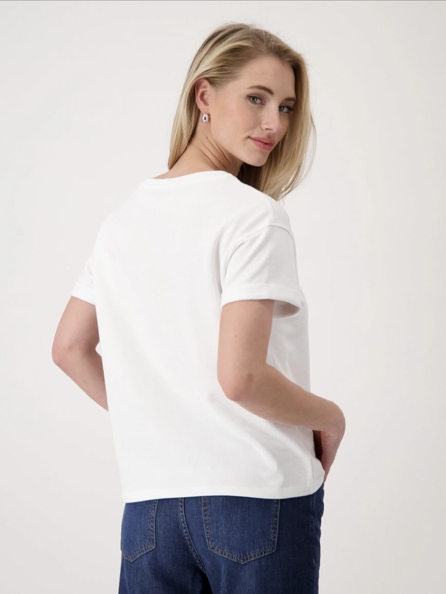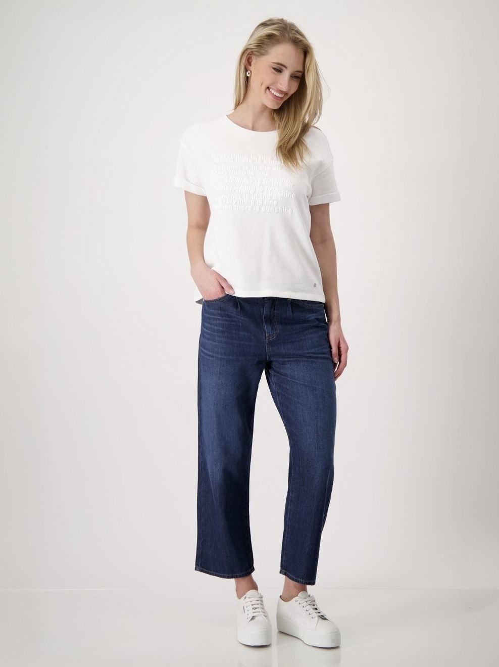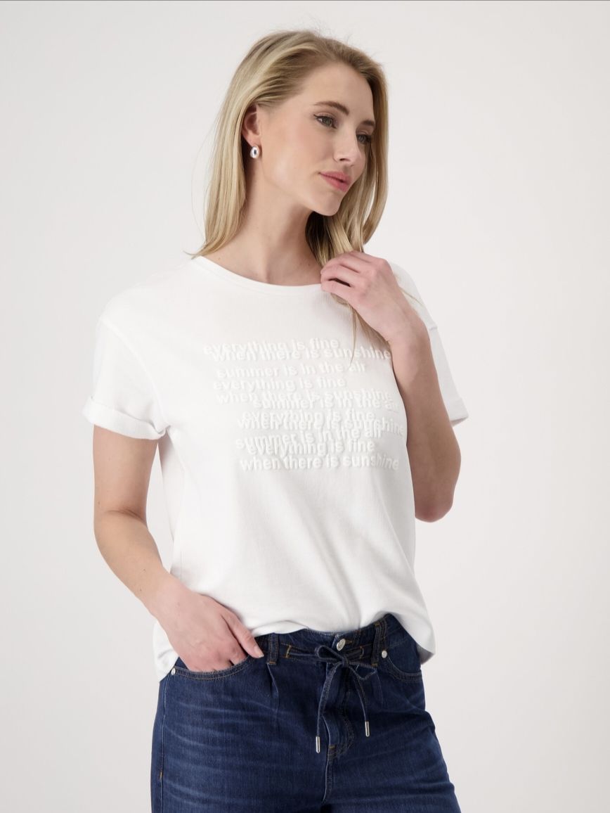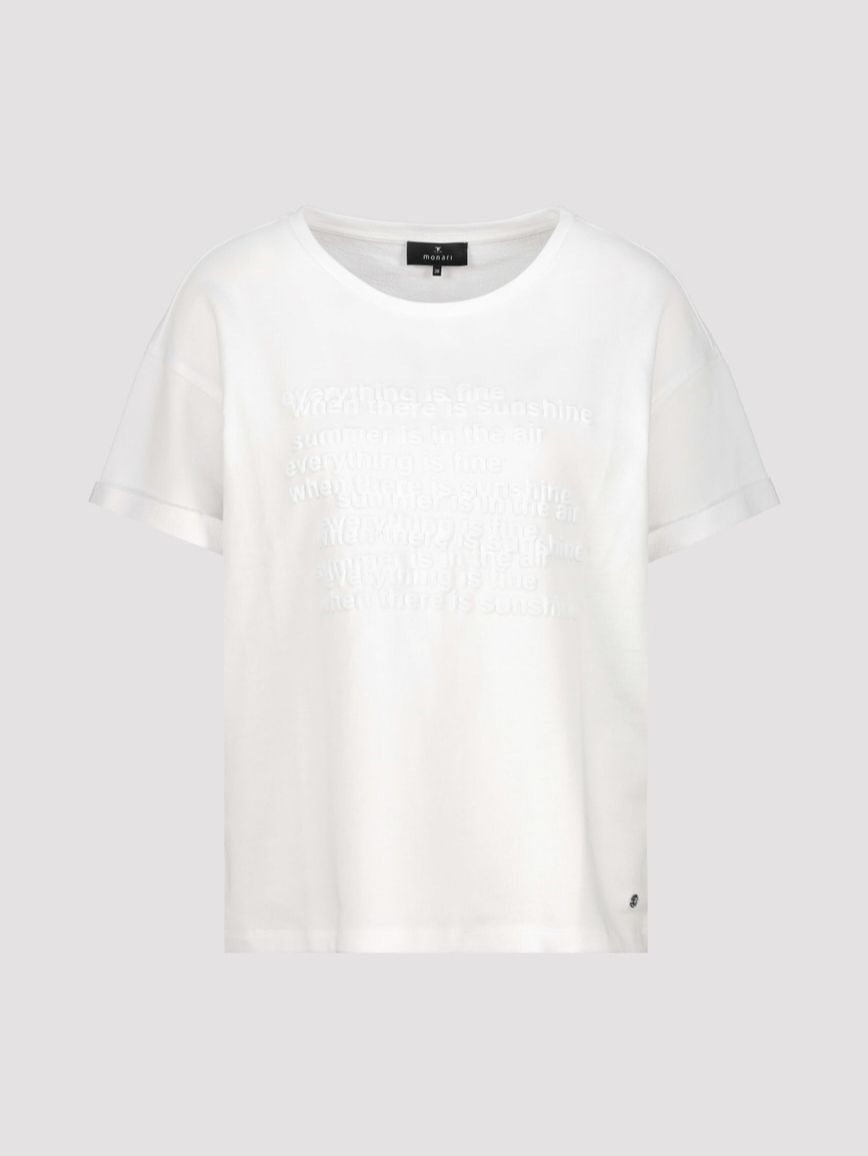 Эта уютная футболка из 100 % хлопка немецкого бренда Monari привлекает внимание надписью в тон и расширенными плечами.