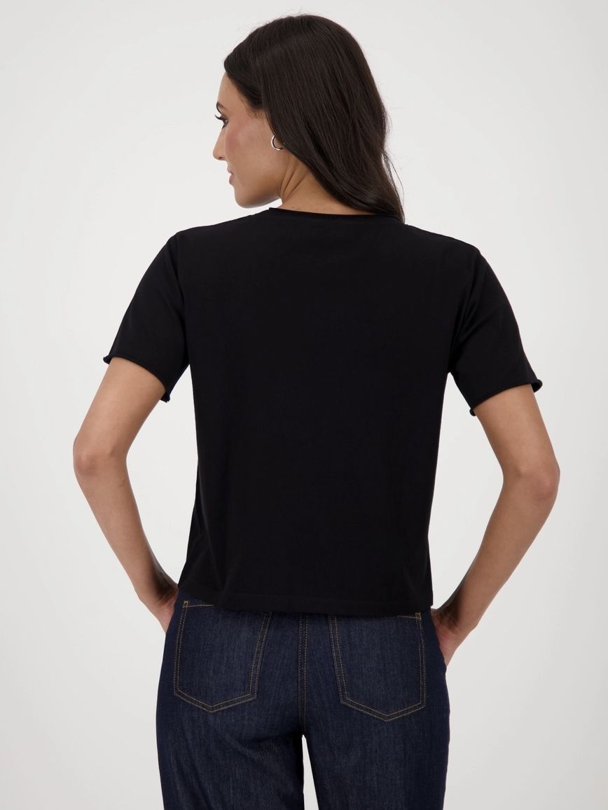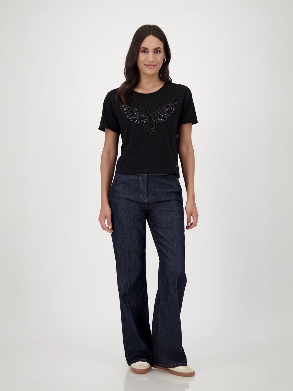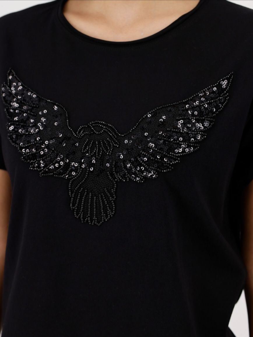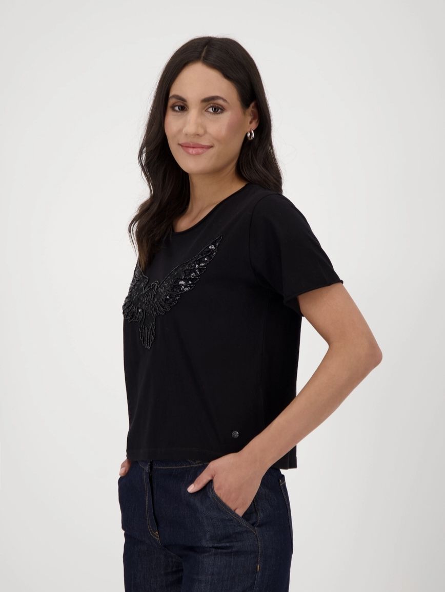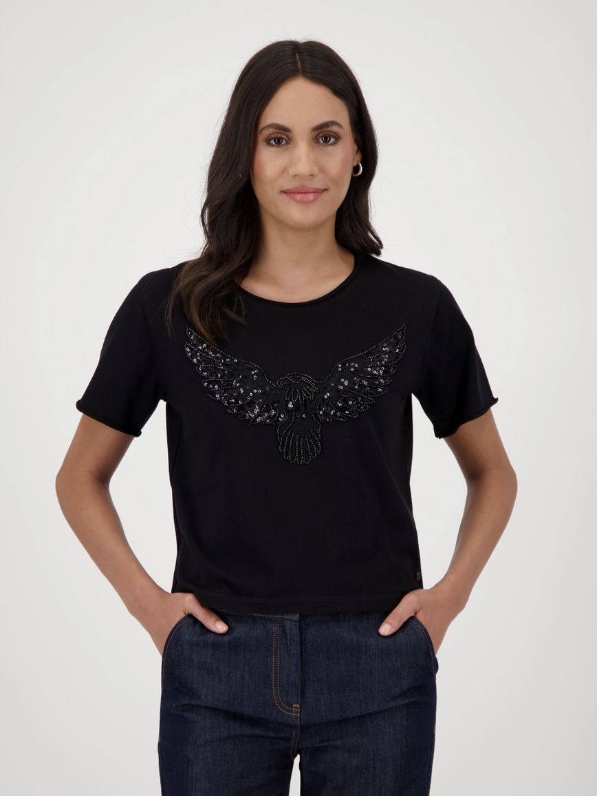 Футболка женская немецкого бренда Monari из 100 % хлопка с эффектным изображением орла, украшенная пайетками и бисером, прямого кроя.