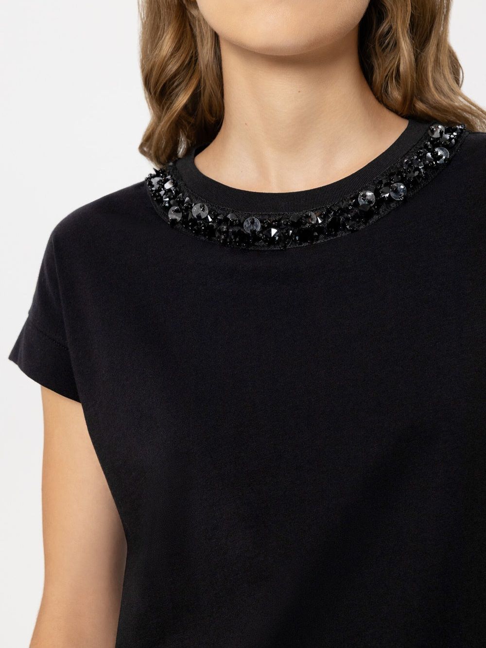 Круглый вырез в рубчик стильно украшен драгоценными камнями и пайетками.