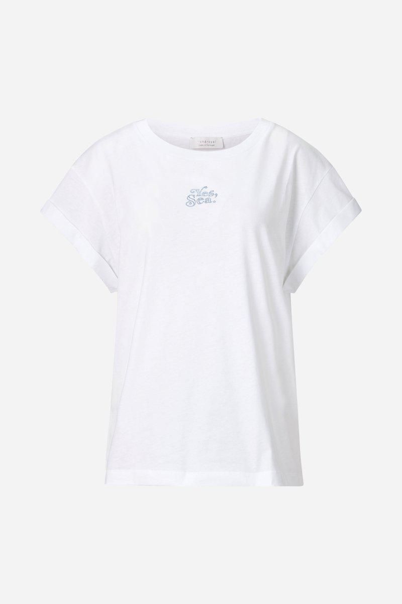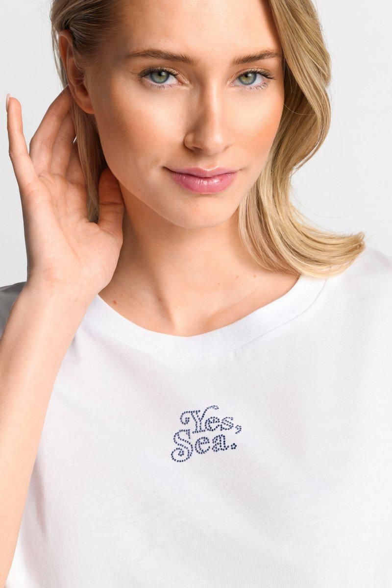 Эта белая футболка украшена изящными надписями из стразов немецкого бренда Rich&Royal.