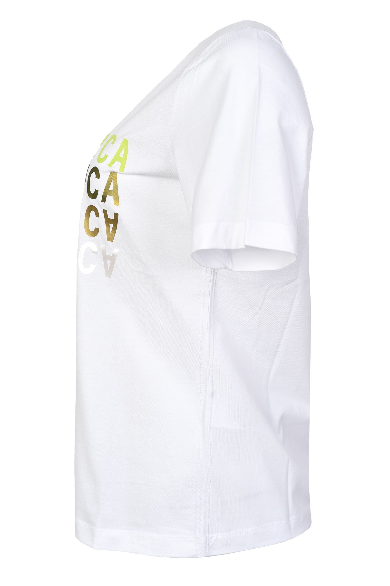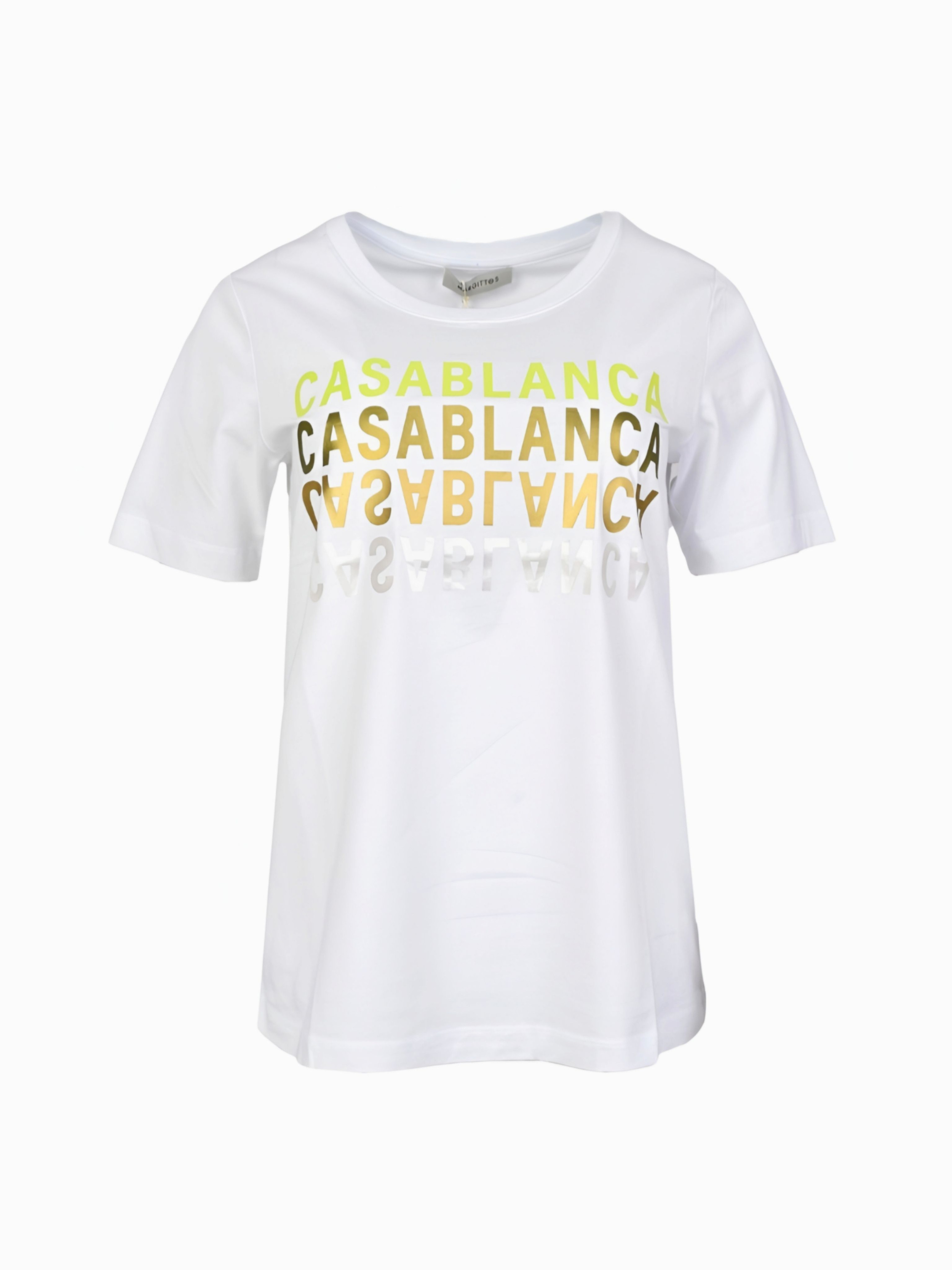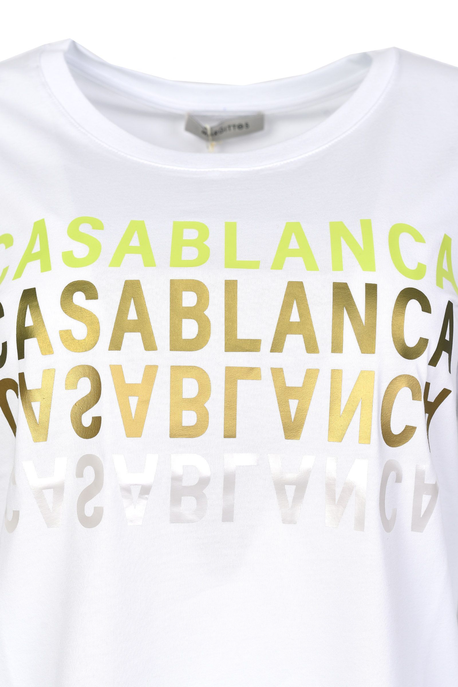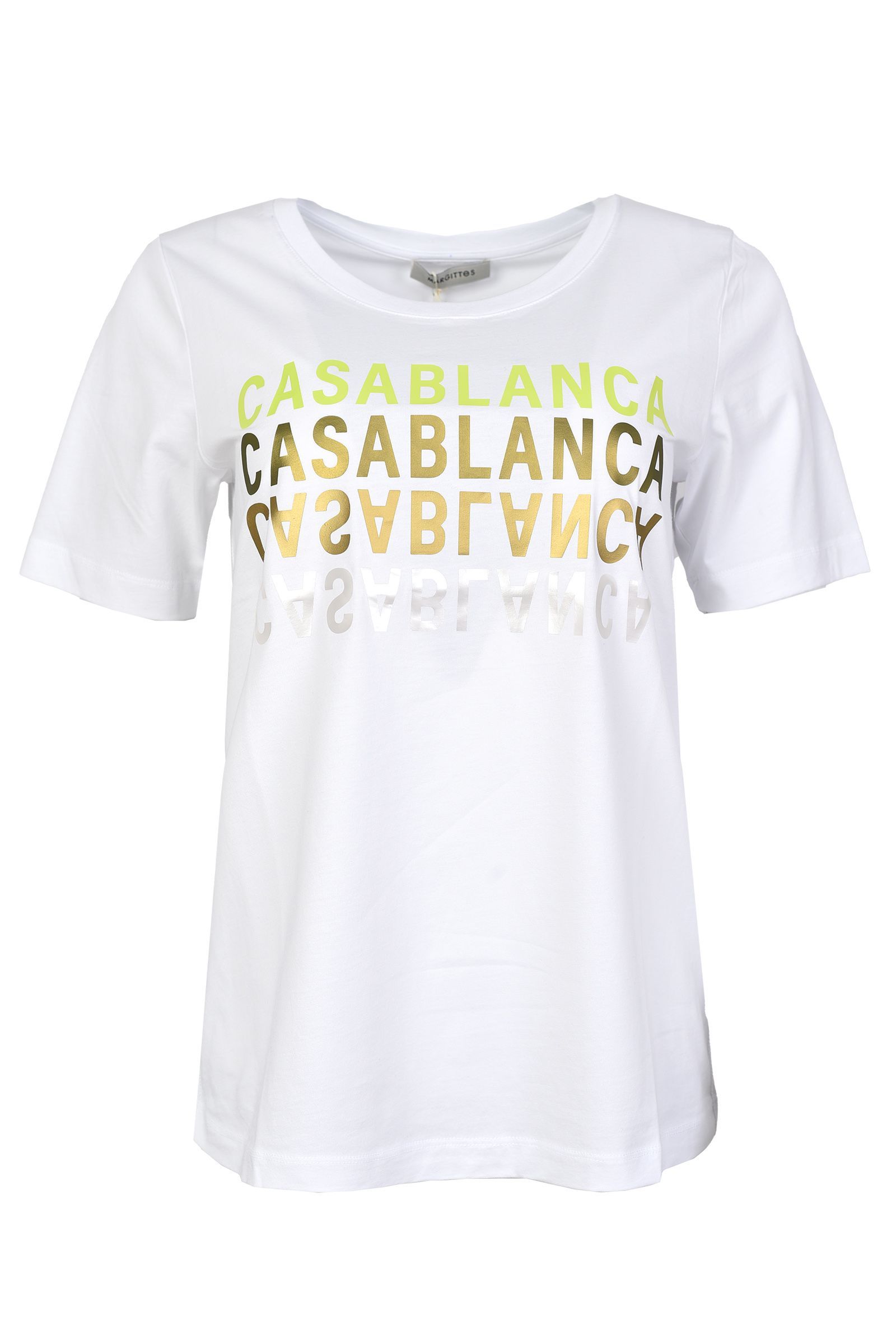 Футболка из 100% хлопка с текстовым принтом "CASABLANCA" немецкого бренда MARGITTES. Цвет: белый (10000). Бренд: MARGITTES. Страна бренда: Германия. Страна производства: Турция. Прямая модель. Круглый ворот. Средняя длина. Короткий рукав. Принт текстовый на груди. Состав: 100% хлопок. .Уход: Деликатная стирка при 30 градусах жидким моющим средством. Не отбеливать. Не сушить в сушильной машине. Гладить на минимальном температурном режиме. Разрешена только щадящая чистка. Стирать отдельно, вывернув наизнанку, мягким моющим средством.